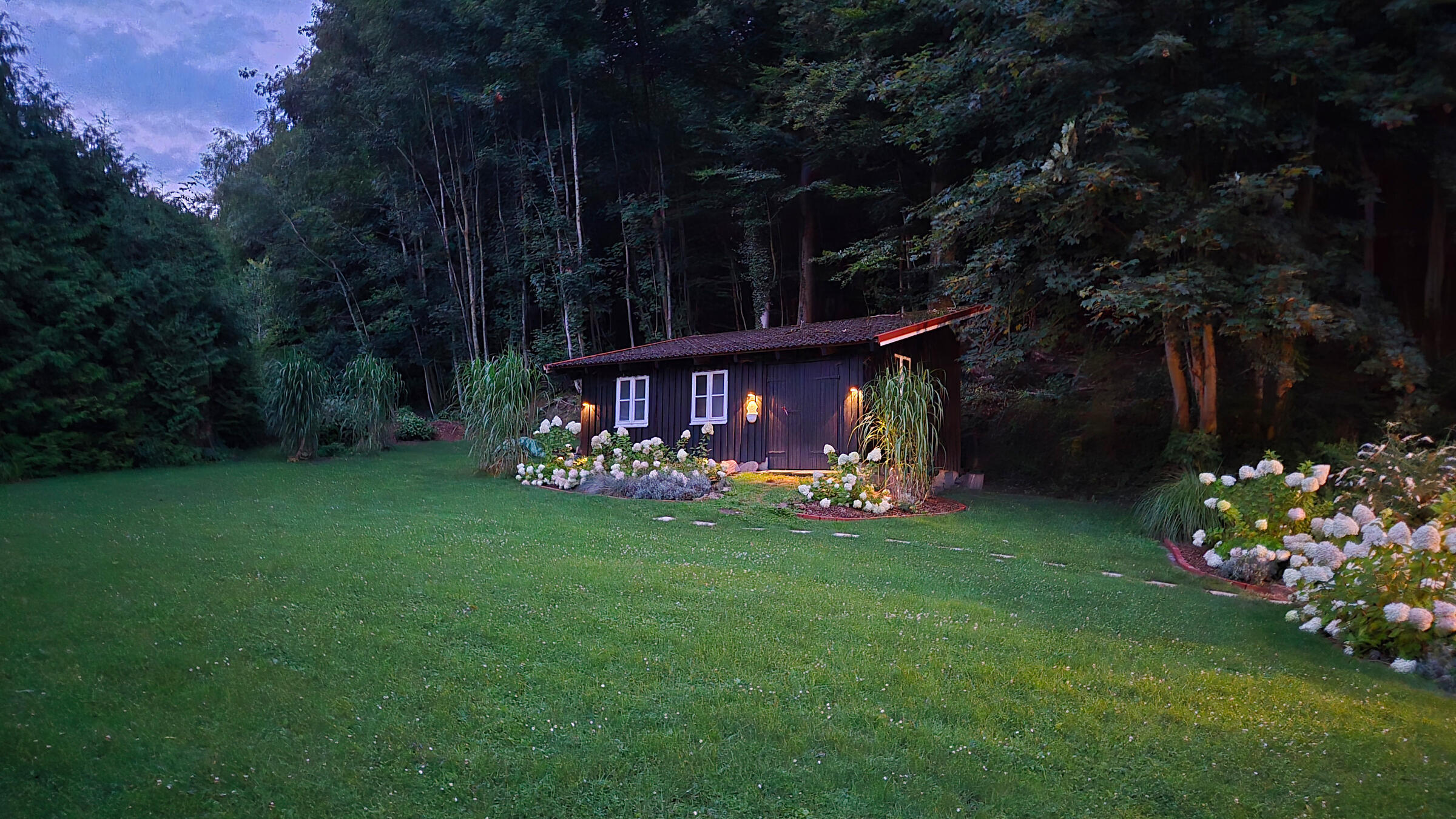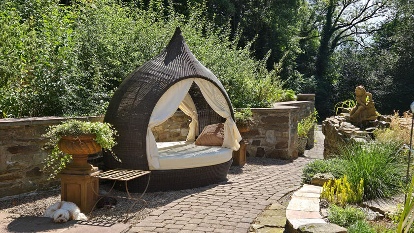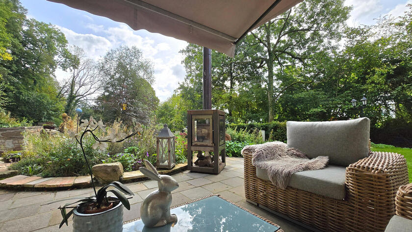 Mehrere Terrassen laden zum Drehen in wechselndem Licht ein: Glasüberdachte Sitzplätze, Naturstein-Innenhof, Kiesterrasse, Außenkamine, Outdoorküche und Jacuzzi. Natursteinstufen führen direkt zum Bachlauf, der das Grundstück sanft begleitet und eine besondere Klang- und Bildkulisse schafft.