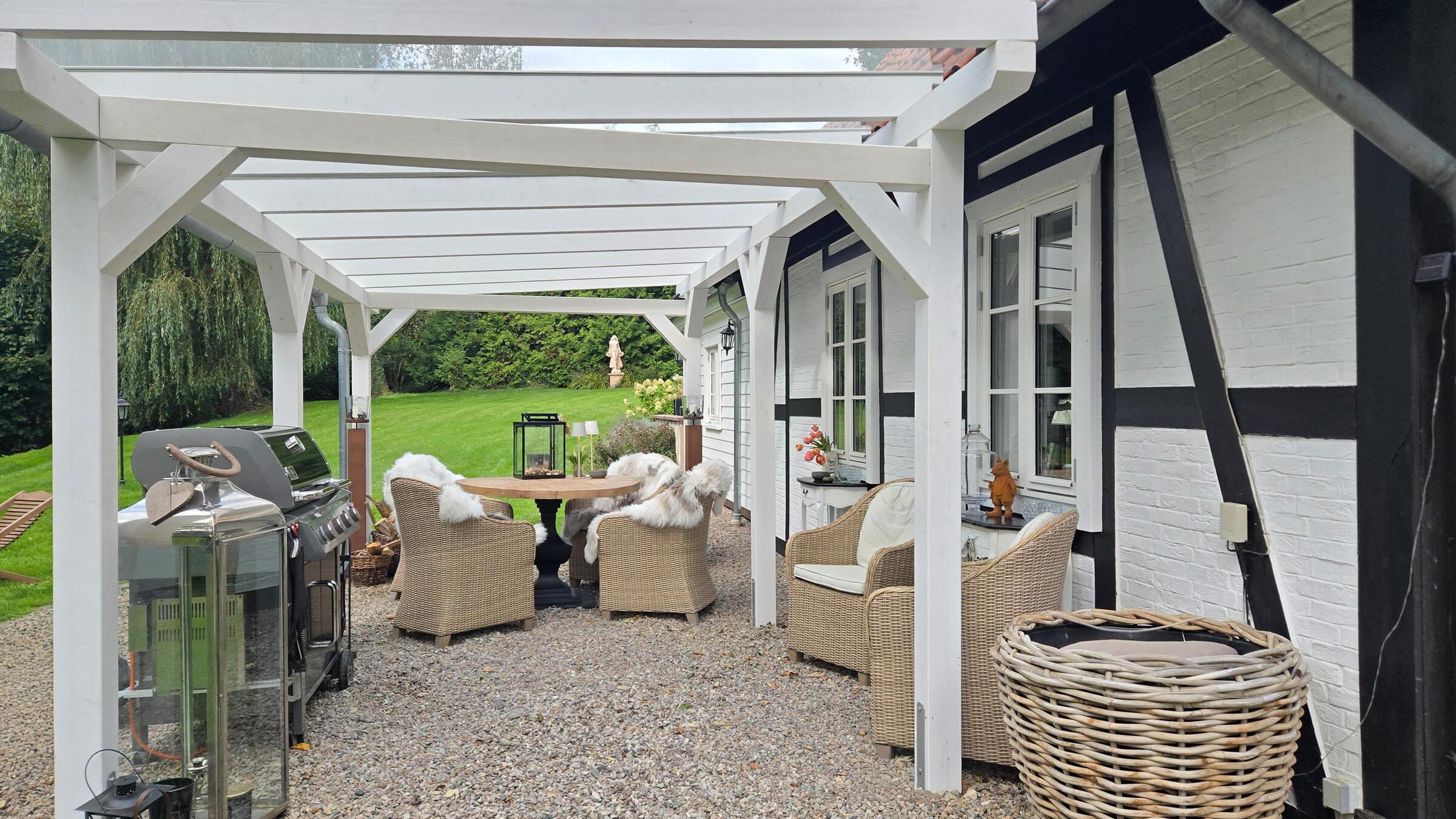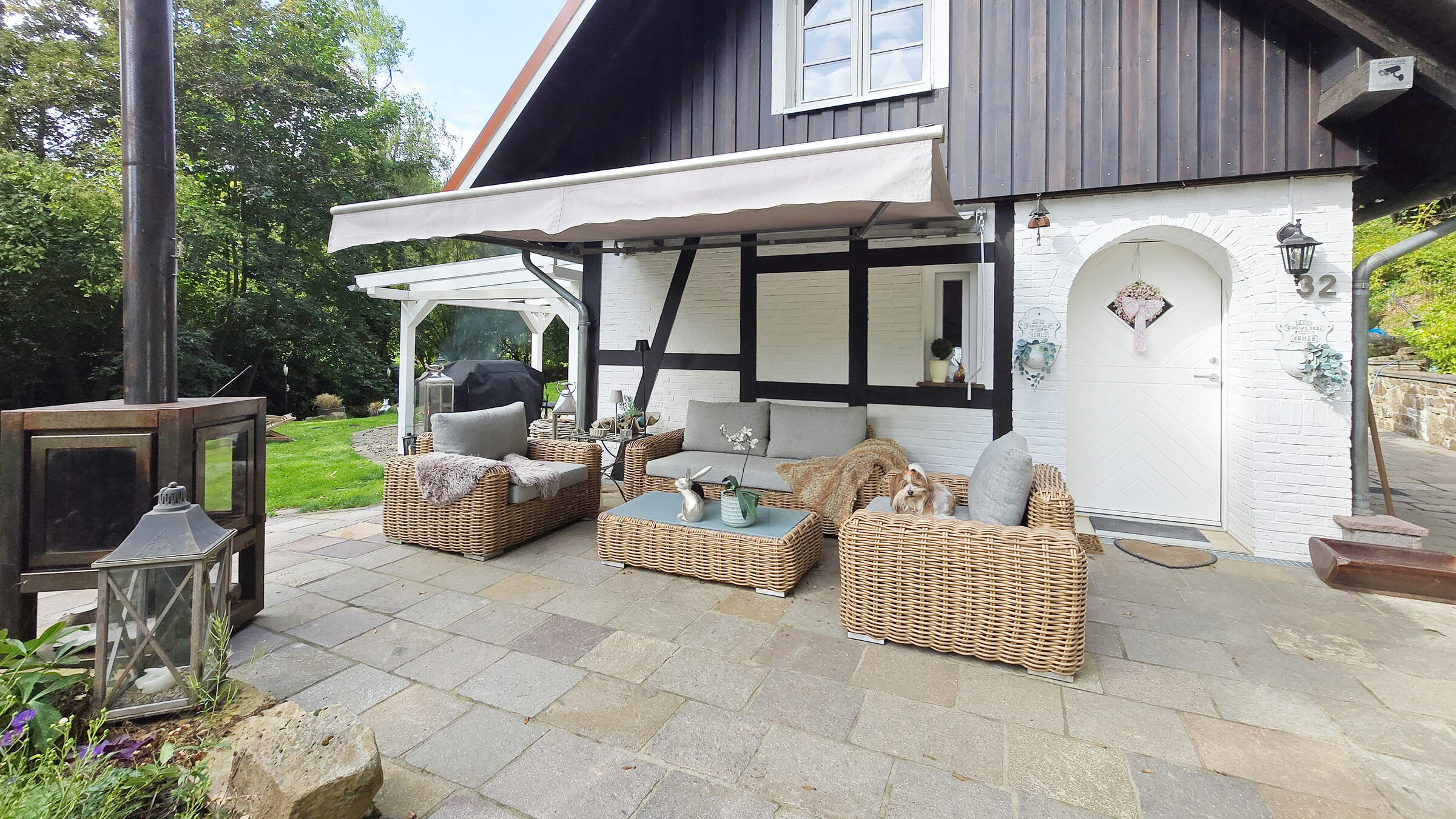 Das weiße Haus mit Fachwerkfassade verbindet moderne Eleganz mit ländlicher Geborgenheit: lichtdurchflutete Räume, Natursteinböden, klare Linien, warme Materialien. Ein Pelletofen sorgt für Kaminatmosphäre, der offene Dachraum mit Einbauschränken schafft Weite und Ruhe.