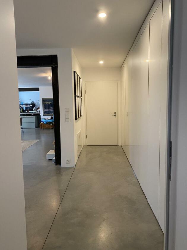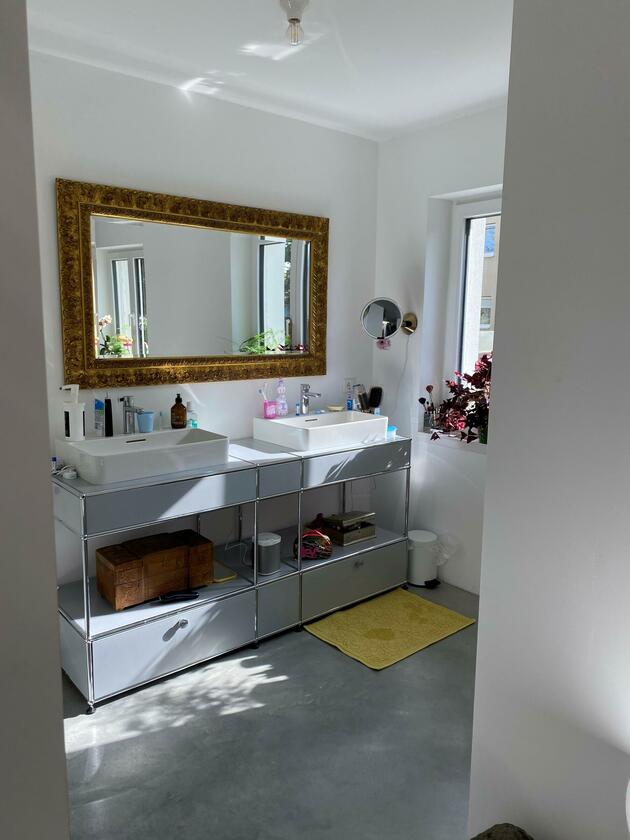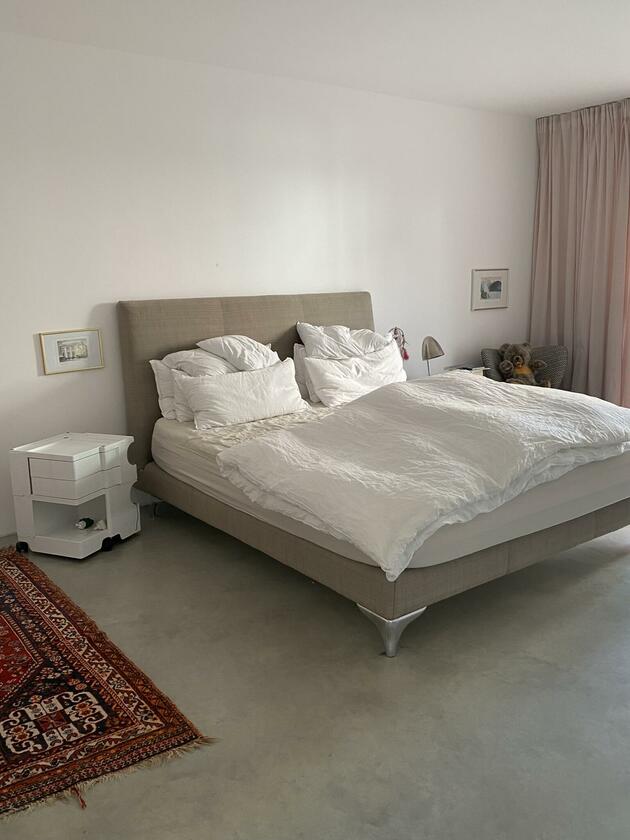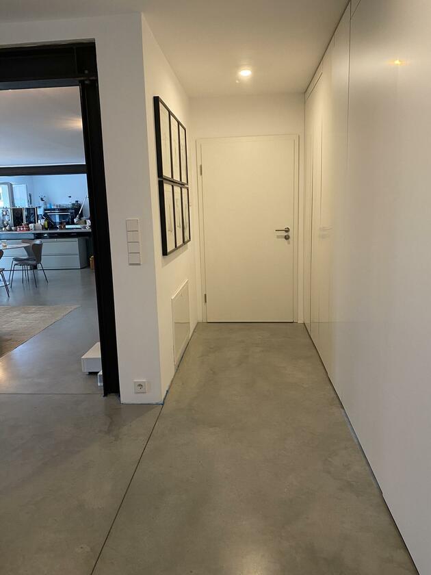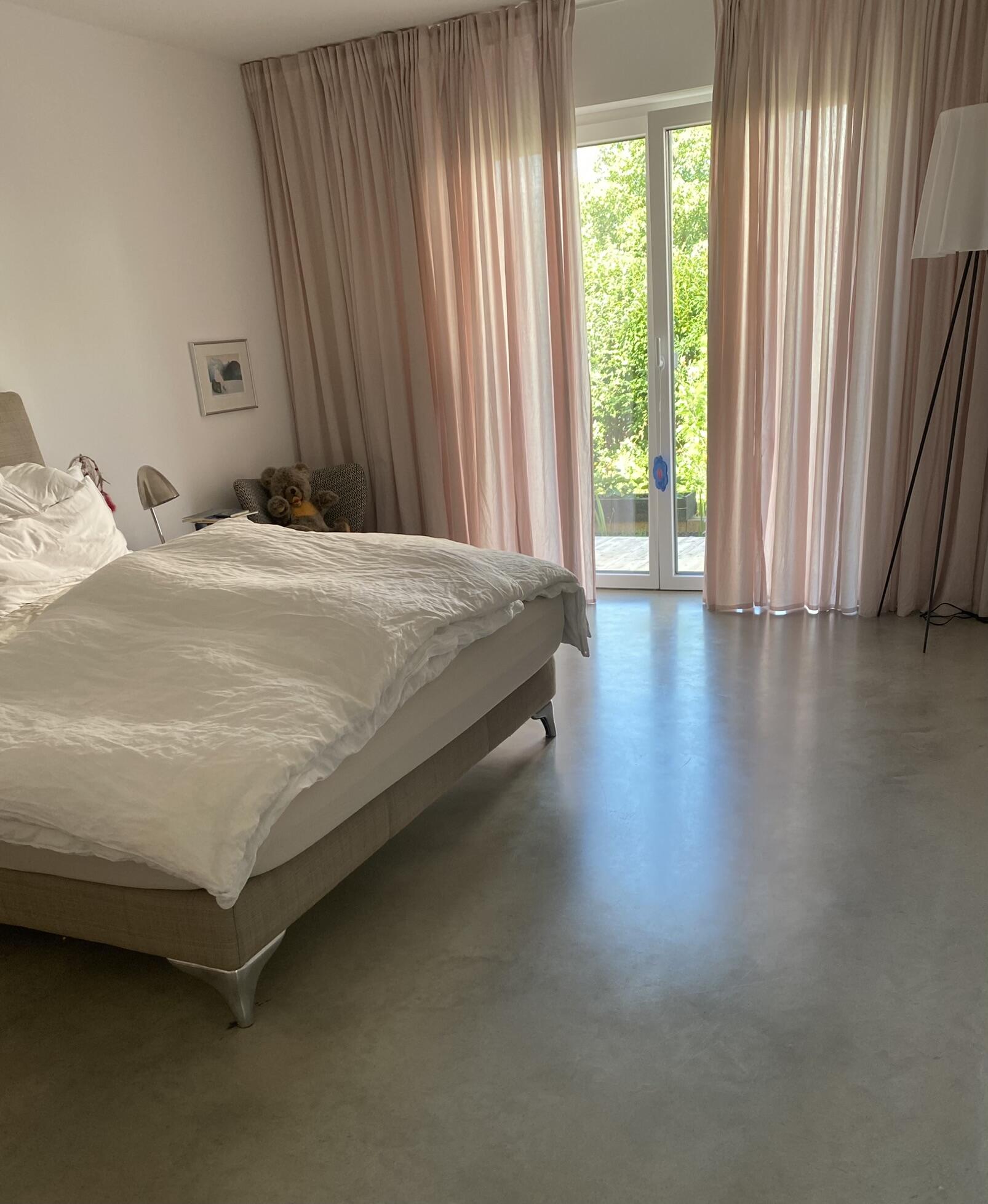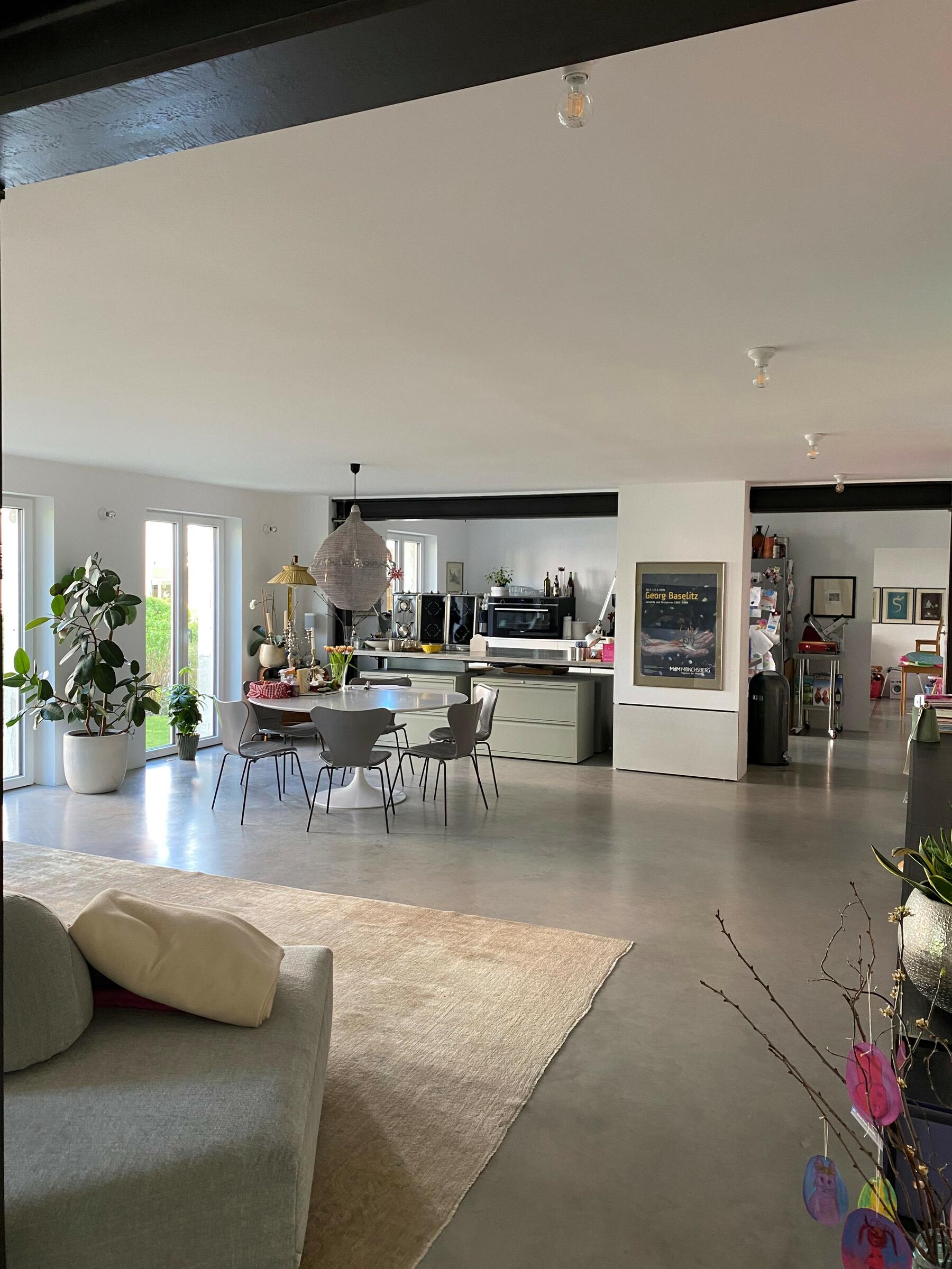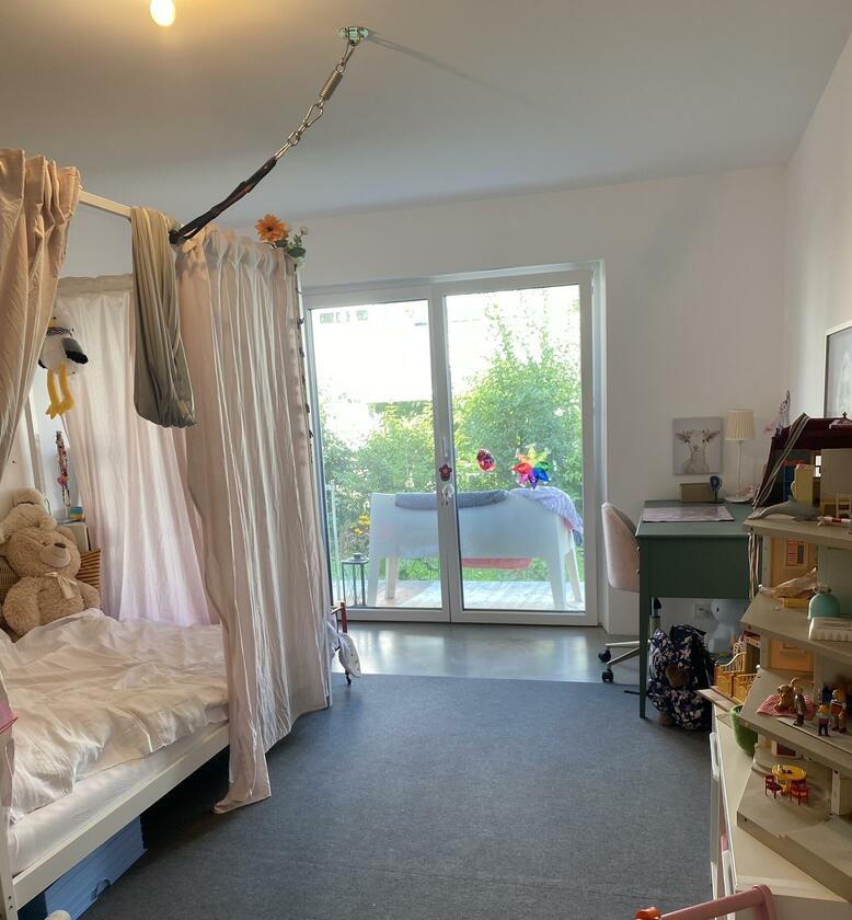 Die Wohnung befindet sich Hochparterre in einem Mehrparteienhaus in ruhiger und ländlicher Umgebung. Die Räume sind hell und zeitgemäß ausgestattet und möbliert. Stahlträger und Sichtestrich verleihen dem Wohnbereich einen loftartigen Charakter. Die offene Küche schließt direkt an den Wohn- und Essbereich an. Die Fenster der der Schlafzimmer, des Kinderzimmers und des Arbeitszimmers können mit Rollläden abgedunkelt werden. Nach vorheriger Absprache dürfen die Räume umgestaltet werden. Parkplätze bestehen direkt vor dem Haus und an der vorbeiführenden und wenig befahrenen Straße.