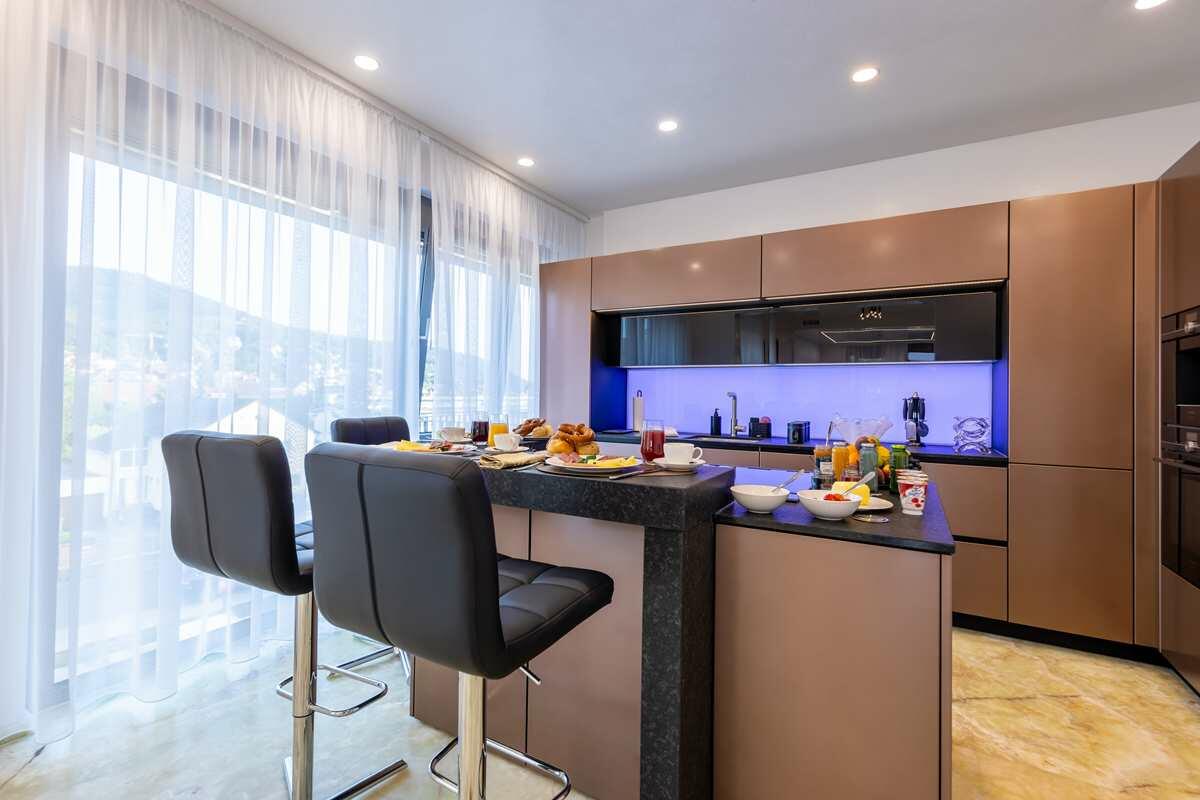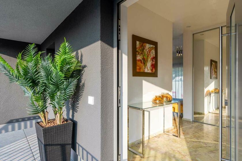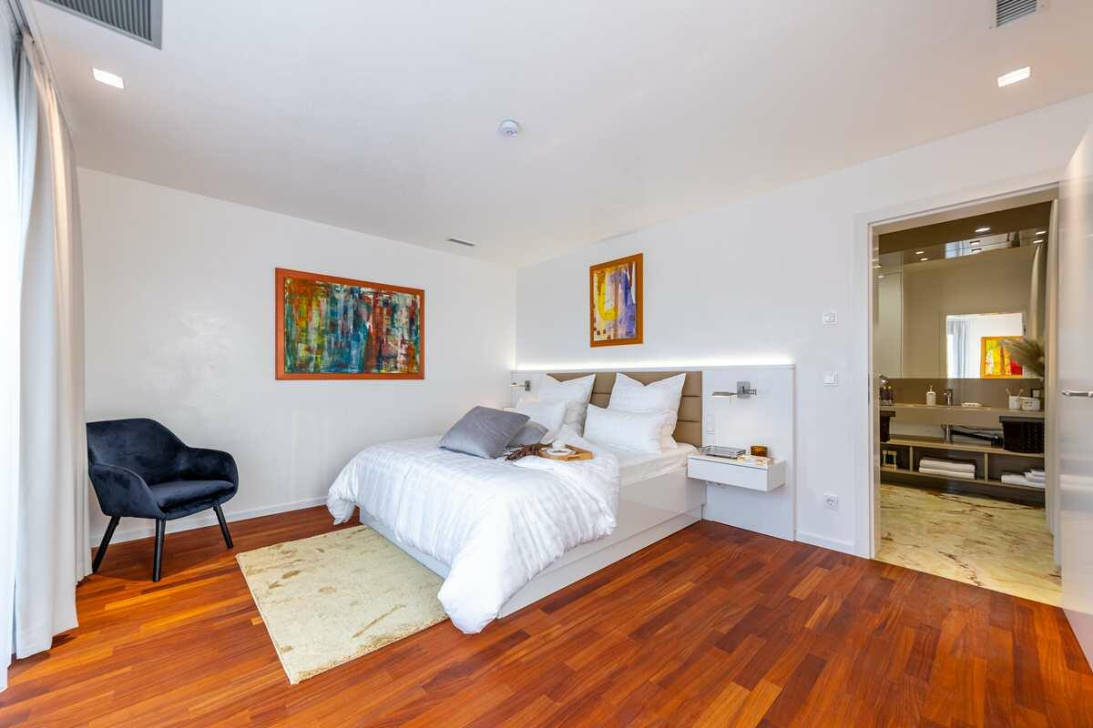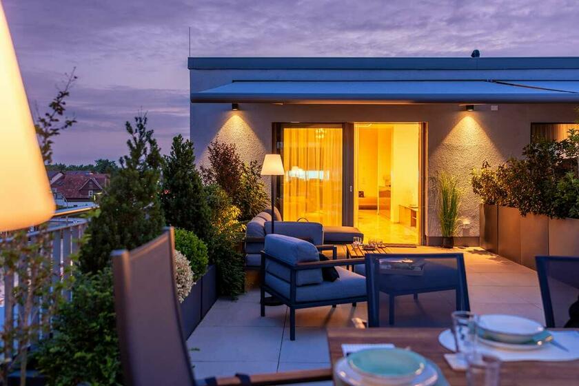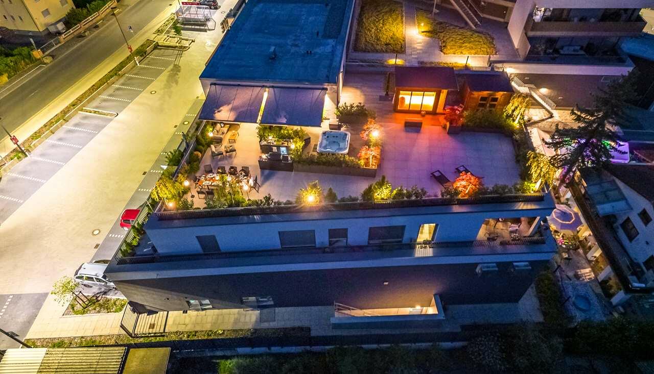 Die luxuriös eingerichtete 2-Zimmer Penthouse-Wohnung bietet 120 m² Innenfläche und eine 300 m² große Dachterrasse. Die Wohnung befindet sich im obersten Stock eines modernen Wohn- und Geschäftshauses und ist mit einem Aufzug erreichbar. Die bodentiefen Fenster lassen viel Sonnenlicht in die Räume. Die großen Fensterfronten im Wohn- und Küchenbereich und im Schlafzimmer sind mit elektrischen Raffstores abdunkelbar. Die Böden sind mit italienischem Marmorboden und Parkett ausgelegt, die Innenwände und Decken mit glattem, weißen Marmorino verputzt. Die offene und modern ausgestattete Küche bietet einen kleinen Barbereich und schließt an den Wohnbereich an. Die nach Süden ausgerichtete Terrasse ist teilweise mit Markisen überdacht und nicht einsehbar. Die Terrasse bietet eine Außenküche, einen Jacuzzi sowie eine Sauna mit vollflächiger Glasfront und Outdoor-Dusche.
