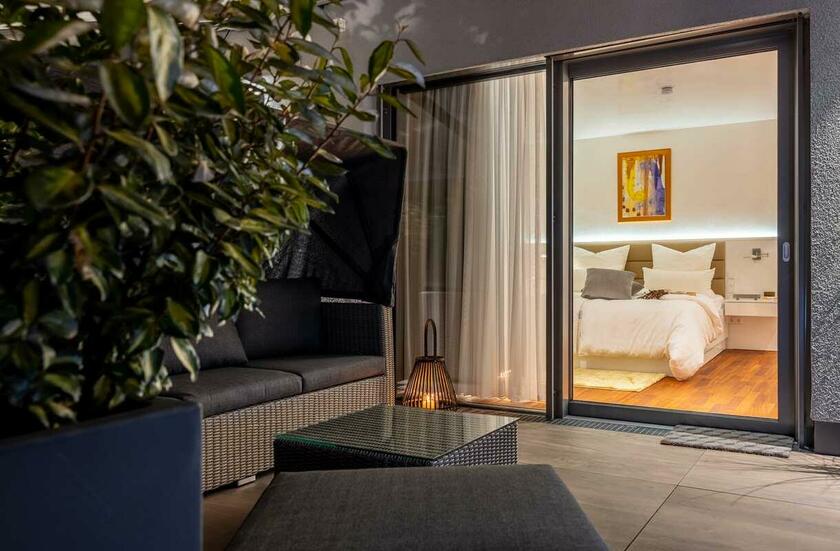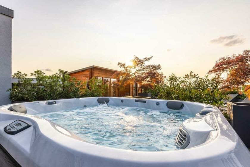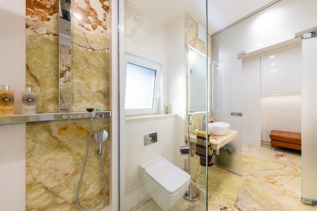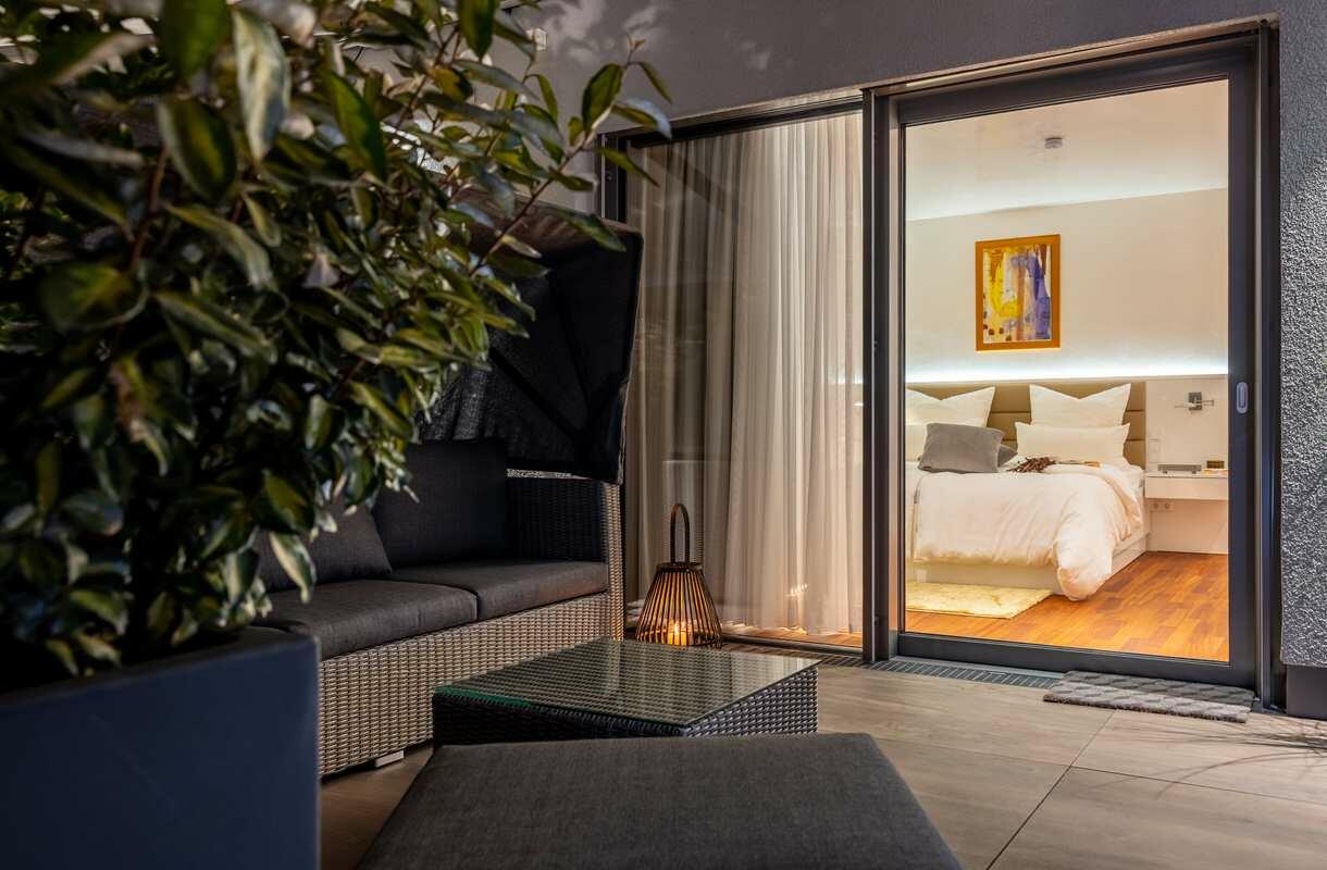 Die luxuriös eingerichtete 2-Zimmer Penthouse-Wohnung bietet 120 m² Innenfläche und eine 300 m² große Dachterrasse. Die Wohnung befindet sich im obersten Stock eines modernen Wohn- und Geschäftshauses und ist mit einem Aufzug erreichbar. Die bodentiefen Fenster lassen viel Sonnenlicht in die Räume. Die großen Fensterfronten im Wohn- und Küchenbereich und im Schlafzimmer sind mit elektrischen Raffstores abdunkelbar. Die Böden sind mit italienischem Marmorboden und Parkett ausgelegt, die Innenwände und Decken mit glattem, weißen Marmorino verputzt. Die offene und modern ausgestattete Küche bietet einen kleinen Barbereich und schließt an den Wohnbereich an. Die nach Süden ausgerichtete Terrasse ist teilweise mit Markisen überdacht und nicht einsehbar. Die Terrasse bietet eine Außenküche, einen Jacuzzi sowie eine Sauna mit vollflächiger Glasfront und Outdoor-Dusche.