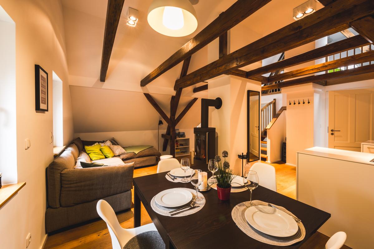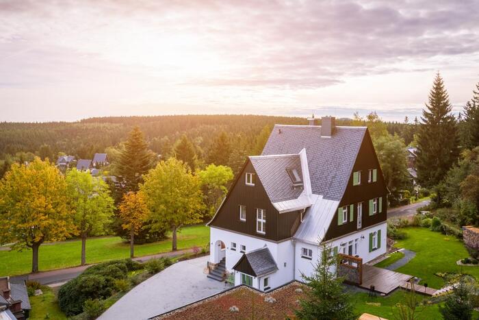 Die denkmalgeschützte ehemalige Fabrikantenvilla befindet sich in ländlicher Umgebung im Osterzgebirge. Die Ausstattung ist hochwertig und entspricht modernsten Anforderungen. Parkettböden und Kamine und die voll ausgestatteten Wohnküchen gehören zu den abgeschlossenen Wohnbereichen im Erdgeschoß, Obergeschoß und im Dachgeschoß. Der großzügige Wohnbereich mit dem gemütlichen Kamin grenzt an den offen gestalteten, modernen Koch- und Essbereich. Das bezaubernde Appartement unter dem Dach verfügt über eine offene Galerie, zwei getrennte Schlafzimmer und eine gemütliche, moderne Wohnküche. Ein Kamin und eine großzügige Wellnessdusche komplettieren die Ausstattung. Im Untergeschoss des Hauses befinden sich eine Sauna mit Ruheraum und ein kleiner Fitnessbereich.