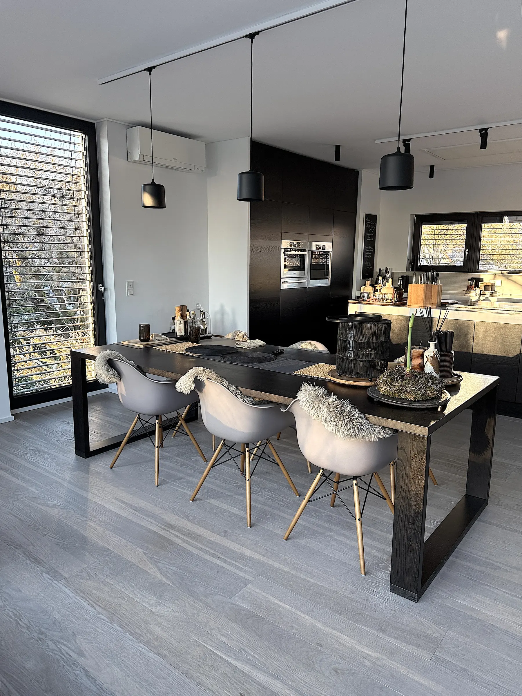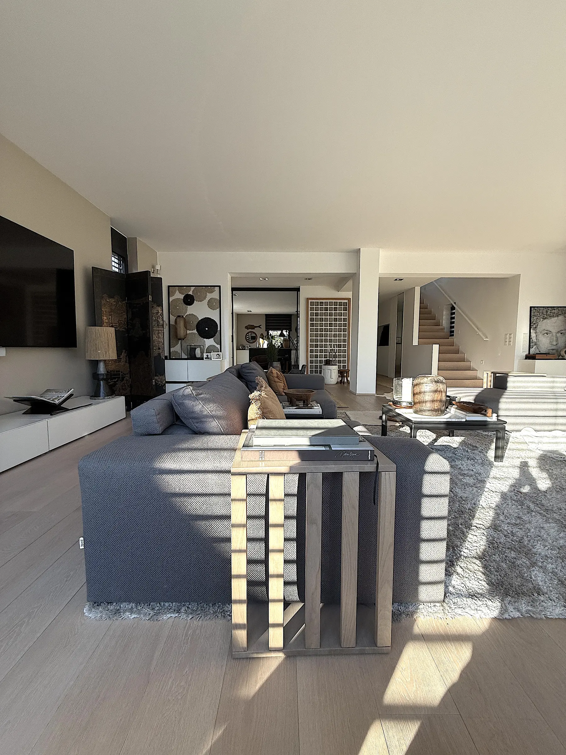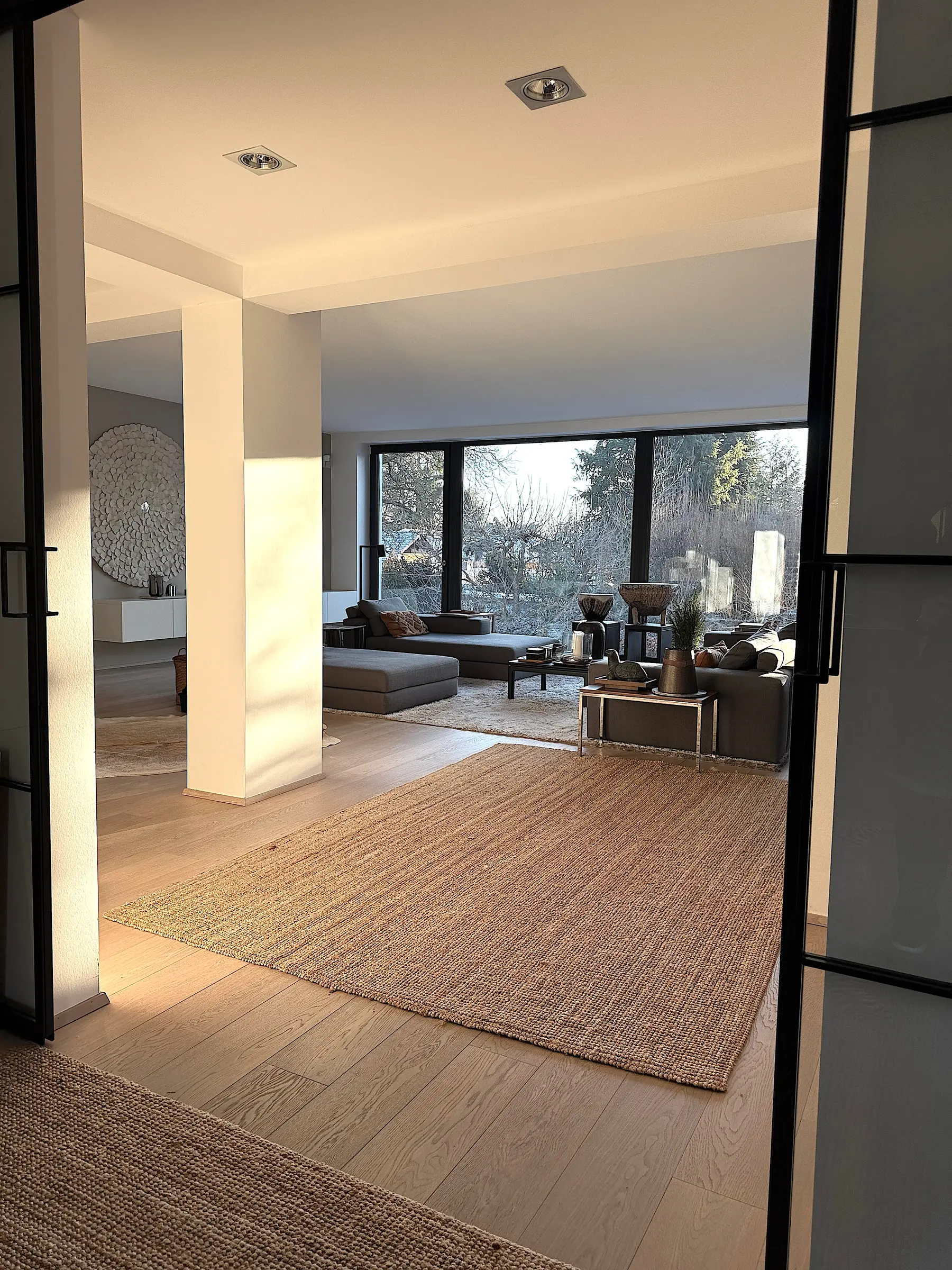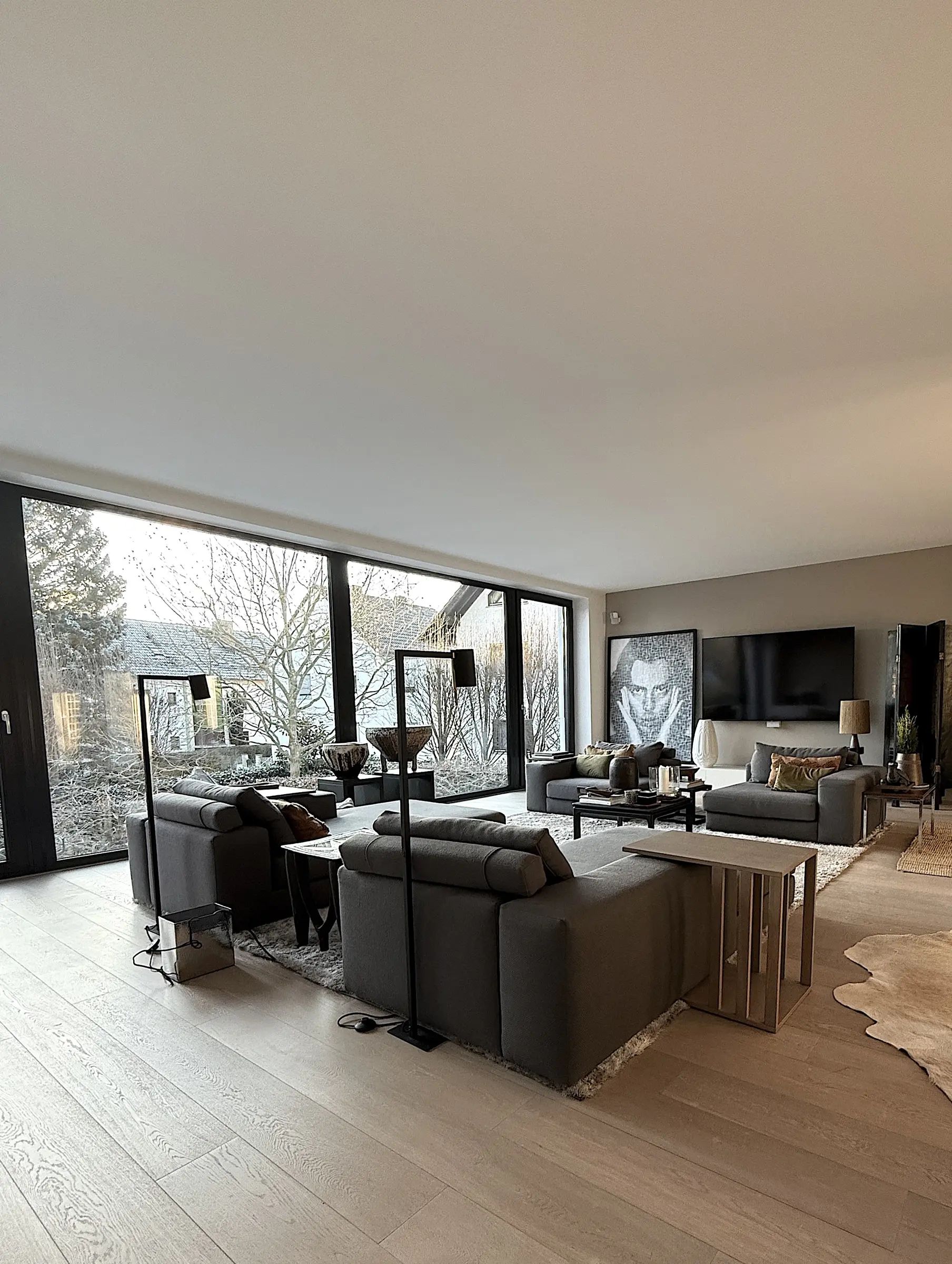 Unser moderner Neubau verbindet klare Architektur mit einer kuratierten Mischung aus Vintage-Designklassikern, zeitgenössischer Kunst und ausgewählten Ethno-Objekten. Die reduzierte, natürliche Farbwelt sowie die großen Fensterflächen schaffen eine ruhige, lichtdurchflutete Atmosphäre mit hoher räumlicher Tiefe. Das Haus verfügt über offene, ineinander übergehende Wohnbereiche mit großzügigem Wohn- und Essbereich, moderner Designküche, atelierartigem Arbeitsraum mit Glaswand sowie markanter Architektur mit Galerie- und Blickachsen zwischen den Ebenen. Alle Räume sind klar strukturiert und gut ausleuchtbar. Alle Fenster sind mit elektrischen Jalousien oder Rollos ausgestattet und können vollständig abgedunkelt werden. Die nach Süd-Osten ausgerichteten bodentiefen Fensterfronten im Wohnzimmer sowie im Küchen- und Essbereich erstrecken sich über die gesamte Hausbreite. An den Küchen- und Essbereich schließt eine große Dachterrasse an. Das Haus befindet sich in einer ruhigen Wohngegend in Bad Homburg mit sehr guter Erreichbarkeit von Frankfurt am Main. Vor dem Haus stehen öffentliche Parkplätze zur Verfügung. Zusätzlich verfügt das Objekt über eine Garage sowie einen privaten Stellplatz.