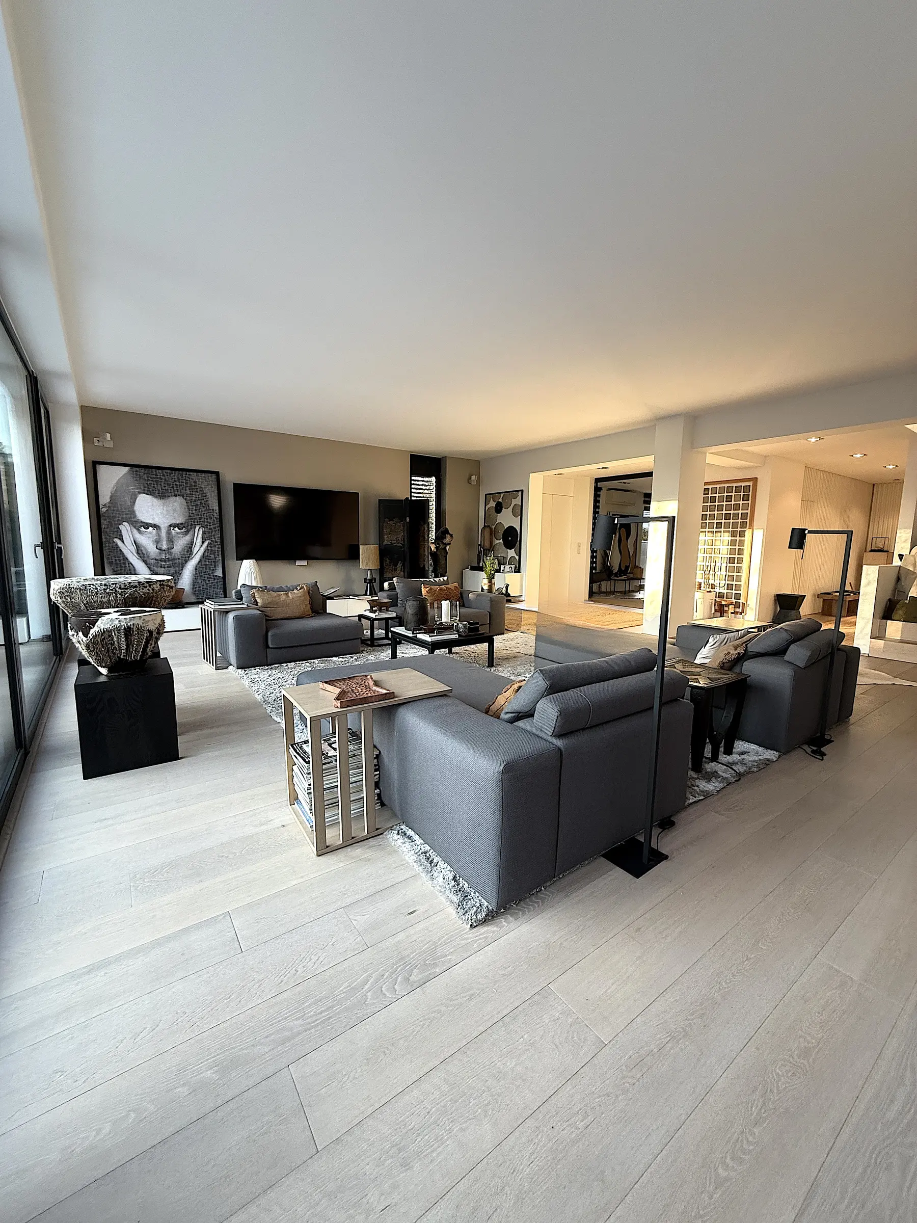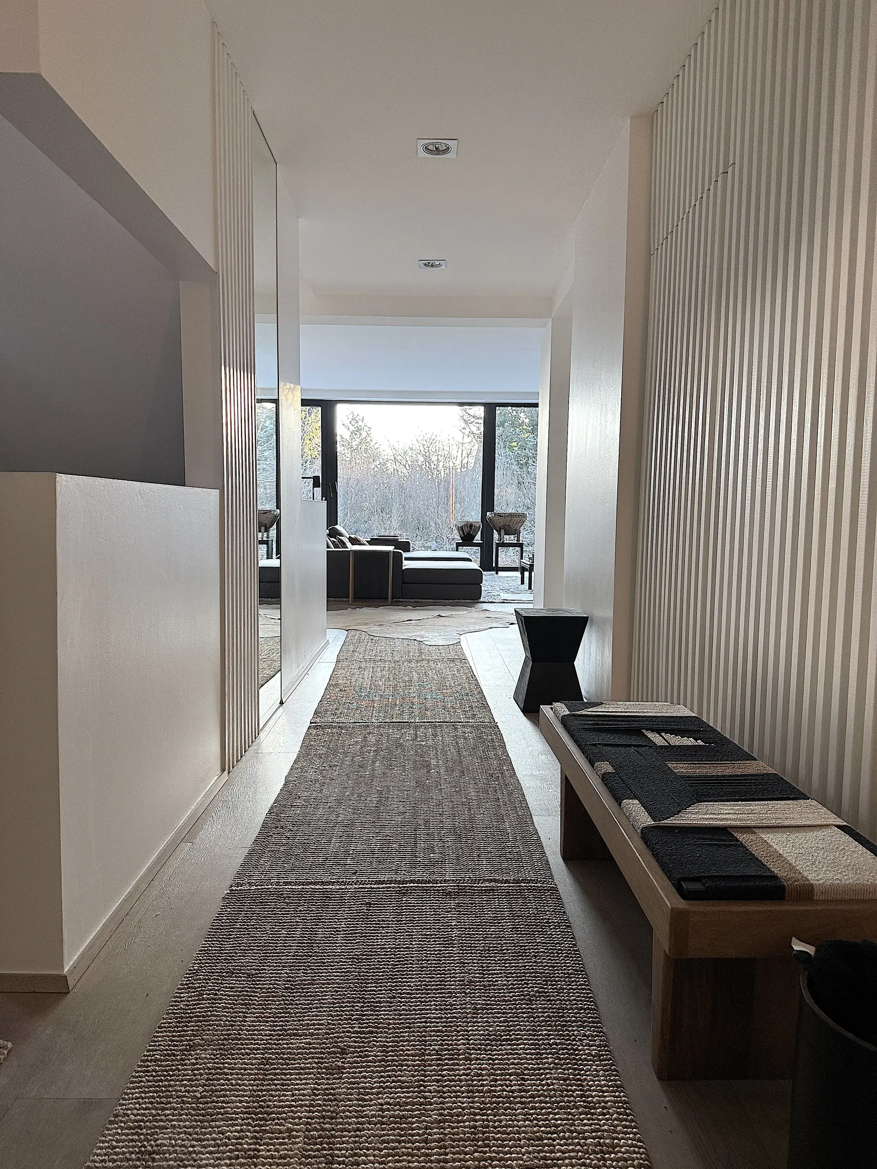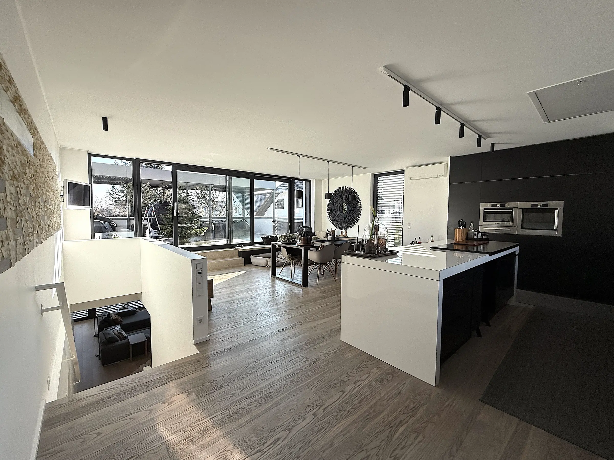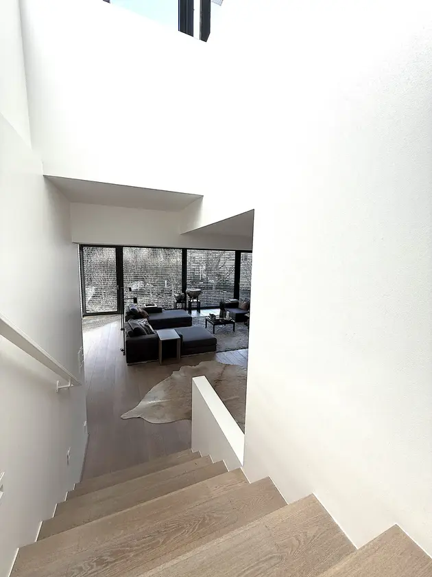 Unser moderner Neubau verbindet klare Architektur mit einer kuratierten Mischung aus Vintage-Designklassikern, zeitgenössischer Kunst und ausgewählten Ethno-Objekten. Die reduzierte, natürliche Farbwelt sowie die großen Fensterflächen schaffen eine ruhige, lichtdurchflutete Atmosphäre mit hoher räumlicher Tiefe. Das Haus verfügt über offene, ineinander übergehende Wohnbereiche mit großzügigem Wohn- und Essbereich, moderner Designküche, atelierartigem Arbeitsraum mit Glaswand sowie markanter Architektur mit Galerie- und Blickachsen zwischen den Ebenen. Alle Räume sind klar strukturiert und gut ausleuchtbar. Alle Fenster sind mit elektrischen Jalousien oder Rollos ausgestattet und können vollständig abgedunkelt werden. Die nach Süd-Osten ausgerichteten bodentiefen Fensterfronten im Wohnzimmer sowie im Küchen- und Essbereich erstrecken sich über die gesamte Hausbreite. An den Küchen- und Essbereich schließt eine große Dachterrasse an. Das Haus befindet sich in einer ruhigen Wohngegend in Bad Homburg mit sehr guter Erreichbarkeit von Frankfurt am Main. Vor dem Haus stehen öffentliche Parkplätze zur Verfügung. Zusätzlich verfügt das Objekt über eine Garage sowie einen privaten Stellplatz.