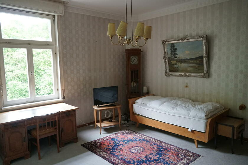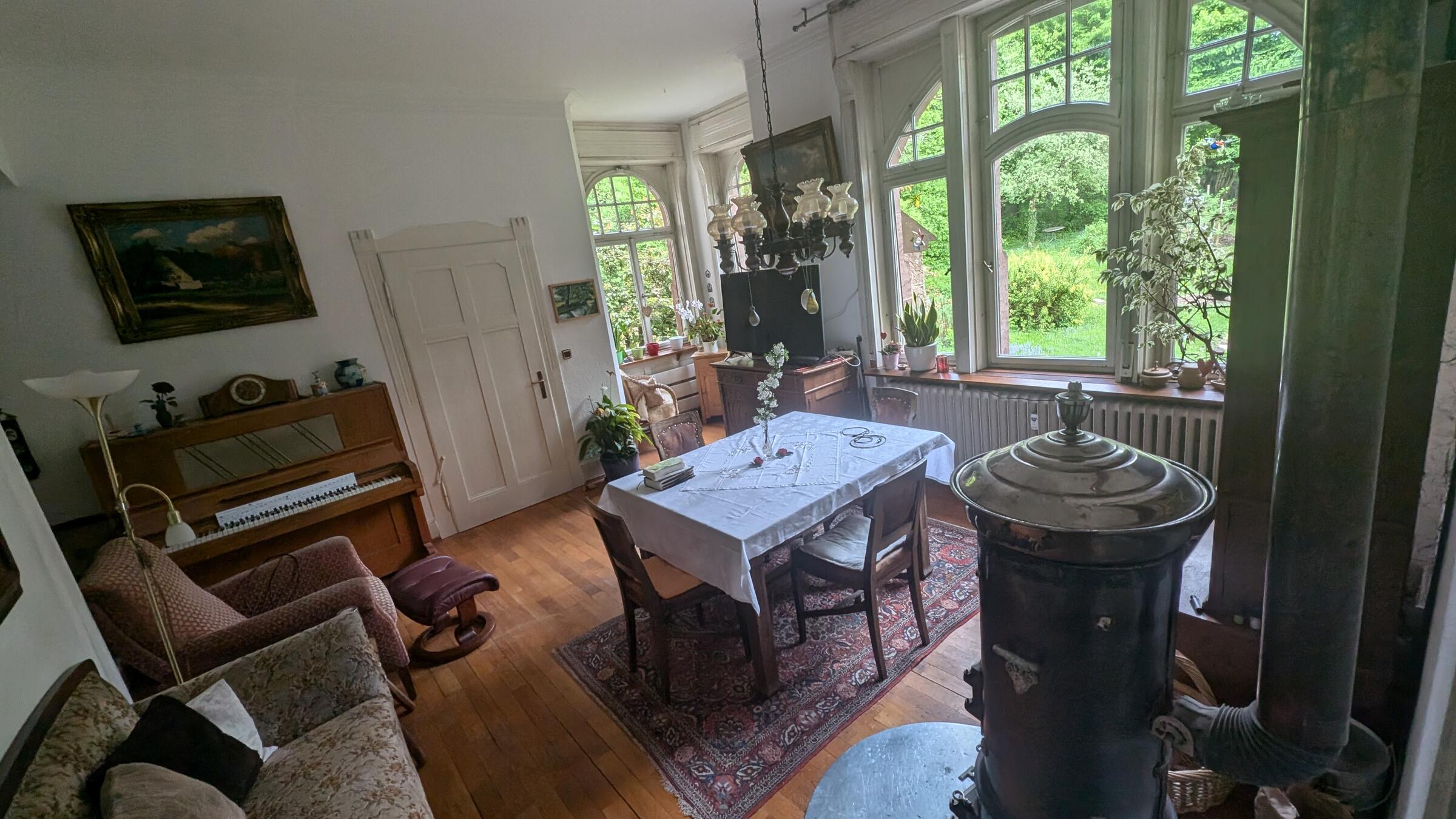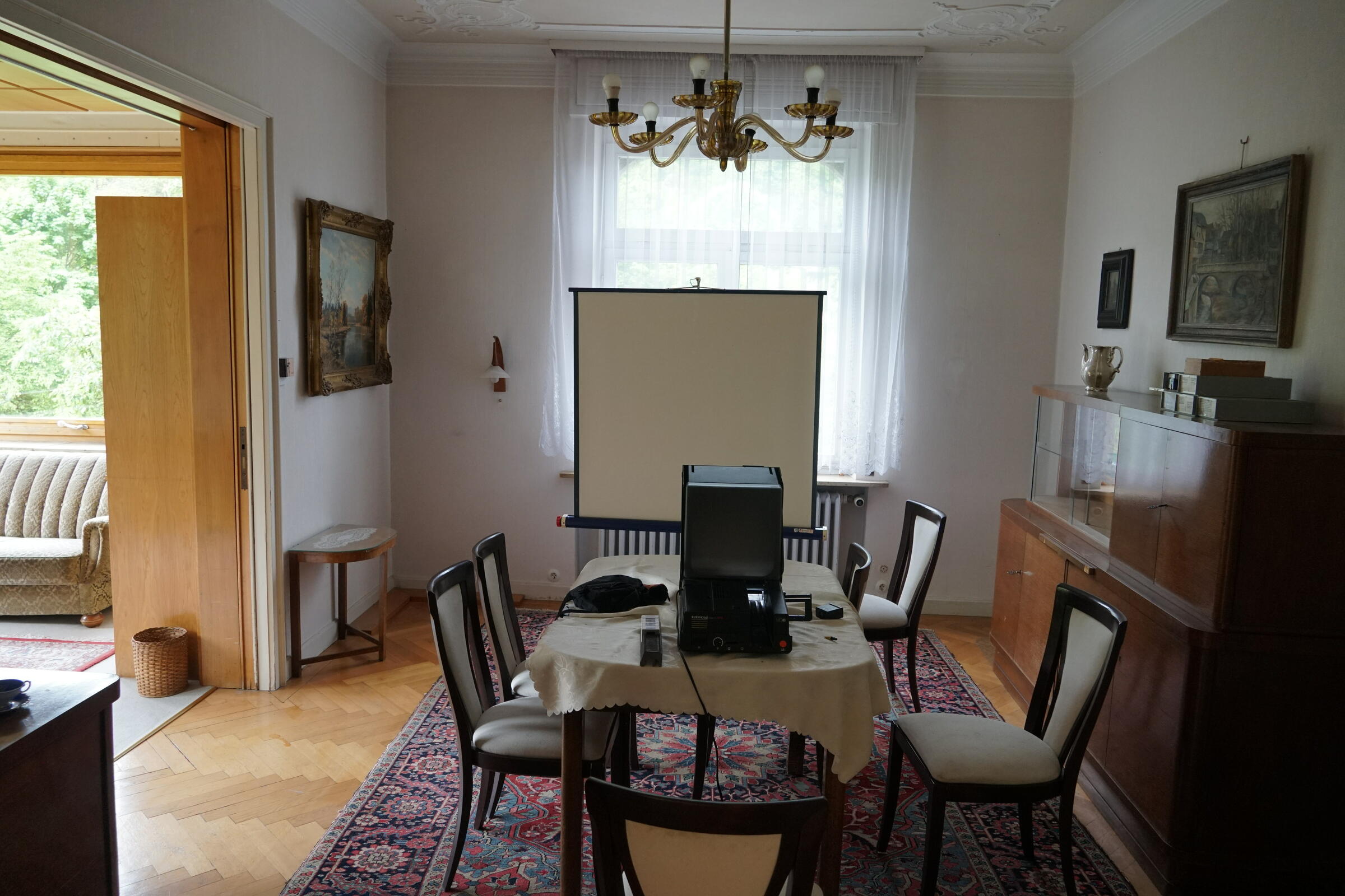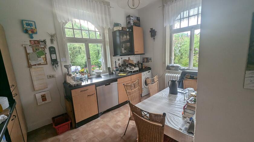 Die Wohnung befindet sich einer mehr als 100 Jahre alten Jugendstilvilla, in der mittleren Etage. Die Räume bieten hohe Decken und sind möbliert. Auf den Böden der Wohnräume ist Parkett verlegt. Das Badezimmer ist gefliest. Die meisten Fenster können mit Hilfe von Vorhängen verdunkelt werden. Nach Absprache dürfen die Räume zu Produktionszwecken umgestaltet werden. Im Außenbereich kann ebenfalls ein großer Garten genutzt werden. Das Grundstück befindet sich an zwei Straßen, wodurch Verkehrslärm im Hintergrund zu hören ist. Vor dem Haus und in der näheren Umgebung stehen Parkplätze zur Verfügung.