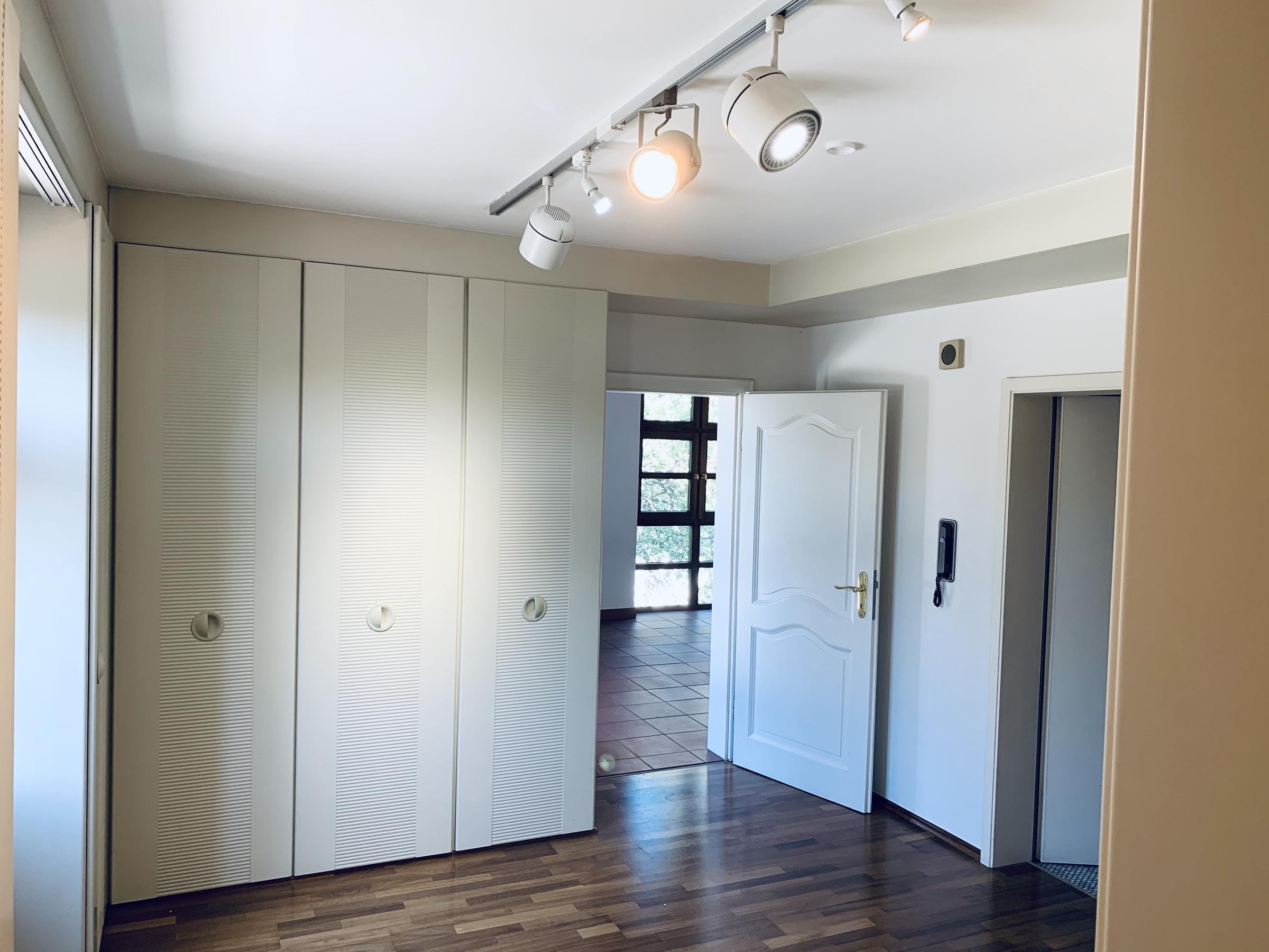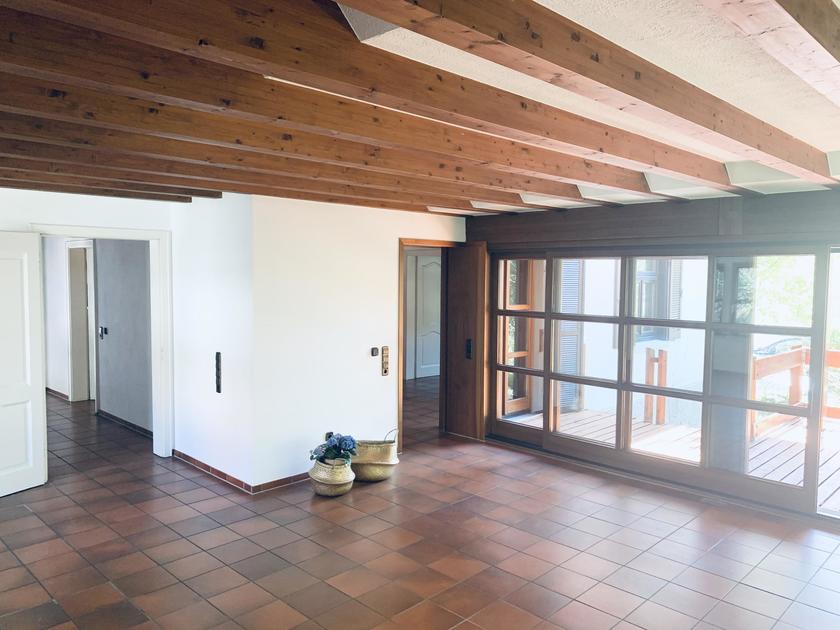 Über eine breite offene Treppe gelangen Sie in das Obergeschoss. Dieses besteht aus einem hellen Galeriebereich mit Zugang zur ca. 60 m² großen sonnigen Dachterrasse. Im privaten Wohnbereich des Obergeschosses befindet sich ein Ankleidezimmer, zwei Schlafzimmer sowie ein großräumiges Badezimmer. Im ausgebauten Untergeschoss der Immobilie befindet sich ein großer Fitnessraum mit Sauna und Dusche sowie ein separates WC, ein Technikraum, ein Gewölbekeller und die gemeinsame Waschküche. Eine Einzelgarage ist direkt mit dem Haus verbunden und von der Hauptwohnung zugänglich, darüber hinaus befinden sich in der Einfahrt zwei weitere Stellplätze. Das Haus ist nicht möbliert und bietet Ihnen dadurch eine Vielzahl von Gestaltungsmöglichkeiten.