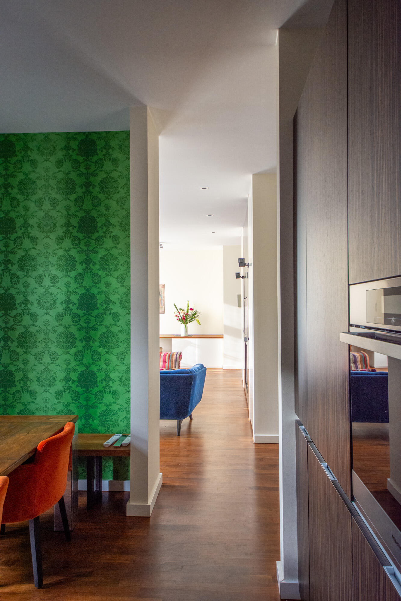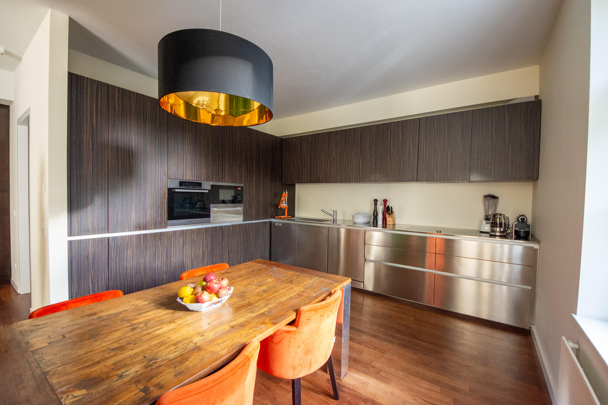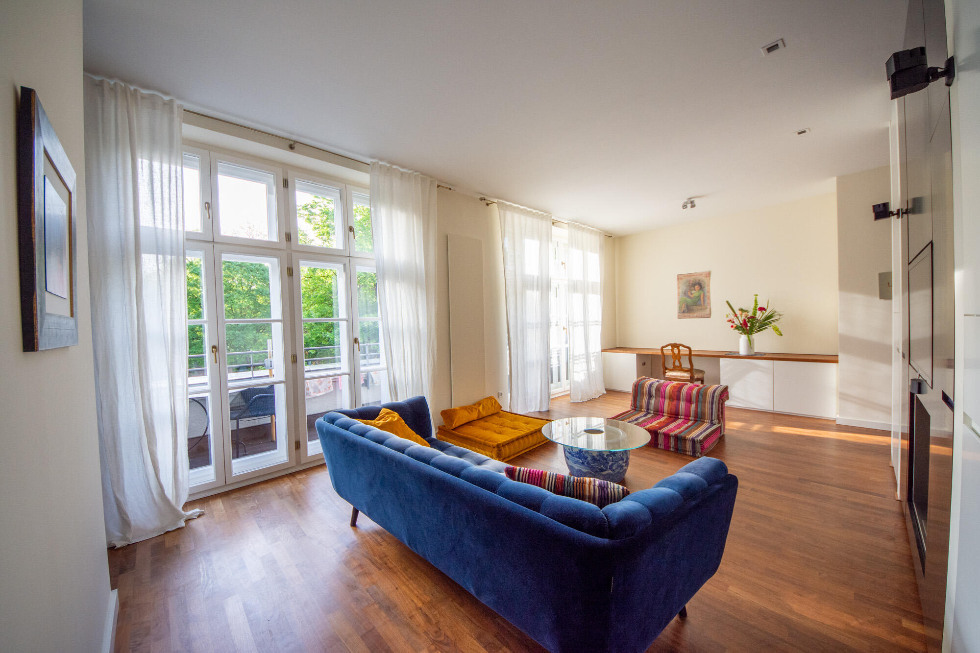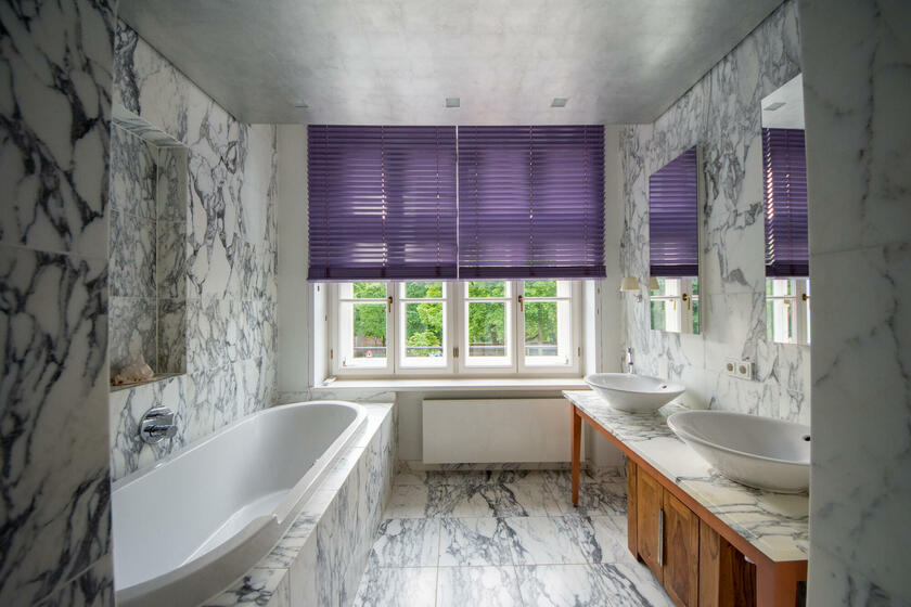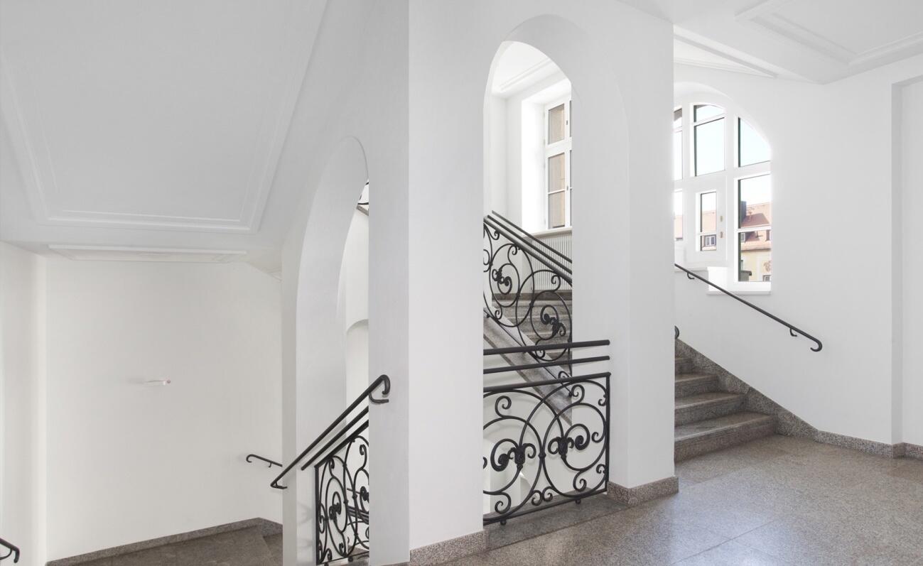 Dem Wohnbereich vorgelagert befindet sich eine Terrasse, die auf der Beletage neben dem Eingangsportal thront und einen traumhaften Ausblick auf den historischen Alten Südfriedhof bietet. Die Küche mit Einbauküche ist sehr großzügig proportioniert und bietet einen geräumigen Essplatz. Die Wohnung ist besonders aufwändig ausgestattet mit hochwertigen Einbauschränken und z. B. mit vergoldeten Säulen im Entrée versehen. Die Vielzahl an großen Fenstern unterstreicht auch hier das großzügige Ambiente der Wohnung und den monumentalen Charakter des Gebäudes.