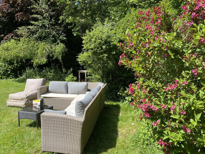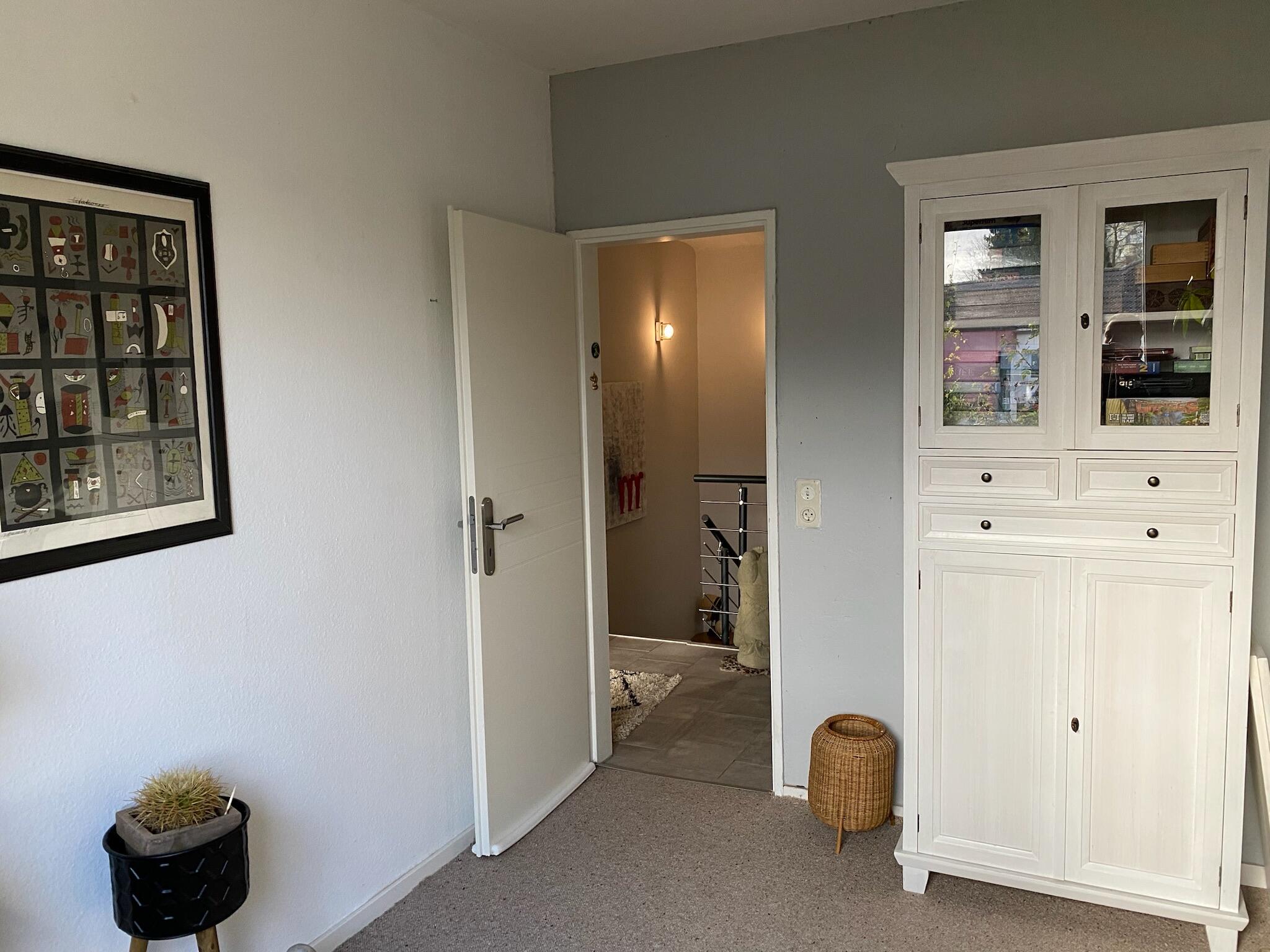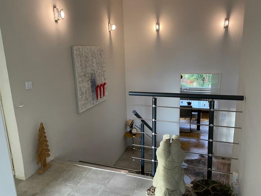 Unser freistehendes Haus befindet sich direkt am Ende eines Kreisverkehrs an einem Wald- und Naherholungsgebiet in Refrath. Im Wohnzimmer wurde Echtholzparkett verlegt. Das Wohnzimmer ist ebenfalls mit einem Kamin ausgestattet. Die Bäder sind gefliest. Sonnenlicht fällt in die Räume im Souterrain und im Obergeschoss bis Mittag und im Wohnzimmer ab dem Nachmittag. Die Fenster sind mit Jalousien und Vorhängen abdunkelbar. Im Außenbereich steht unser großer Garten zur Verfügung. An der Rückseite gibt es einen Bach. Parkplätze befinden sich auf unserem Grundstück und auf der Straße.