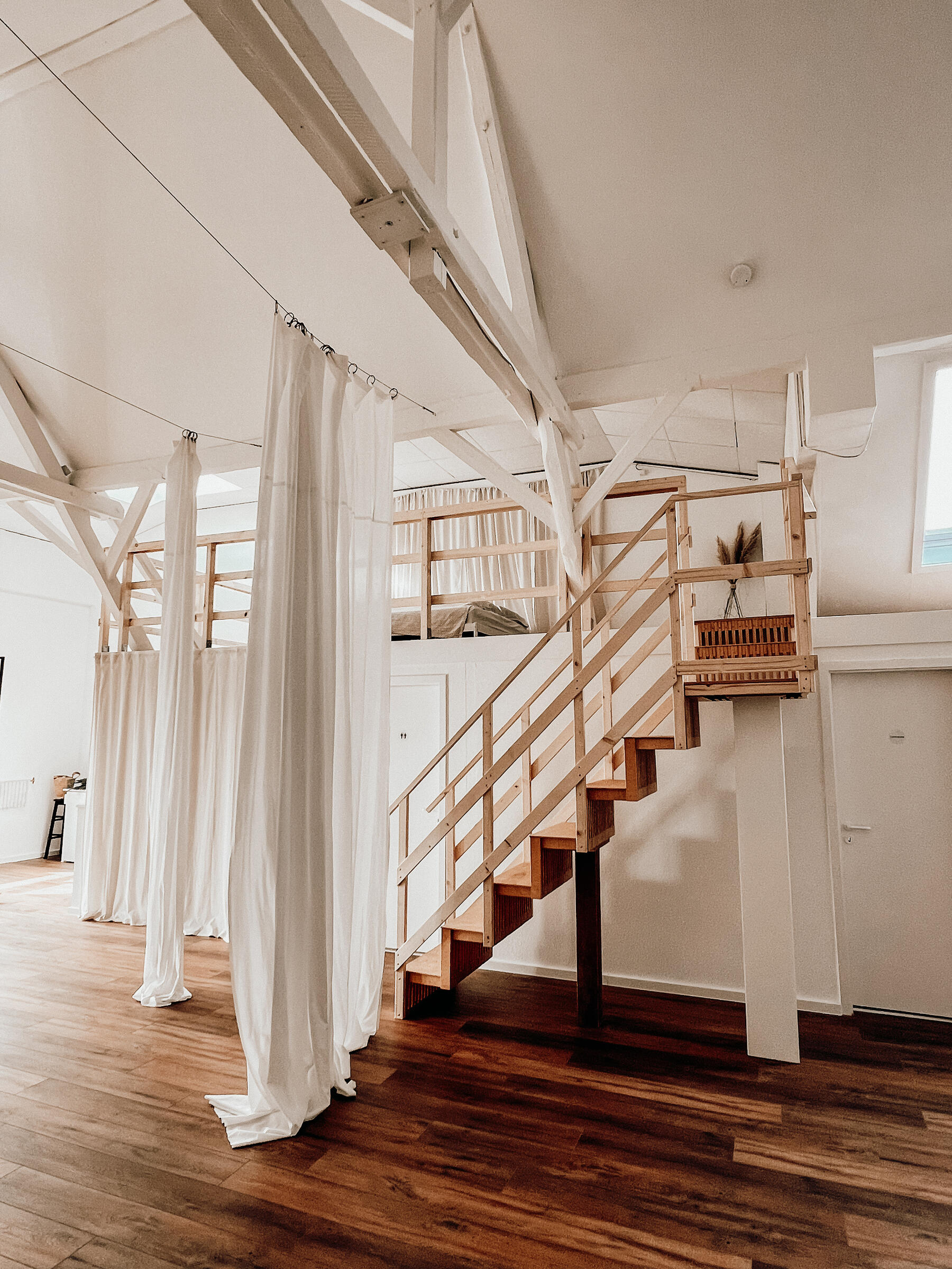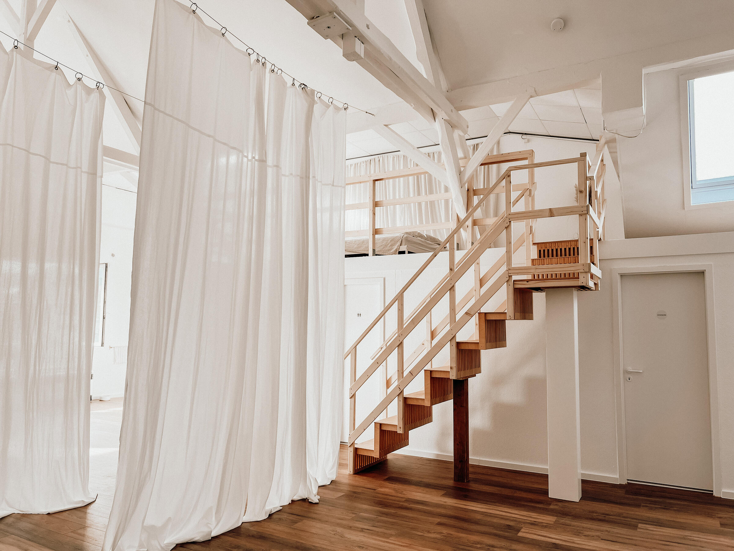 Das Tageslichtstudio befindet sich im ruhigen Dachgeschoss eines Wohnhauses und bietet eine große Studiofläche und eine Empore. Unser Studio ist minimalistisch mit einem Sofa, Sesseln und einem Bett, das sich auf der Empore befindet, möbliert. Die Küche ist ebenfalls sehr einfach und funktional eingerichtet. Der Boden des Studios ist mit braunem Vinyl-Boden ausgelegt. Das Fotohintergrundsystem und die großen Vorhänge können bei Bedarf abgenommen werden. Die Fenster sind nicht verdunkelbar. Parkplätze gibt es direkt vor dem Haus und auf dem Hinterhof, der nur mit Fahrzeugen bis max. 3,5 t befahren werden kann.