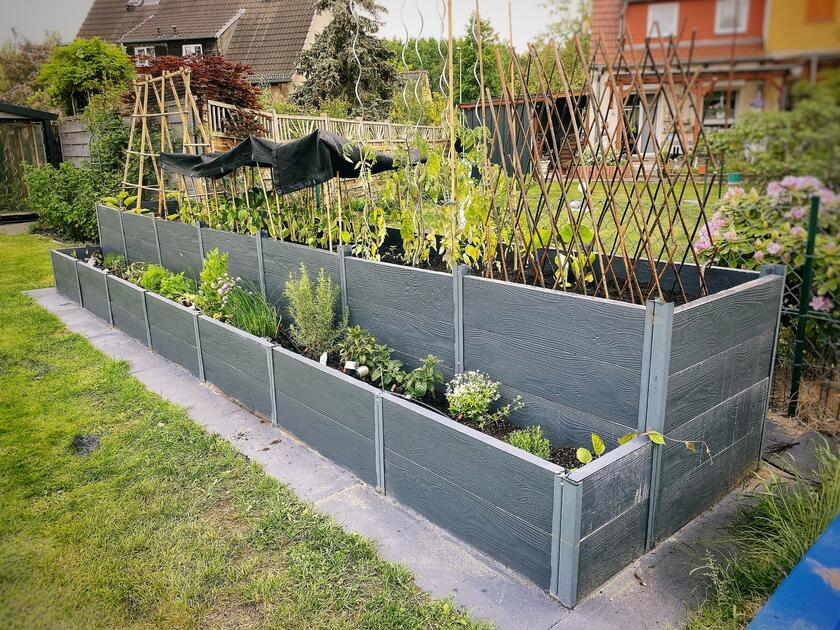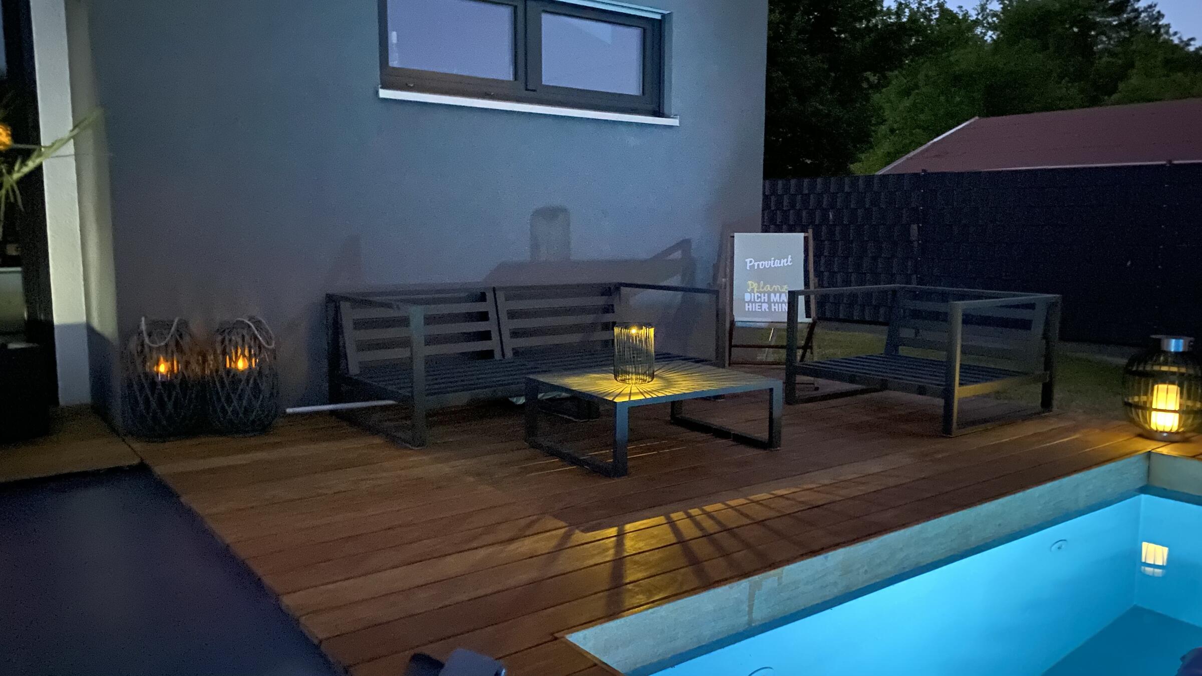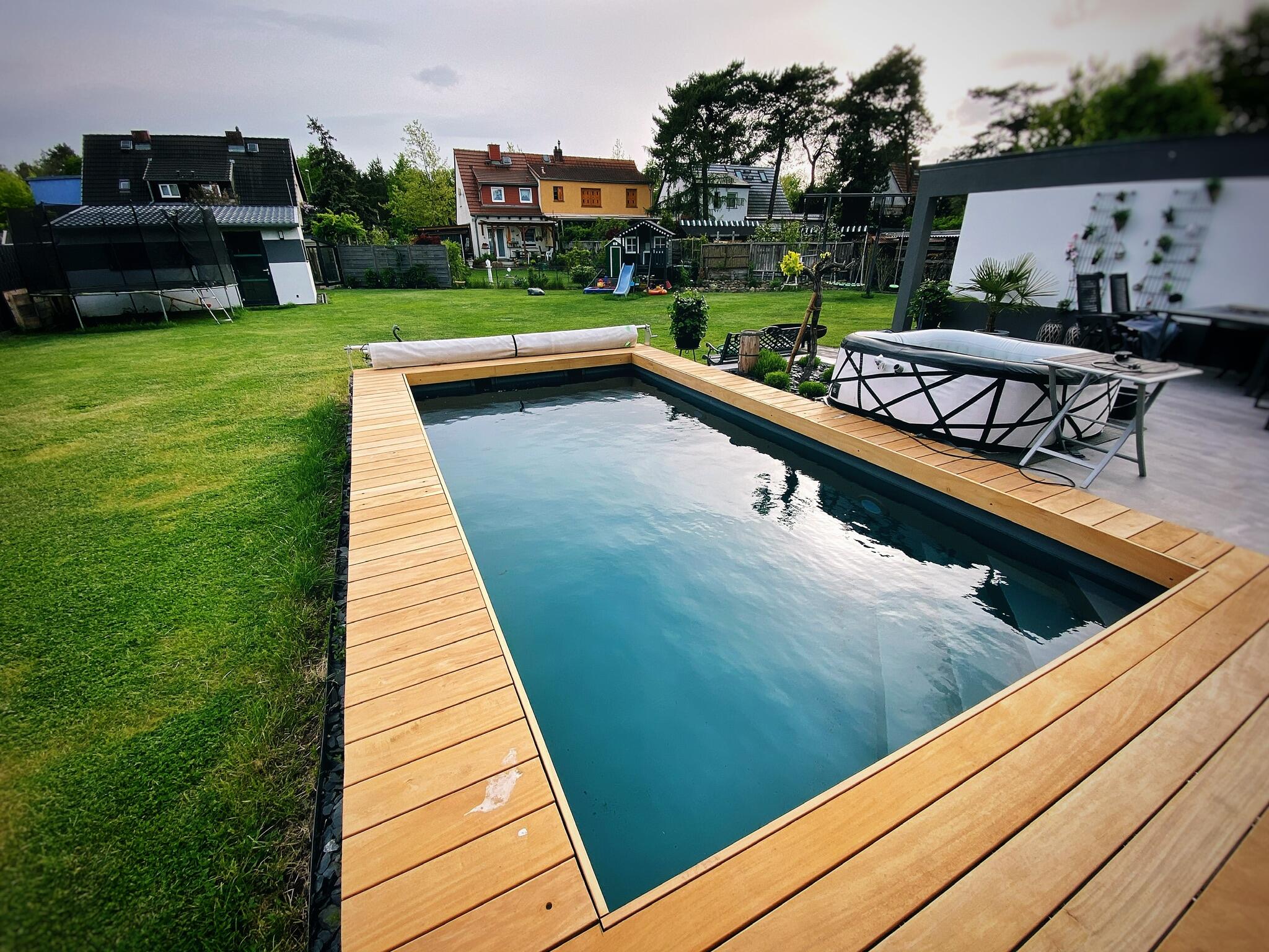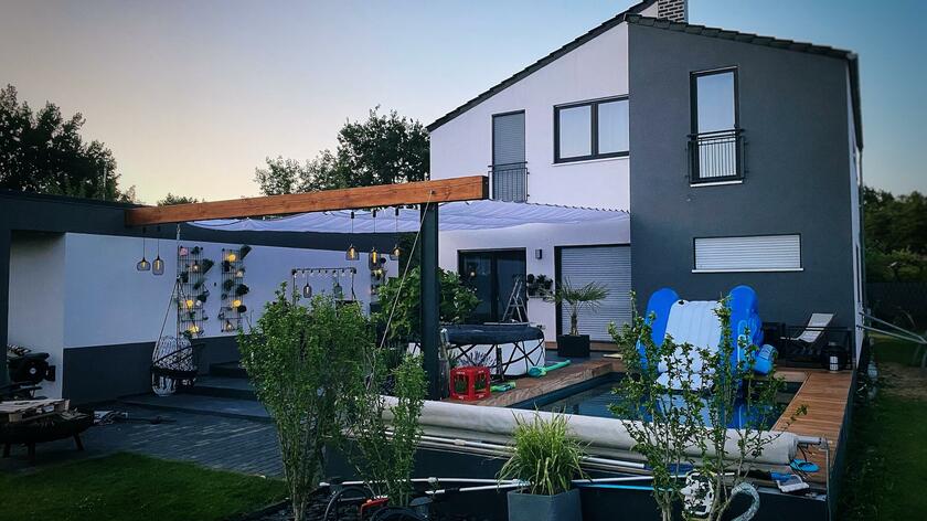 Im 900 m² grünen Garten gibt es diverse schöne Ecken. Die große Sonnenterrasse und der eingebaute Pool sind der Blickfang im Garten, der von viel grüner Wiese, einer großen modernen Doppelgarage, einem Schuppen, Spielhaus, Gewächshaus und einem kleinem Gemüsegarten umrandet wird.