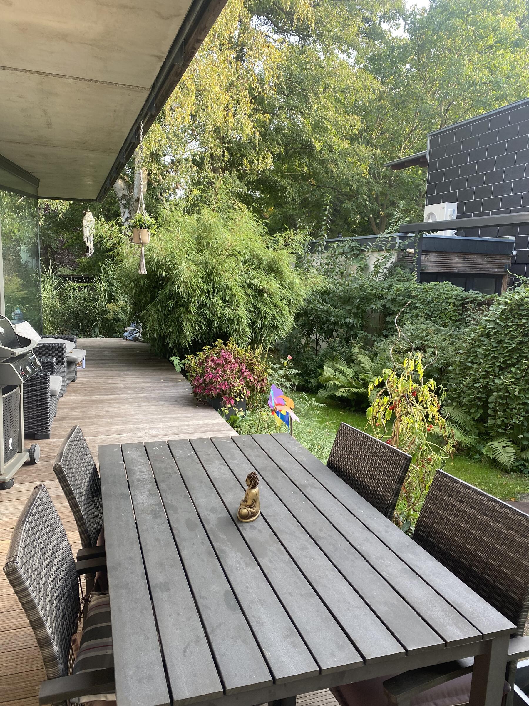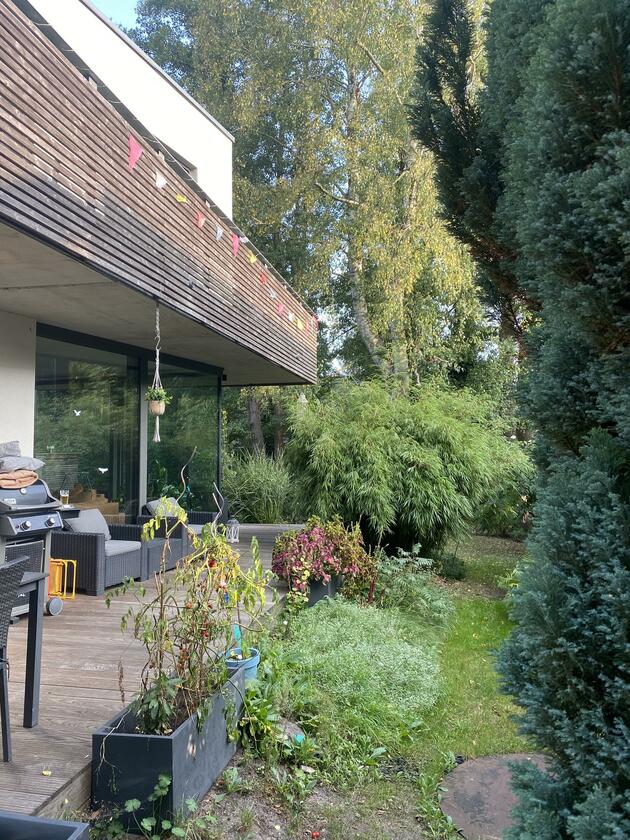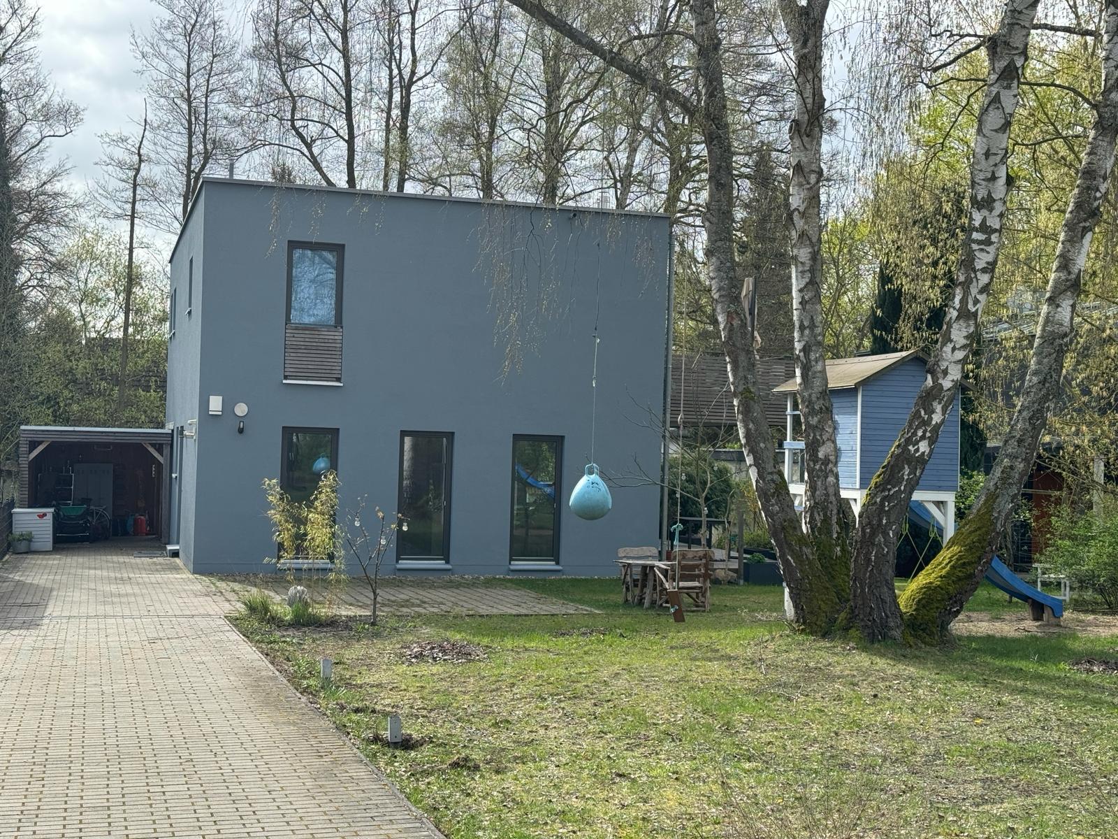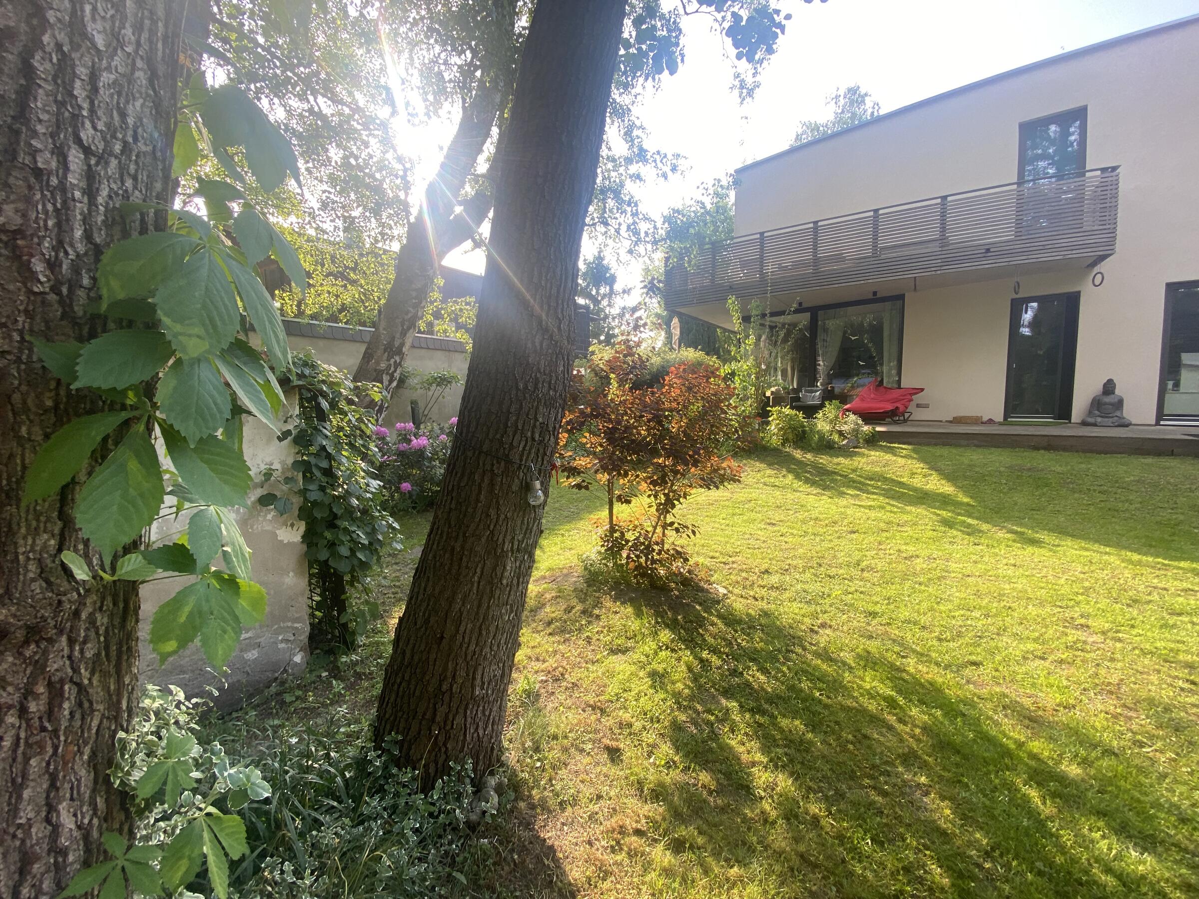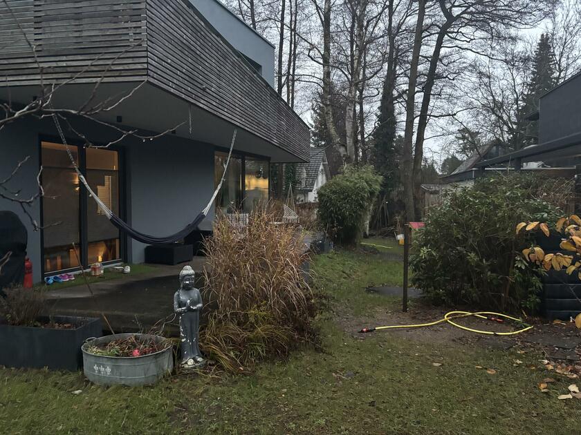 Unser Architektenhaus ist aufgrund seiner konischen Bauweise einzigartig. Die bodentiefen Fenster im Wohnbereich sowie allen anderen Zimmern lassen viel Sonnenlicht herein. Der moderne Küchenbereich ist mit einer großen Kücheninsel ausgestattet. Alle Fenster können mit Vorhängen oder Jalousien abgedunkelt werden. Von allen Räume kann man die umlaufende Terrasse unseres Hauses betreten. Auch im Obergeschoss haben alle Räume bodentiefe Fenster, die mit Jalousien abgedunkelt werden können. Der umlaufende Balkon kann hier ebenfalls von allen Räumen betreten werden. Der Garten ist gepflegt aber wild angelegt, wirkt parkähnlich. Unser Haus befindet sich an einer verkehrsberuhigten Spielstraße. Die lange Auffahrt zum Haus bietet Parkplätze für ca. 5 Pkw. Vor unserem Haus gibt es einen weiteren Parkplatz mit Wallbox und einen schmalen Streifen Garten mit kleinen Obstbäumen drauf. Dieser führt um das Haus herum zum großen Garten. Man kann um das ganze Haus herum laufen. Der Carport ist mit dem großen dahinter liegenden wilden Garten verbunden. Wir haben eine Katze.