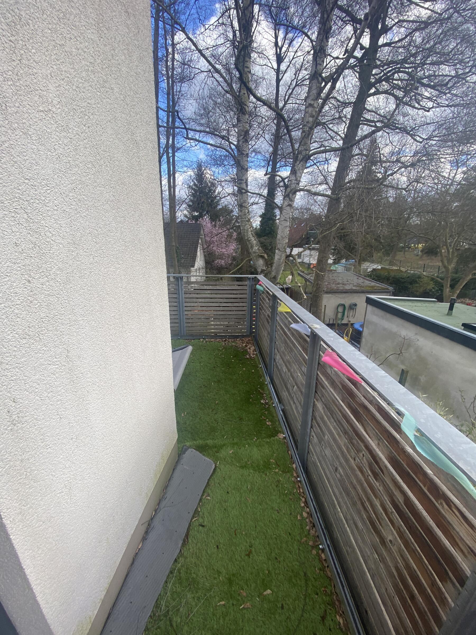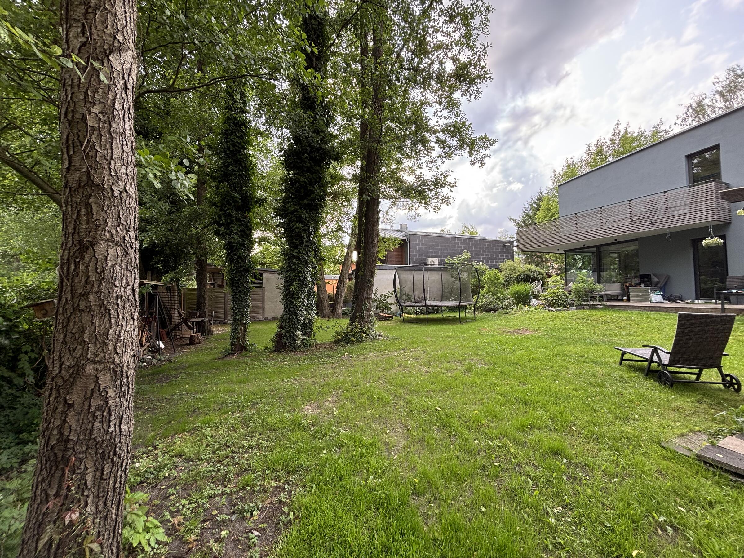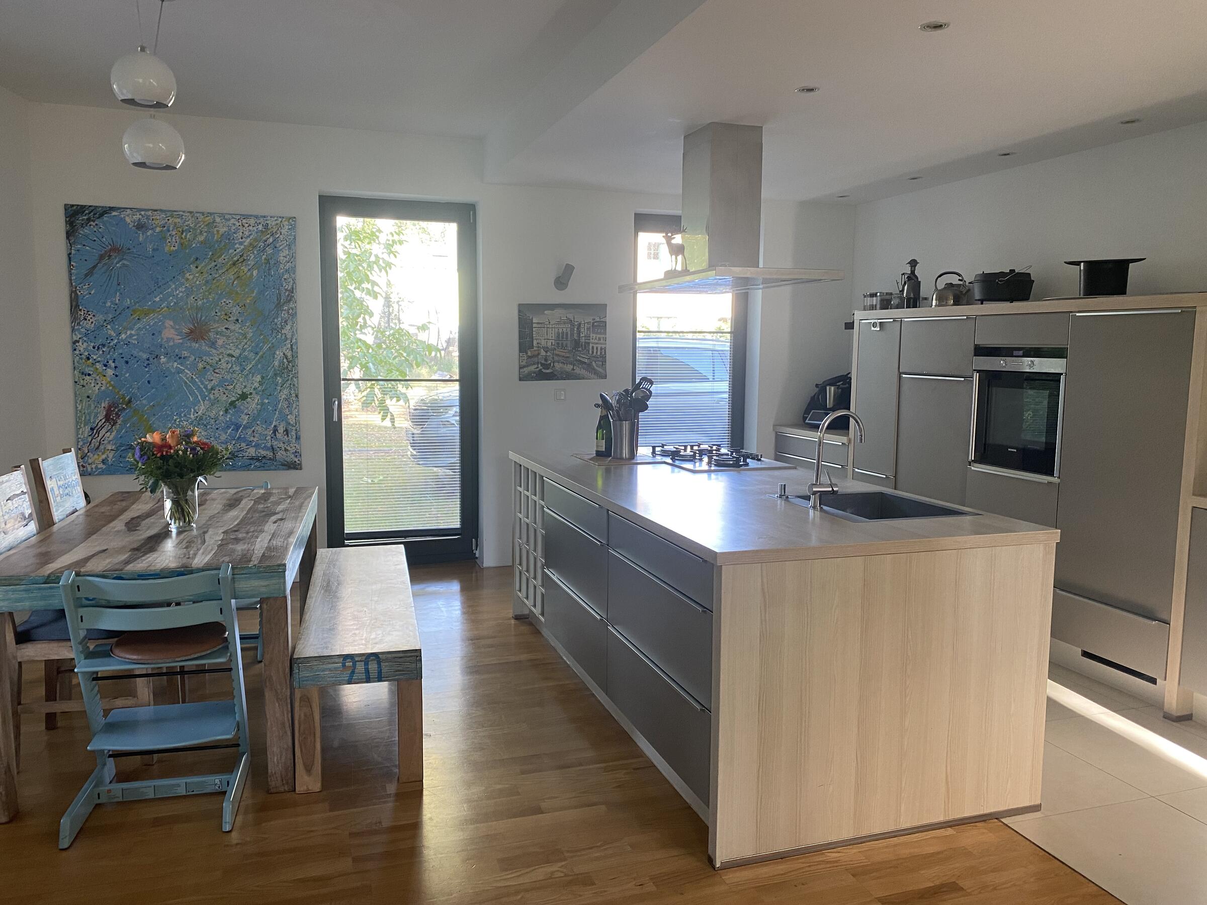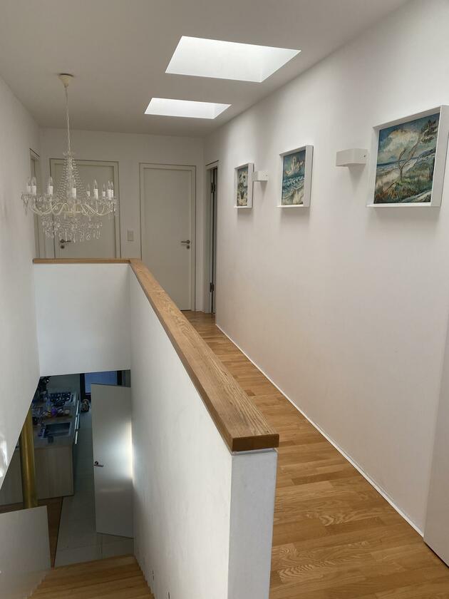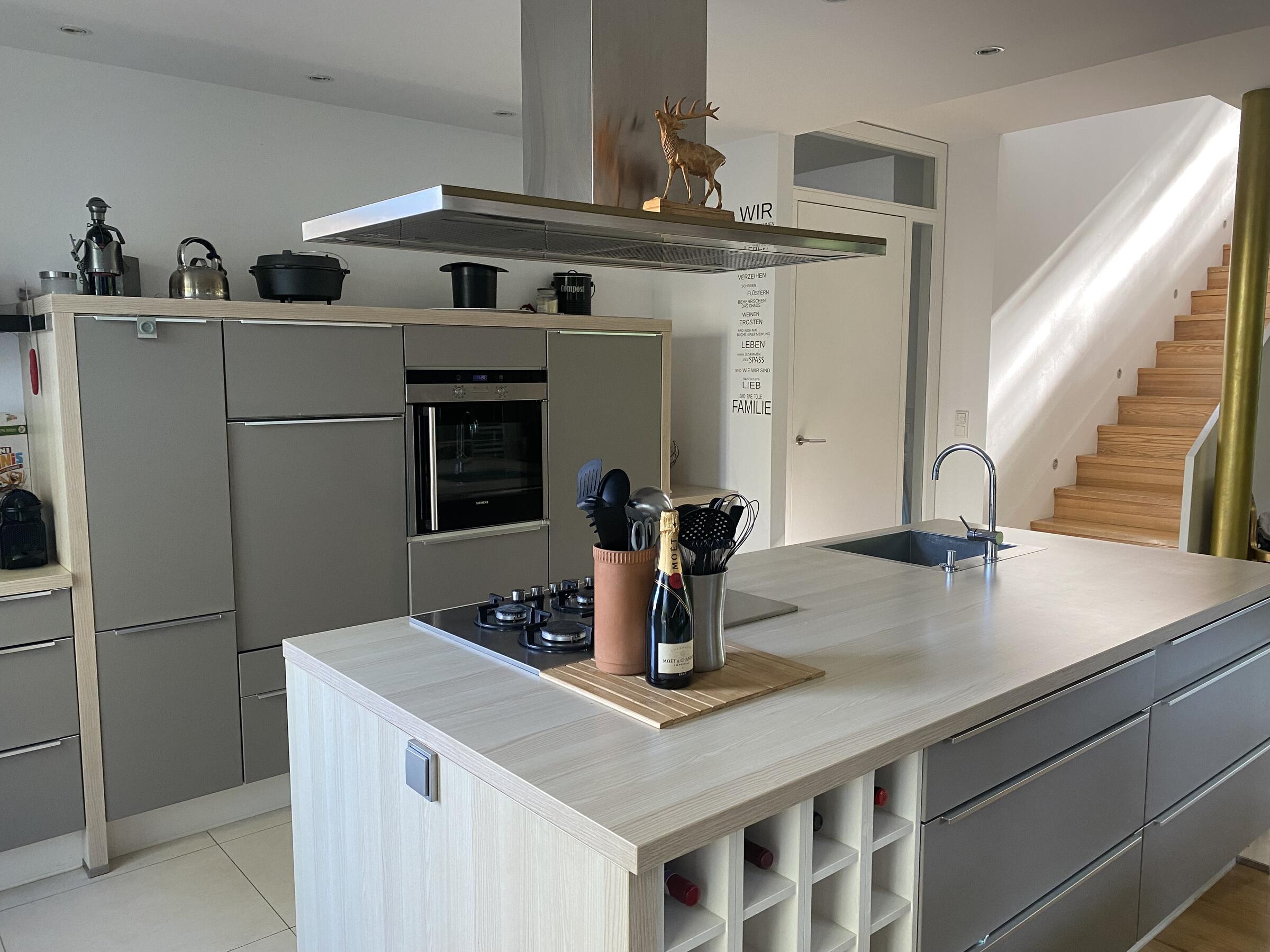 Unser Architektenhaus ist aufgrund seiner konischen Bauweise einzigartig. Die bodentiefen Fenster im Wohnbereich sowie allen anderen Zimmern lassen viel Sonnenlicht herein. Der moderne Küchenbereich ist mit einer großen Kücheninsel ausgestattet. Alle Fenster können mit Vorhängen oder Jalousien abgedunkelt werden. Von allen Räume kann man die umlaufende Terrasse unseres Hauses betreten. Auch im Obergeschoss haben alle Räume bodentiefe Fenster, die mit Jalousien abgedunkelt werden können. Der umlaufende Balkon kann hier ebenfalls von allen Räumen betreten werden. Der Garten ist gepflegt aber wild angelegt, wirkt parkähnlich. Unser Haus befindet sich an einer verkehrsberuhigten Spielstraße. Die lange Auffahrt zum Haus bietet Parkplätze für ca. 5 Pkw. Vor unserem Haus gibt es einen weiteren Parkplatz mit Wallbox und einen schmalen Streifen Garten mit kleinen Obstbäumen drauf. Dieser führt um das Haus herum zum großen Garten. Man kann um das ganze Haus herum laufen. Der Carport ist mit dem großen dahinter liegenden wilden Garten verbunden. Wir haben eine Katze.