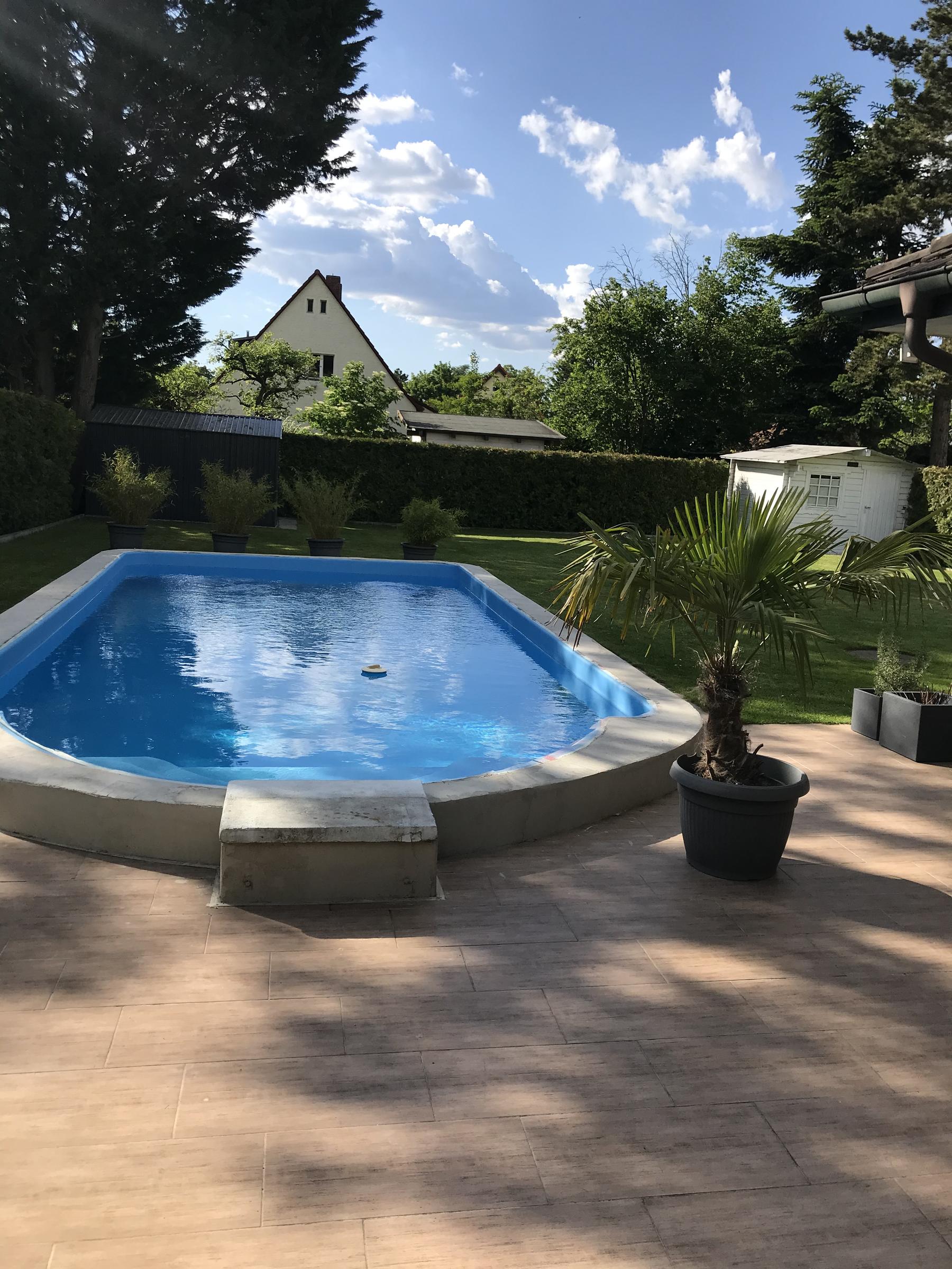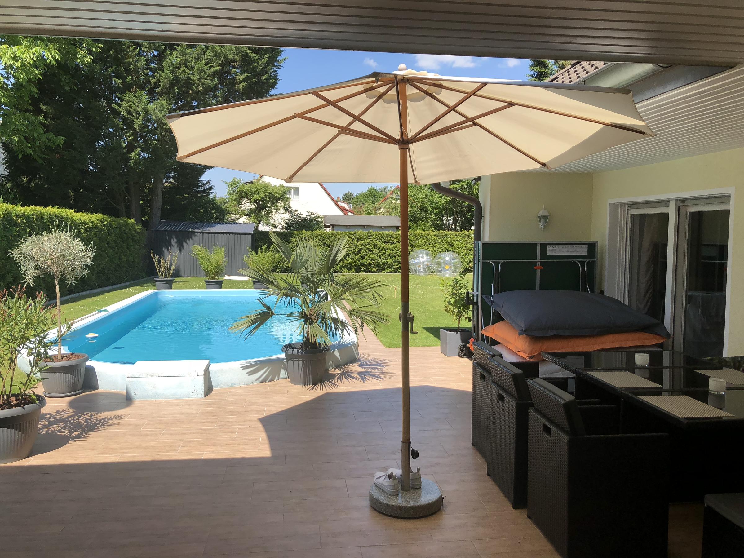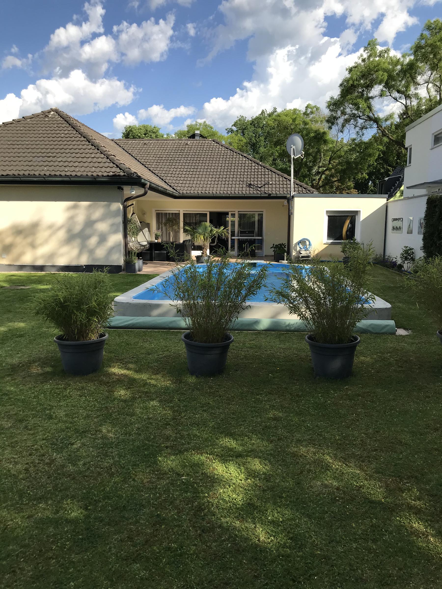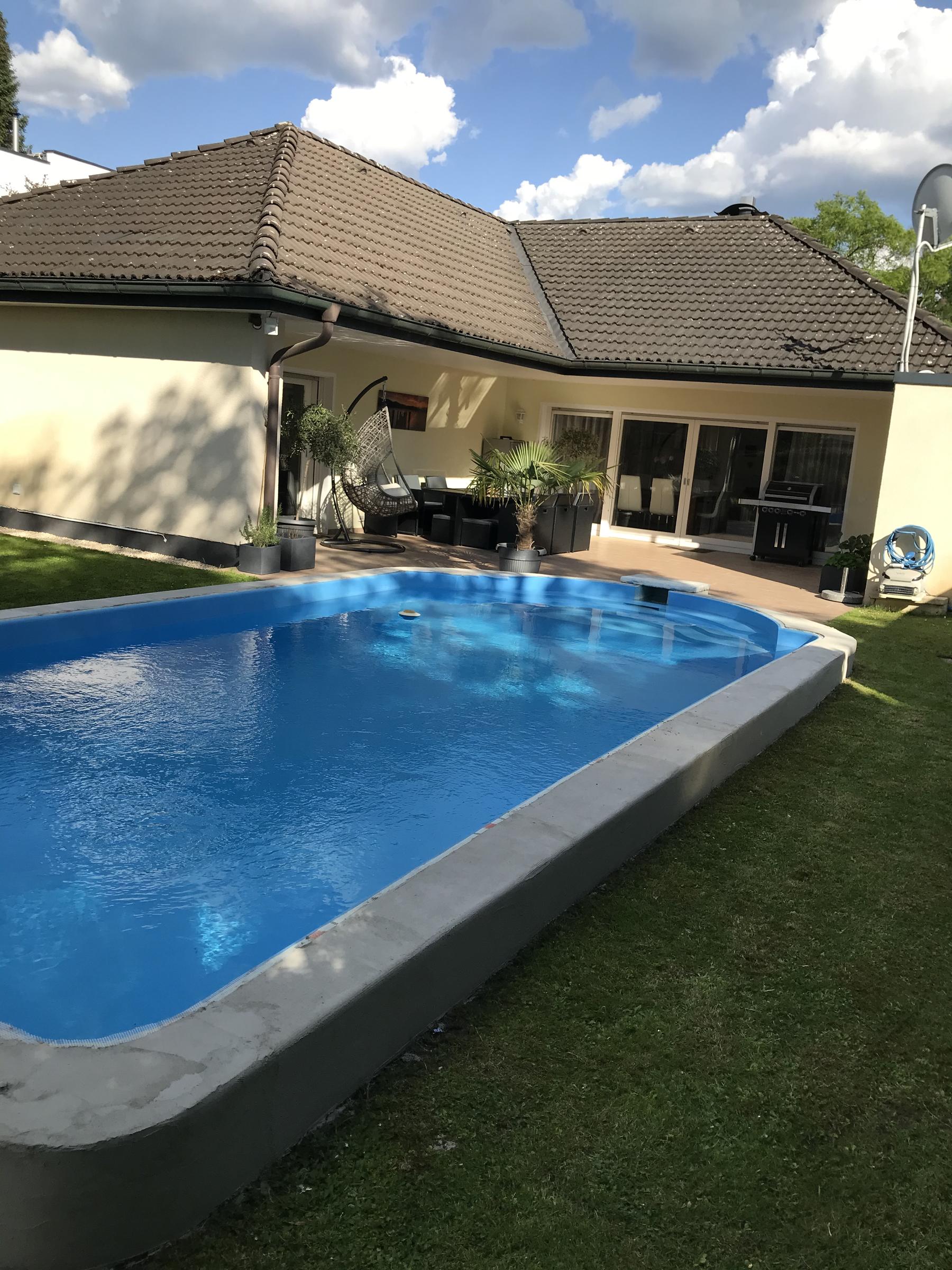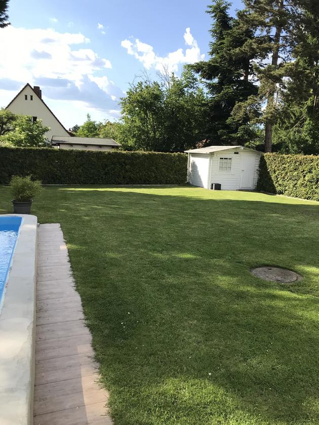 Unser alleinstehendes Einfamilienhaus im Bungalowstil in Berlin-Zehlendorf ist von einem großen Grundstück mit 850 m² und einem großzügig angelegten Garten sowie einer Pool-Landschaft umgeben. Eine große Terrasse mit Möbeln für 10 Personen grenzt direkt an das Haus. Eine besonders große Liegewiese befindet sich rund um den Pool. Hier können 4 "Lazy Bag" zur Verfügung gestellt werden. Der Außenpool besitzt die Maße: 9 m Länge, 3,5 m Breite und 1,5 m Tiefe. Eine Tischtennisplatte steht ebenfalls zur Verfügung. Auf der Terrasse kann zudem mit einem großen 4-flammigen Gasgrill gegrillt werden. Das Wohnzimmer bietet einen großen offenen Raum zur Terrasse. Hier steht ein großer Esstisch mit 8 passenden Stühlen. Die große Wohnlandschaft bietet Gemütlichkeit mit einem offenen Kamin, einem 55-Zoll Fernseher. Die Küche ist zum Wohnzimmer hin offen gestaltet. Das Bad bietet einen großen Whirlpool mit Lichteffekten. Die Dusche ist großzügig offen gehalten. Des weiteren gibt es ein Gästebad, 2 Kinderzimmer, ein großzügiges Schlafzimmer mit Ausgang zur Terrasse und ein Gästezimmer. Im Garten befindet sich ein Kleines Gästehaus.