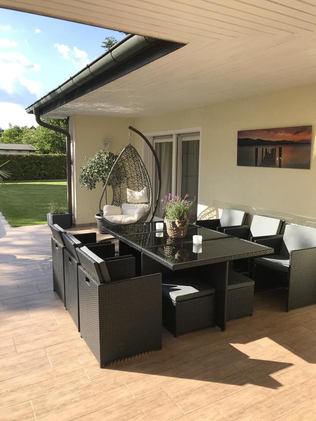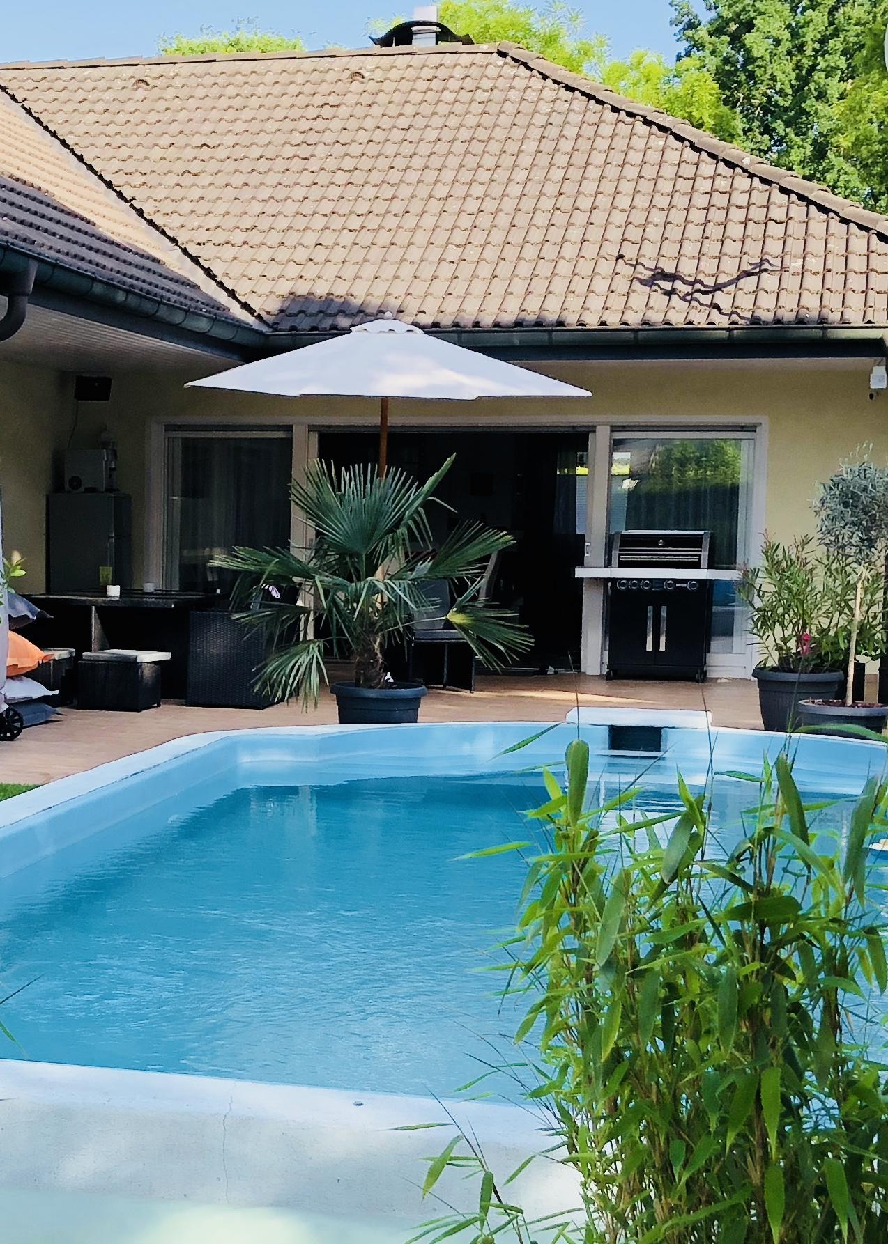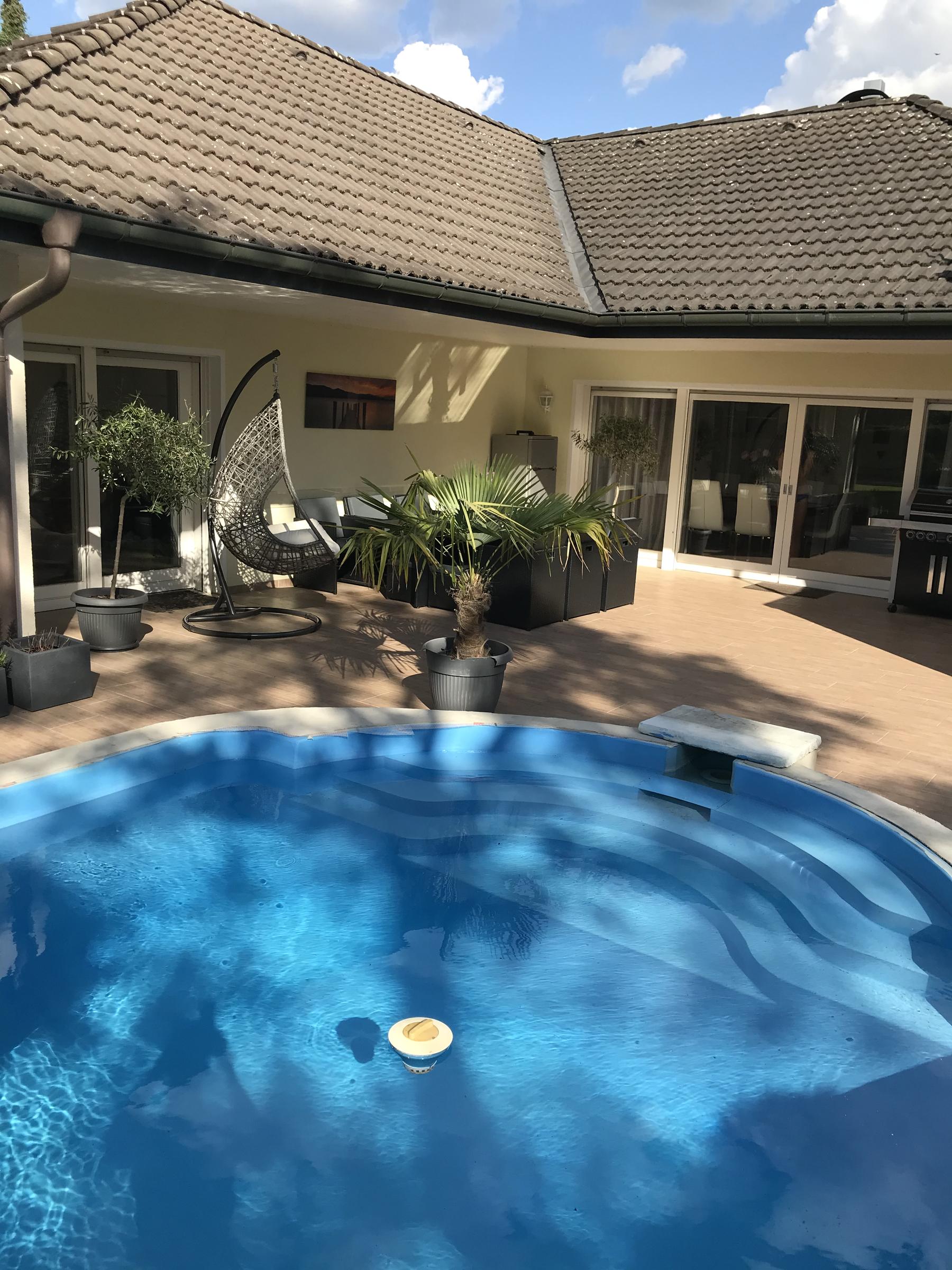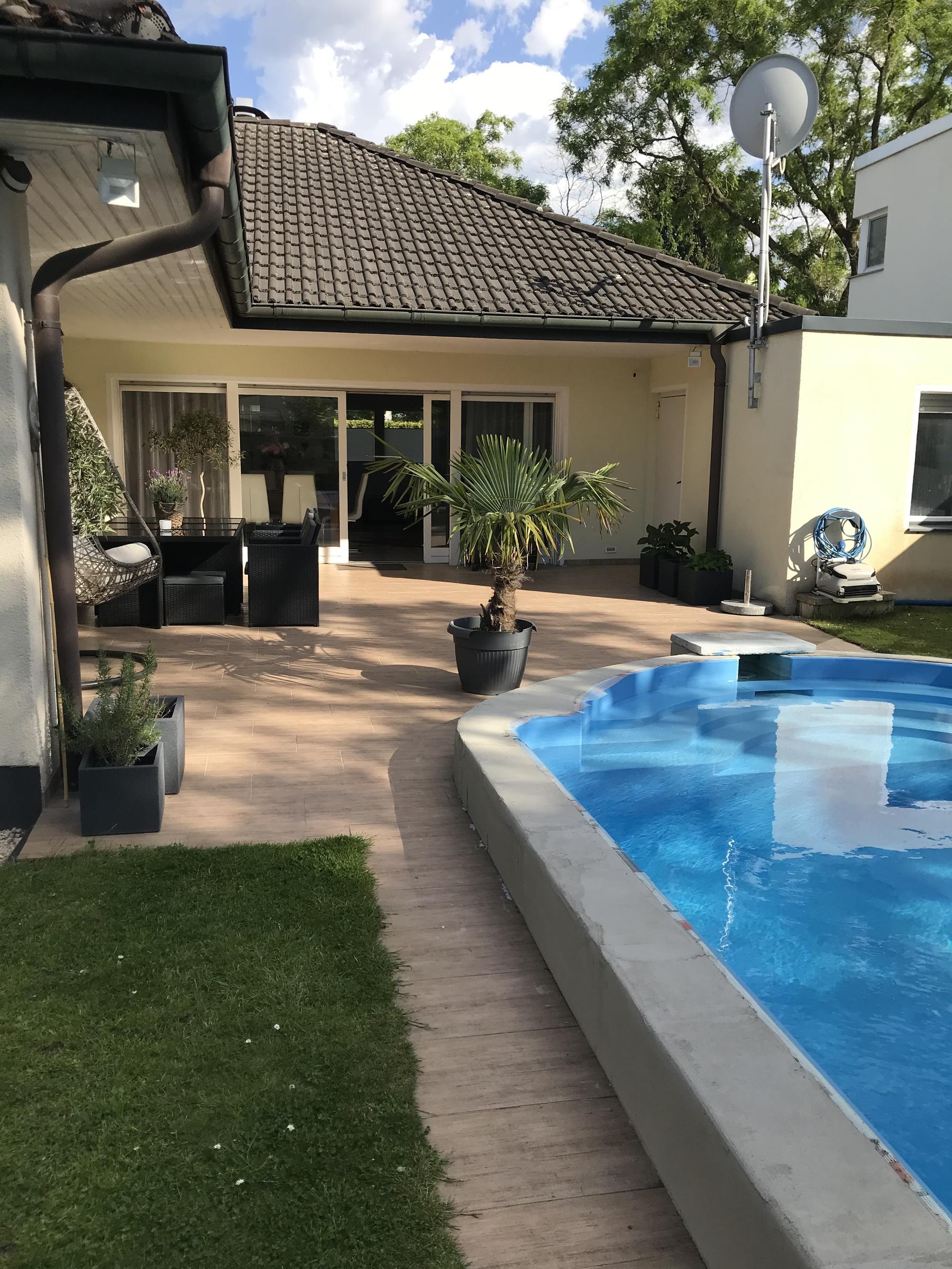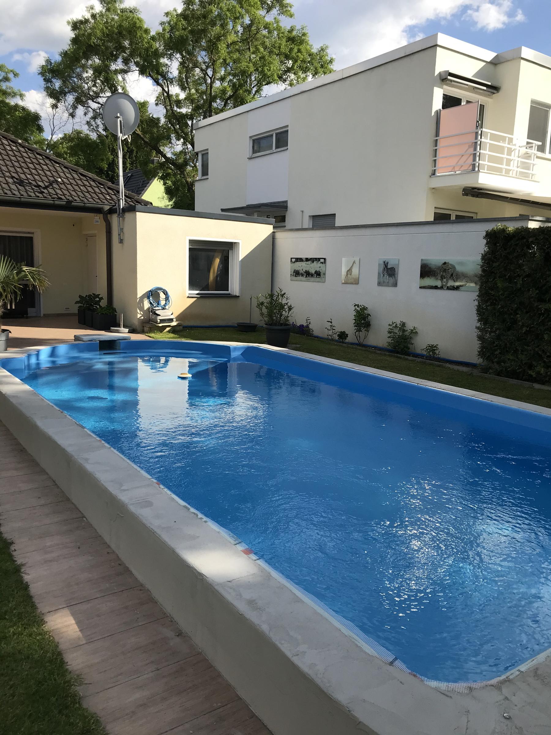 Unser alleinstehendes Einfamilienhaus im Bungalowstil in Berlin-Zehlendorf ist von einem großen Grundstück mit 850 m² und einem großzügig angelegten Garten sowie einer Pool-Landschaft umgeben. Eine große Terrasse mit Möbeln für 10 Personen grenzt direkt an das Haus. Eine besonders große Liegewiese befindet sich rund um den Pool. Hier können 4 "Lazy Bag" zur Verfügung gestellt werden. Der Außenpool besitzt die Maße: 9 m Länge, 3,5 m Breite und 1,5 m Tiefe. Eine Tischtennisplatte steht ebenfalls zur Verfügung. Auf der Terrasse kann zudem mit einem großen 4-flammigen Gasgrill gegrillt werden. Das Wohnzimmer bietet einen großen offenen Raum zur Terrasse. Hier steht ein großer Esstisch mit 8 passenden Stühlen. Die große Wohnlandschaft bietet Gemütlichkeit mit einem offenen Kamin, einem 55-Zoll Fernseher. Die Küche ist zum Wohnzimmer hin offen gestaltet. Das Bad bietet einen großen Whirlpool mit Lichteffekten. Die Dusche ist großzügig offen gehalten. Des weiteren gibt es ein Gästebad, 2 Kinderzimmer, ein großzügiges Schlafzimmer mit Ausgang zur Terrasse und ein Gästezimmer. Im Garten befindet sich ein Kleines Gästehaus.