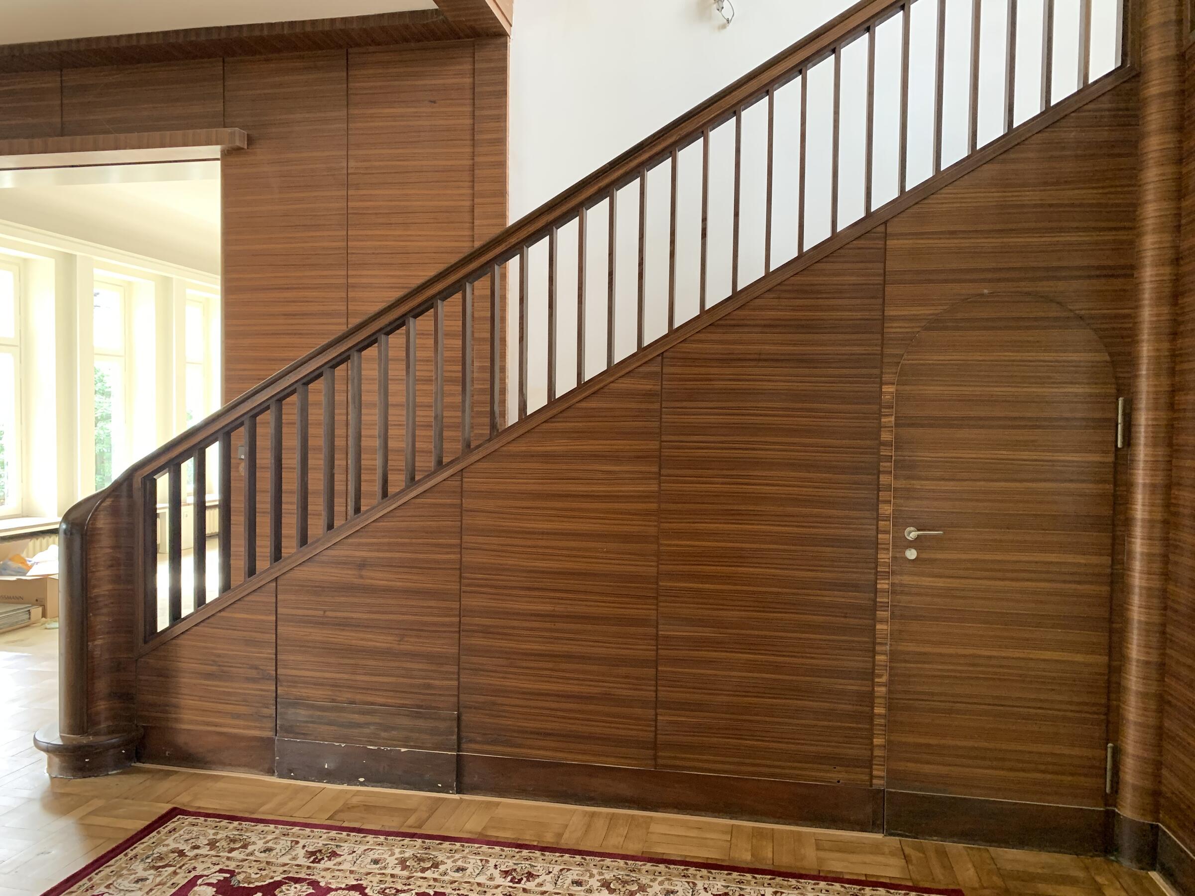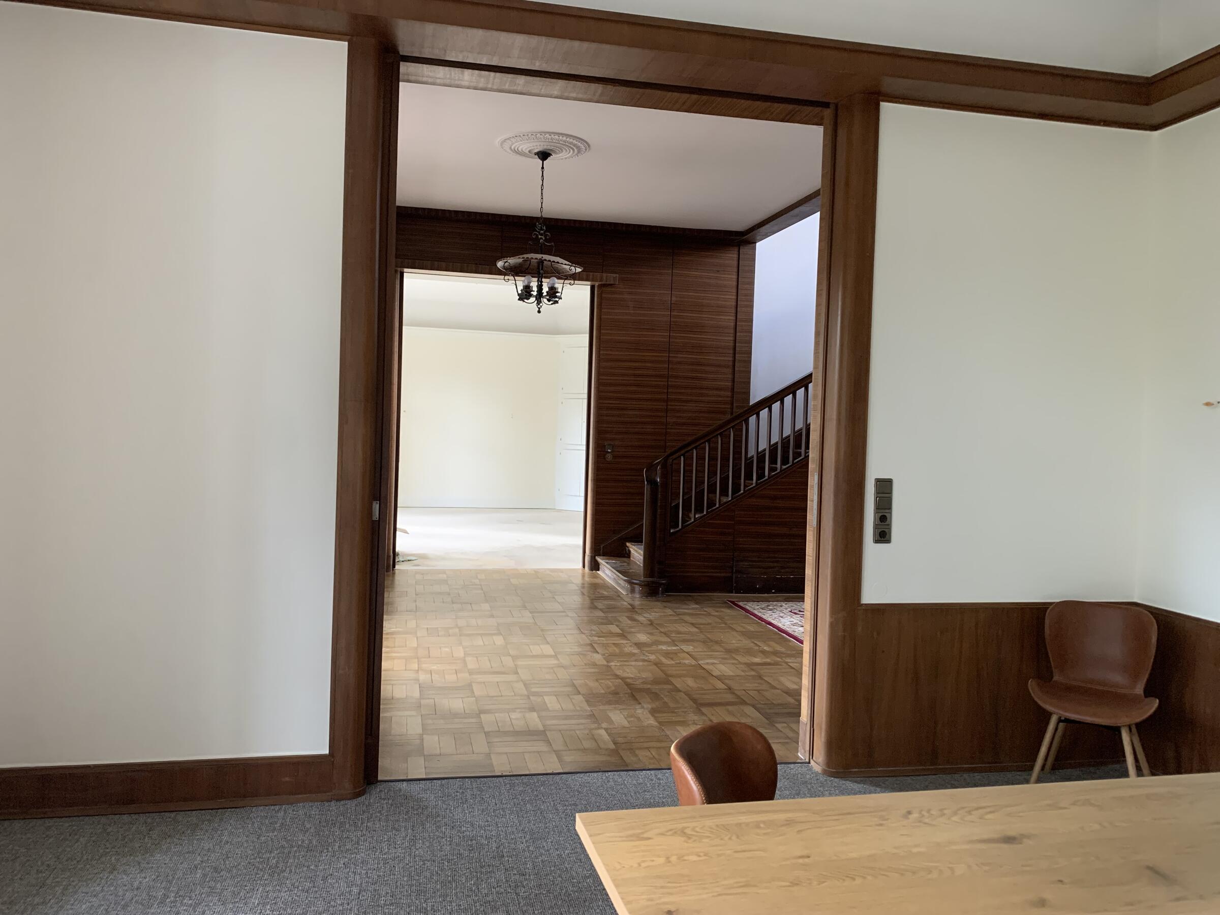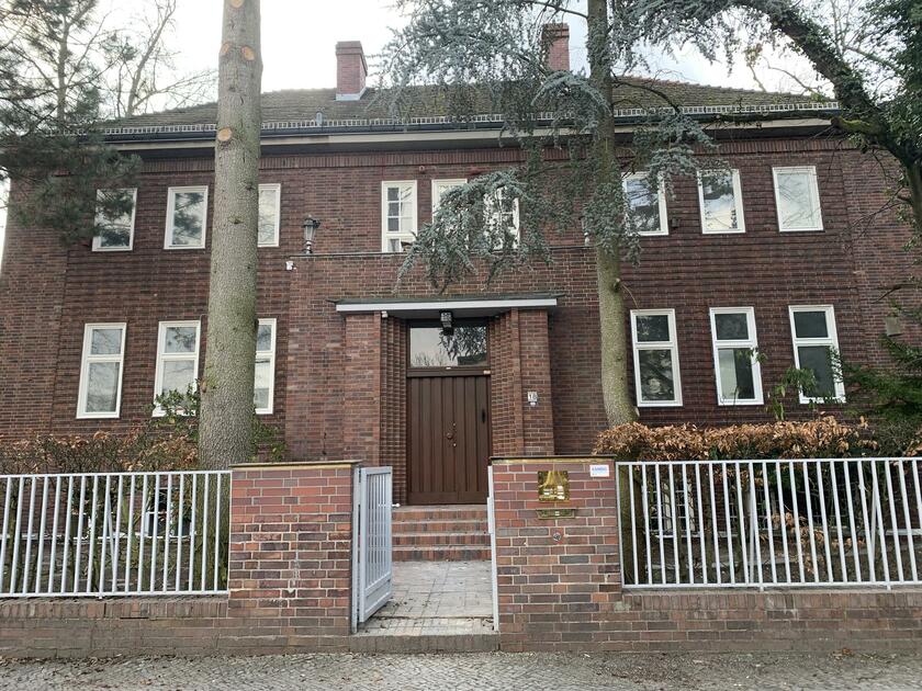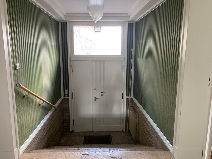 Die leerstehende Villa wurde im Jahr 1930 erbaut und befindet sich in einer ruhigen Wohngegend im Berliner Westend. Über eine kleine Treppe gelangt man in den Eingangsflur mit sandfarbenem Steinboden und mittelgrüner Tapete. Das Treppenhaus hat teilweise holzverkleidete Wände, bietet einen alten Kamin und eine aufwendig restaurierte Holztreppe. Links und rechts des Treppenhauses befinden sich zwei große Holzschiebetüren, die jeweils in das große Esszimmer und ein Herrenzimmer führen. Im Untergeschoss stehen eine kleine Küche, ein kleines und ein größeres Zimmer, eine Toilette sowie weitere leere Flächen zur Verfügung. Hier befinden sich auch 2 nutzbare WCs. Durch eine große Glastür gelangt man in den vollständig verglasten und lichtdurchfluteten Wintergarten. Der durch dichte Büsche und Bäume blickgeschützte Garten kann ebenfalls für Produktionen genutzt werden. Pkw-Stellplätze befinden sich auf der Einfahrt zum Grundstück und an der vorbeiführenden Straße.