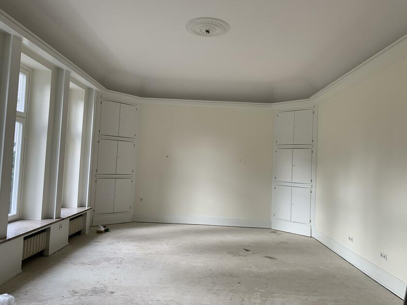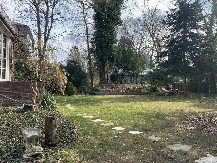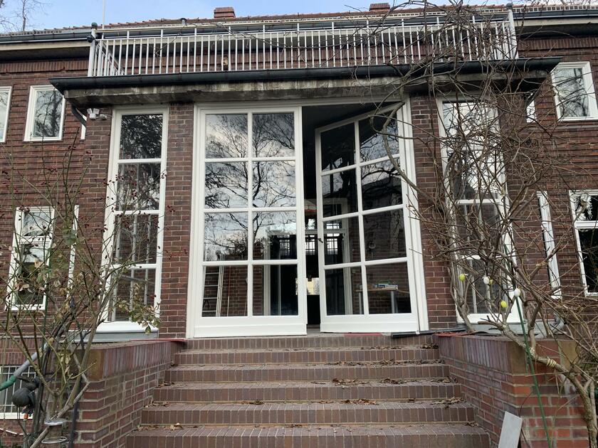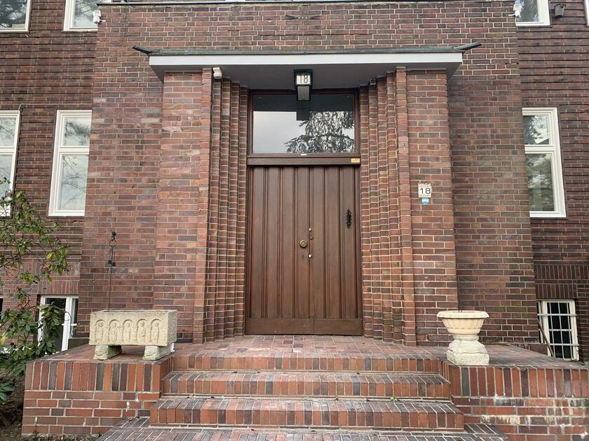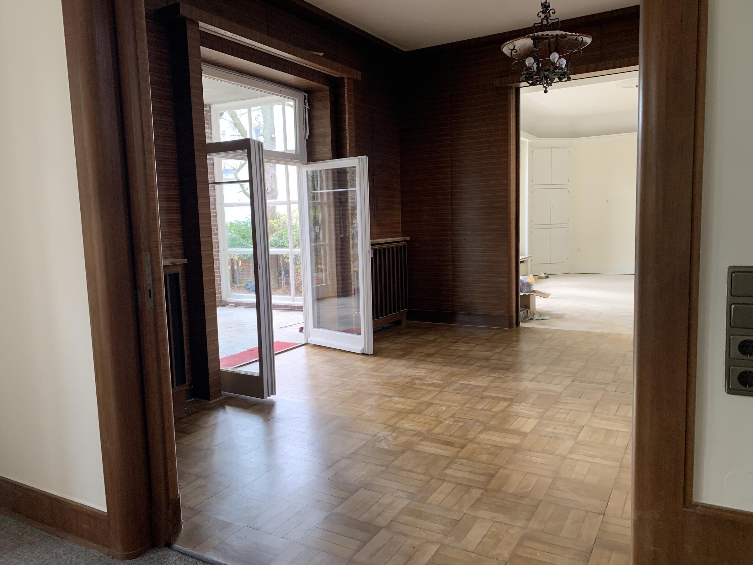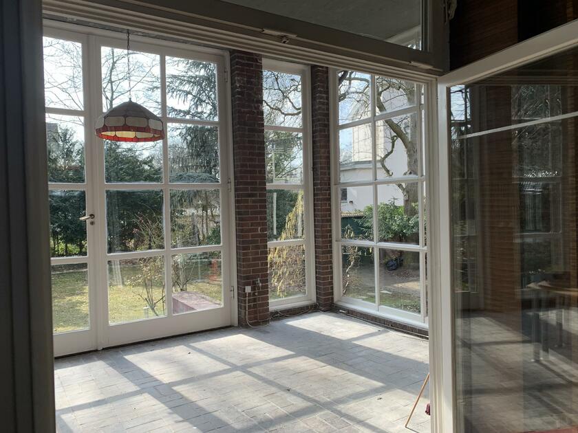 Die leerstehende Villa wurde im Jahr 1930 erbaut und befindet sich in einer ruhigen Wohngegend im Berliner Westend. Über eine kleine Treppe gelangt man in den Eingangsflur mit sandfarbenem Steinboden und mittelgrüner Tapete. Das Treppenhaus hat teilweise holzverkleidete Wände, bietet einen alten Kamin und eine aufwendig restaurierte Holztreppe. Links und rechts des Treppenhauses befinden sich zwei große Holzschiebetüren, die jeweils in das große Esszimmer und ein Herrenzimmer führen. Im Untergeschoss stehen eine kleine Küche, ein kleines und ein größeres Zimmer, eine Toilette sowie weitere leere Flächen zur Verfügung. Hier befinden sich auch 2 nutzbare WCs. Durch eine große Glastür gelangt man in den vollständig verglasten und lichtdurchfluteten Wintergarten. Der durch dichte Büsche und Bäume blickgeschützte Garten kann ebenfalls für Produktionen genutzt werden. Pkw-Stellplätze befinden sich auf der Einfahrt zum Grundstück und an der vorbeiführenden Straße.