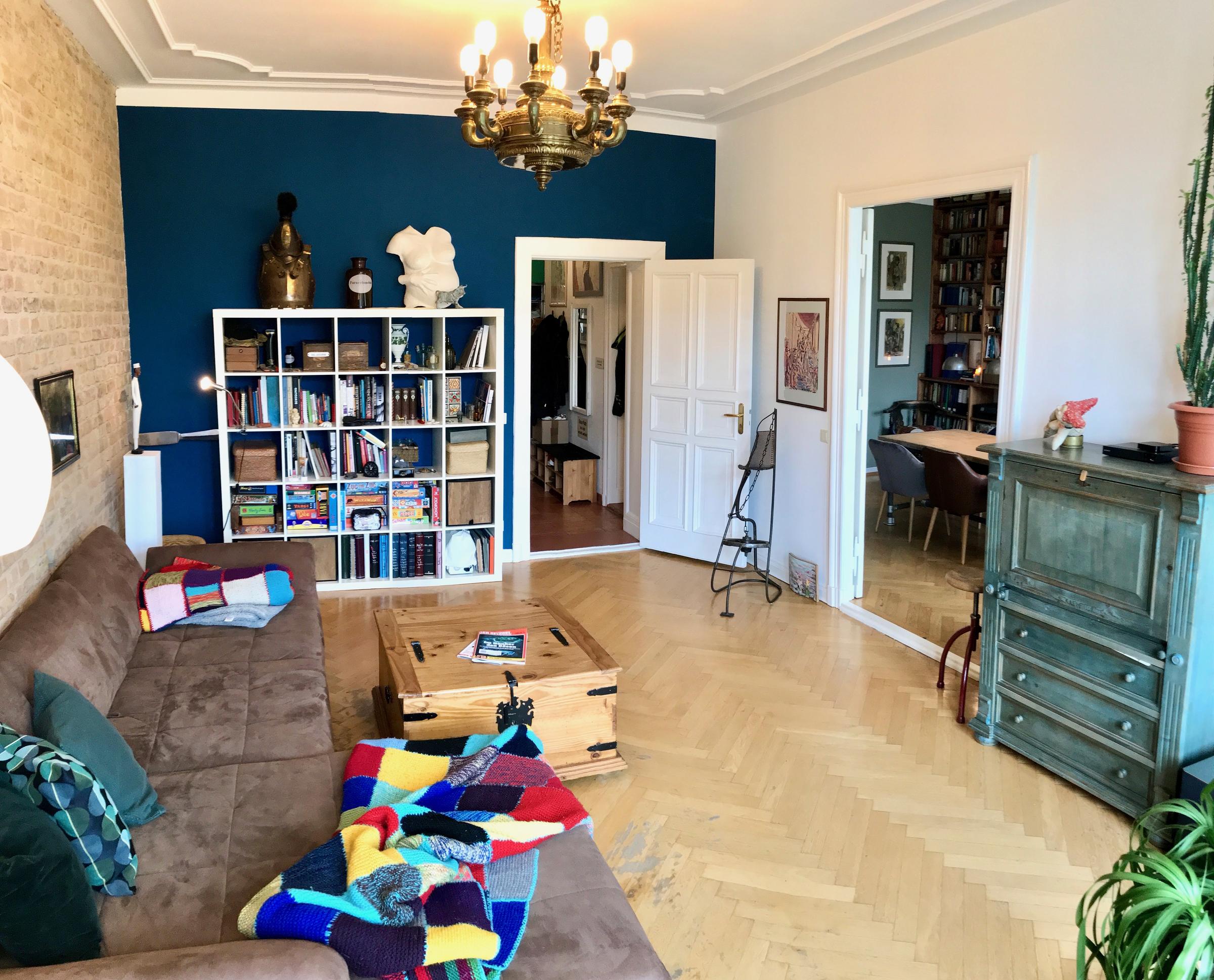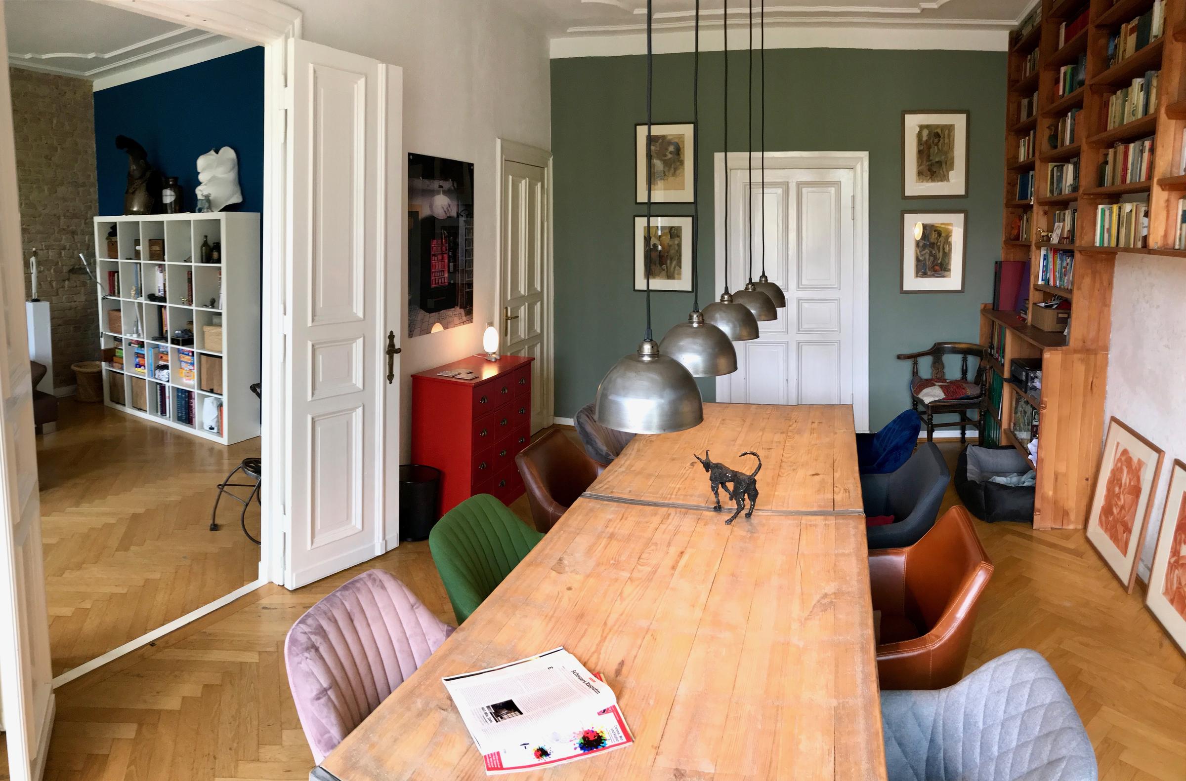 Schöne Altbauwohnung mit fantastischem Blick auf eine alte Mälzerei in Pankow. Die Wohnung hat 120 m² und 4 Zimmer, eine Küche sowie 2 Bäder. Sie befindet sich im 2. Obergeschoss eines wunderschönen, ruhigen Altbaus. Sie ist sehr hell, verfügt über einen Süd-Ost Balkon mit Sonne am Vormittag. Die Wohnung ist in allen Zimmern mit Parkett und in Flur, Küche und Bädern mit Fliesen ausgestattet. Es können alle Räume genutzt werden - als Motive sind jedoch Kinder- als auch Schlafzimmer ausgeschlossen. Diese können jedoch als Aufenthaltsräume für das Team genutzt werden. Die Besonderheit der Wohnung ist der bunte Mix aus Stilen und gesammelten Kunstobjekten.