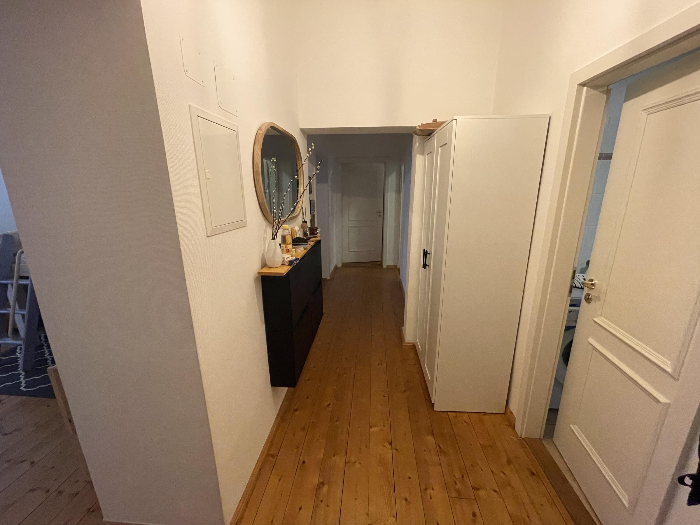 Unsere 100 m² große Wohnung befindet sich im Herzen von Berlin Mitte und überzeugt durch eine schlichte und minimalistische Einrichtung im skandinavischen Stil. Durch die eher dezenten und neutralen Erdtönen hat die Wohnung einen gewissen Altbau-Charme. Unsere Wohnung ist von morgens bis abends lichtdurchflutet. Wir sind die einzigen Bewohner im Haus, wodurch eine ungestörte und ruhige Atmosphäre besteht. In allen Räumen, außer der gefliesten Küche und des gefliesten Bad, ist Holzparkett verlegt worden, wodurch die Wohnung eine gewisse Wärme und Gemütlichkeit ausstrahlt. Wir freuen uns auf Ihre Anfrage.