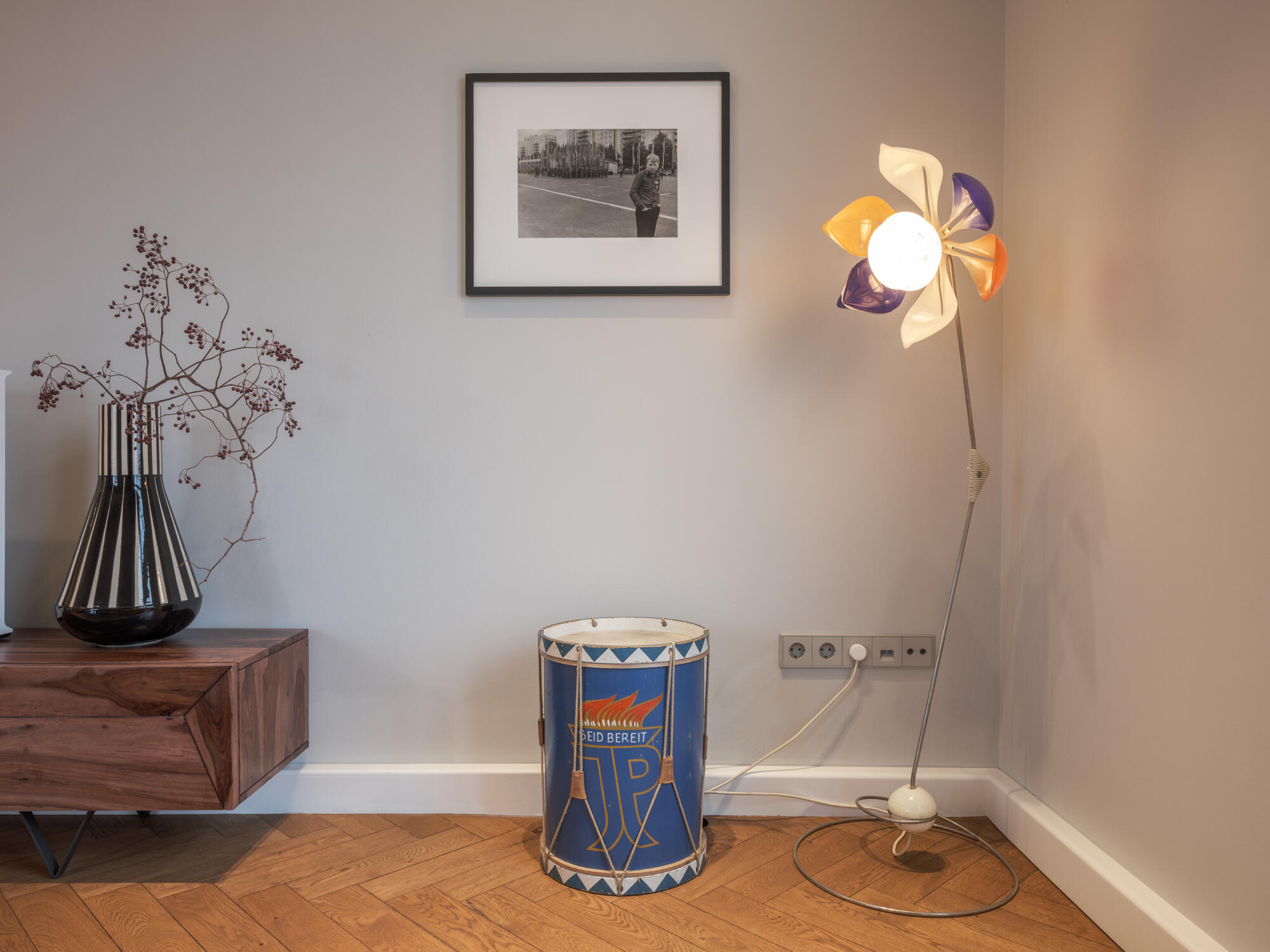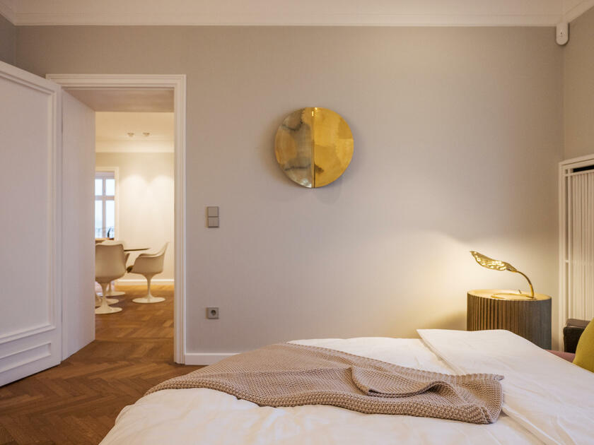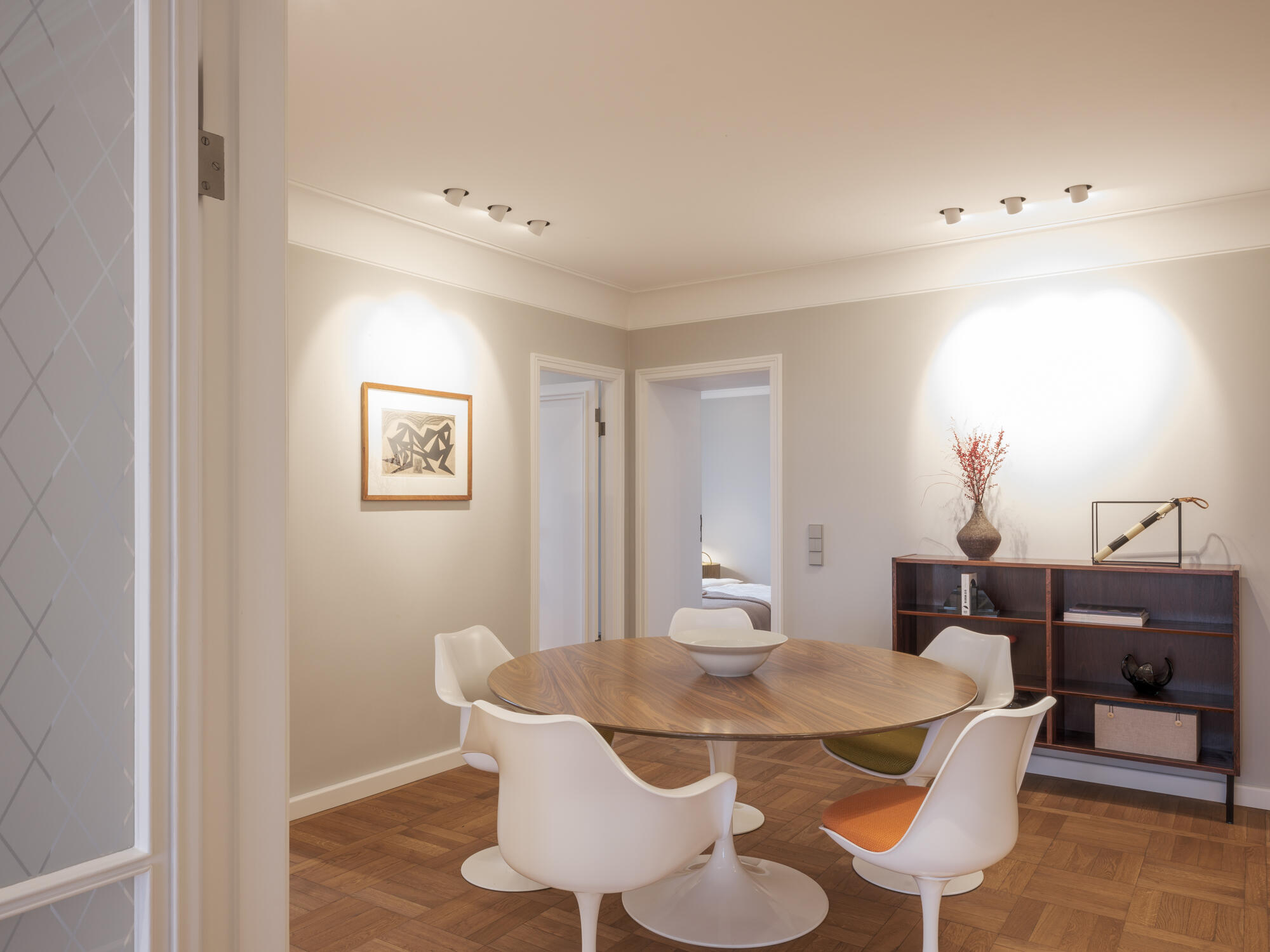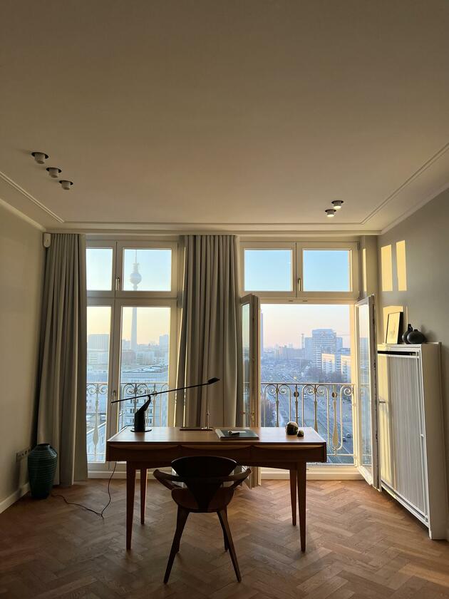Die stilvolle Wohnung befindet sich in der 11. Etage des "Henselmann-Tower" und besticht mit hochwertigem Design. Der Boden der hellen und modern eingerichteten Wohnung ist mit hochwertigem Eichen-Parkett verlegt. Der Wohnbereich teilt sich sternförmig in ein Arbeitszimmer und den Wohnraum. Der zentrale und große Essbereich bietet einen ikonischem Tulpentisch. Die bodentiefen Fenster lassen viel Sonnenlicht in die Räume. Die moderne Küche ist mit Marmor und Holzverkleidungen ausgestattet. Das Schlafzimmer ist mit einem runden Designer-Bett ausgestattet. Das Bad ist mit braunem Marmor und Walk-in Dusche großzügig gestaltet.