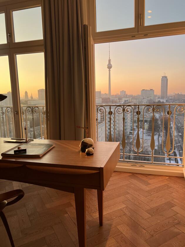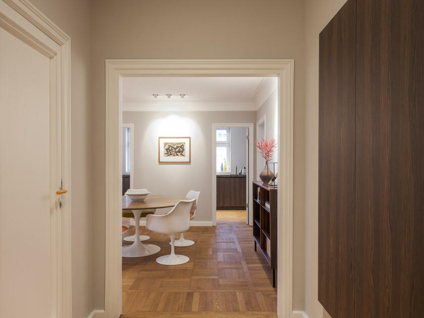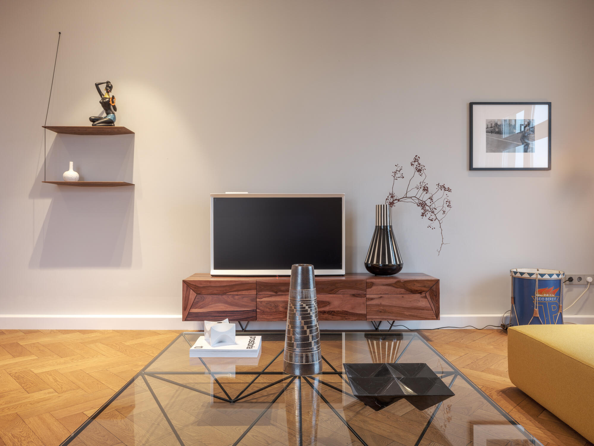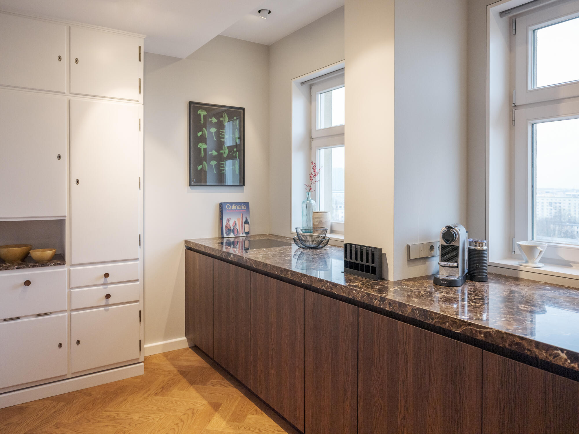 Die stilvolle Wohnung befindet sich in der 11. Etage des "Henselmann-Tower" und besticht mit hochwertigem Design. Der Boden der hellen und modern eingerichteten Wohnung ist mit hochwertigem Eichen-Parkett verlegt. Der Wohnbereich teilt sich sternförmig in ein Arbeitszimmer und den Wohnraum. Der zentrale und große Essbereich bietet einen ikonischem Tulpentisch. Die bodentiefen Fenster lassen viel Sonnenlicht in die Räume. Die moderne Küche ist mit Marmor und Holzverkleidungen ausgestattet. Das Schlafzimmer ist mit einem runden Designer-Bett ausgestattet. Das Bad ist mit braunem Marmor und Walk-in Dusche großzügig gestaltet.