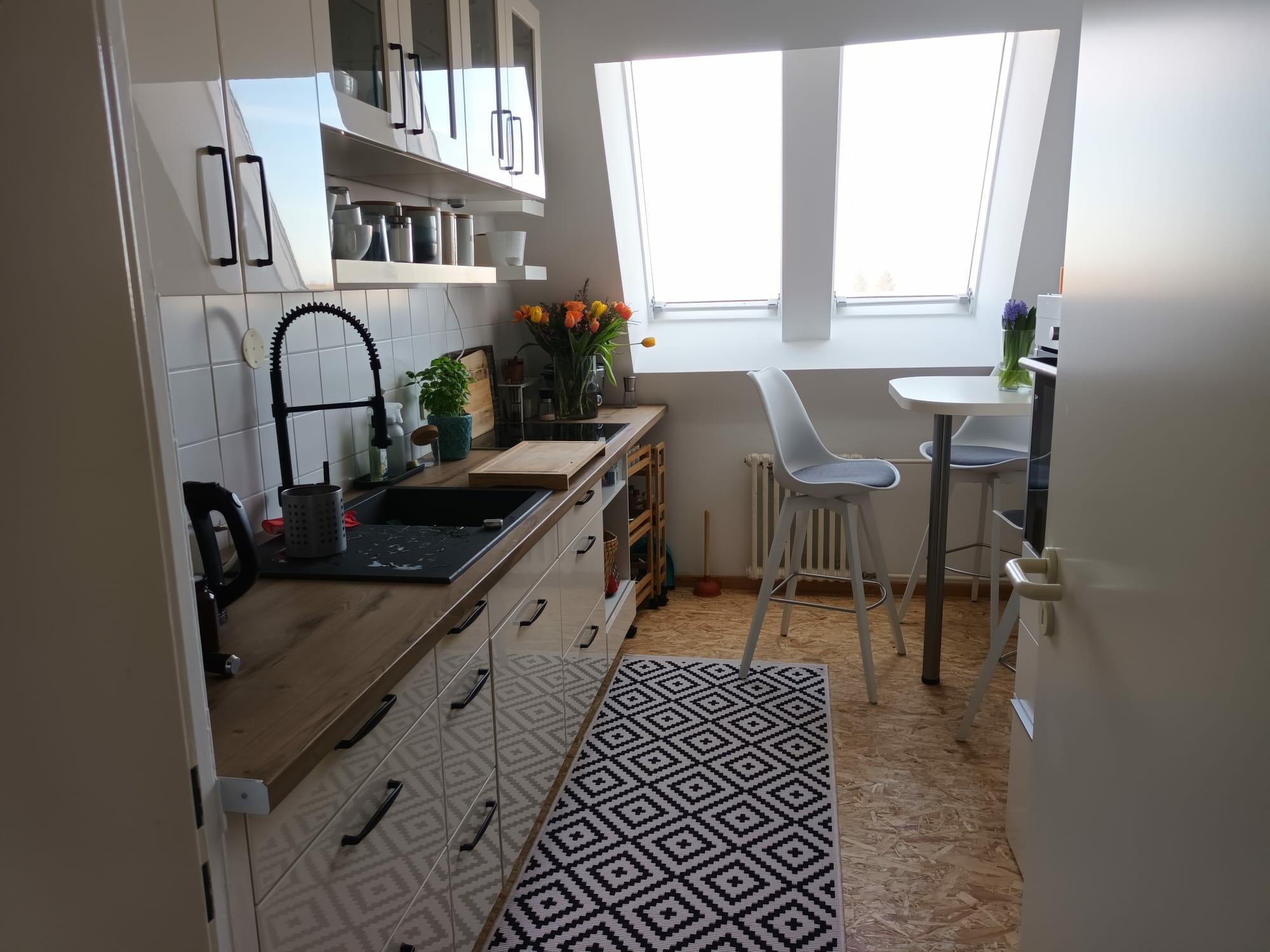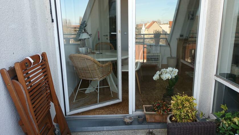 Meine 94 m² große Dachgeschosswohnung befindet sich in einem Neubau im Prenzlauer Berg. Durch die schrägen Dachfenster fällt viel Licht in die Räume meiner hellen Wohnung. An den Fenstern im Wohnzimmer sind keine Vorhänge oder Jalousien zur Abdunklung vorhanden. Die übrigen Fenster können nur partiell abgedunkelt werden.