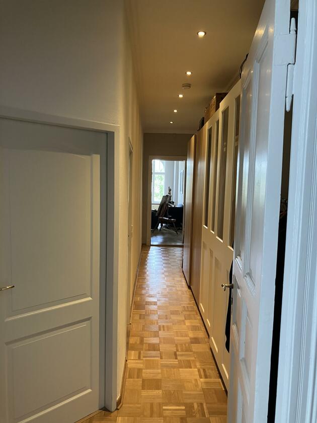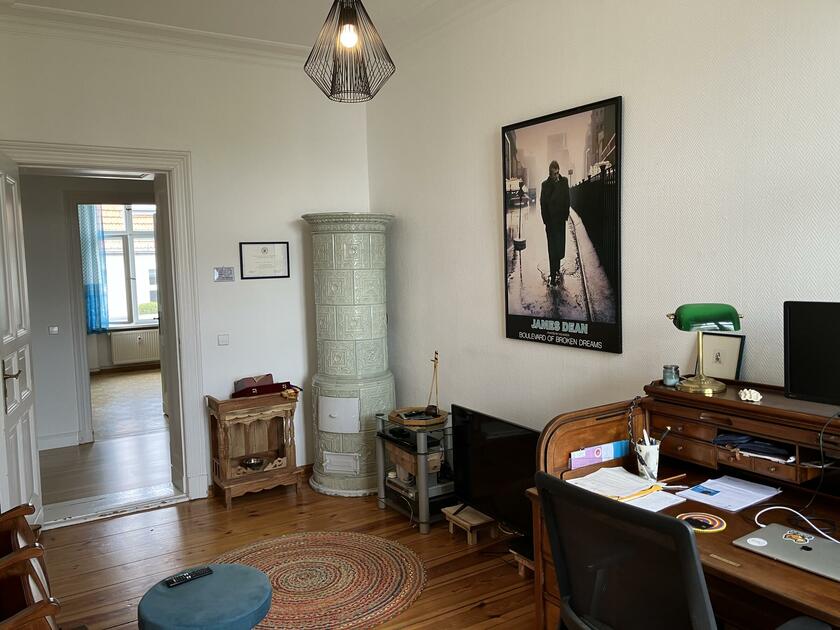 Die Altbauwohnung befindet sich im 4. Obergeschoss eines Wohnhauses, nahe dem Ku'damm. Die Wohnräume und Flure sind mit Parkett bzw. Dielen ausgelegt, die Küche und die Bäder sind gefliest. Das Wohnzimmer, der Salon, das Arbeitszimmer und der Balkon sind nach Westen, die Küche und das Gästezimmer sind nach Osten ausgerichtet. Das Schlafzimmer und die Badezimmer sind nach Süden ausgerichtet. Die Fenster können nicht verdunkelt werden. Es gibt lediglich leichte Vorhänge im Schlaf- und Gästezimmer. Das Arbeitszimmer ist mit einem dekorativen antiken Kachelofen ausgestattet. Der Hauptblickfang im Wohnzimmer ist eine original Ricksha aus Kalkutta, die nach Bedarf umgestellt werden kann. Die Kunst stammt von dienstlichen Aufenthalten in Indien, Haiti, Kanada und Europa. Öffentliche Parkplätze finden sich auf der Straße.