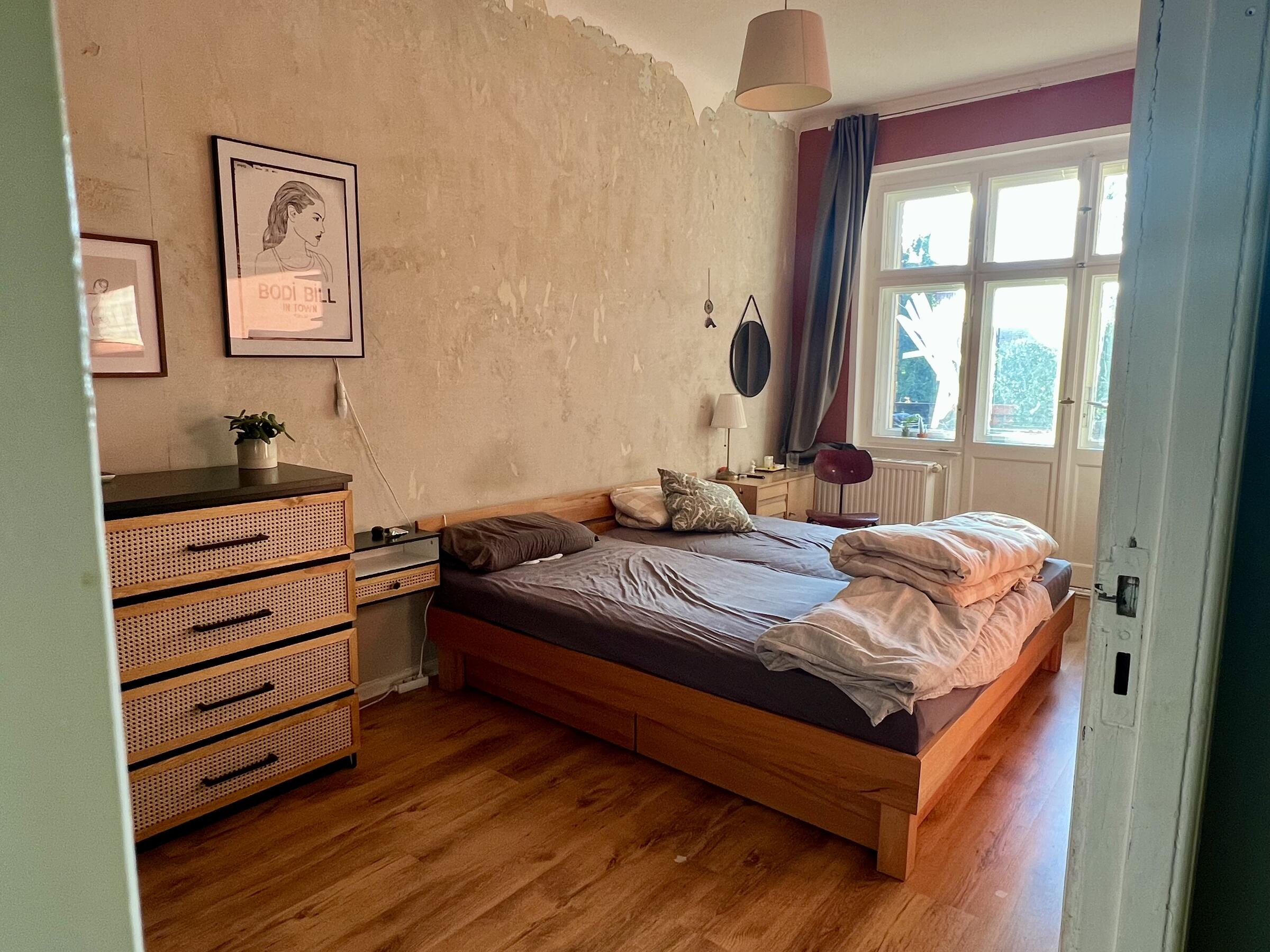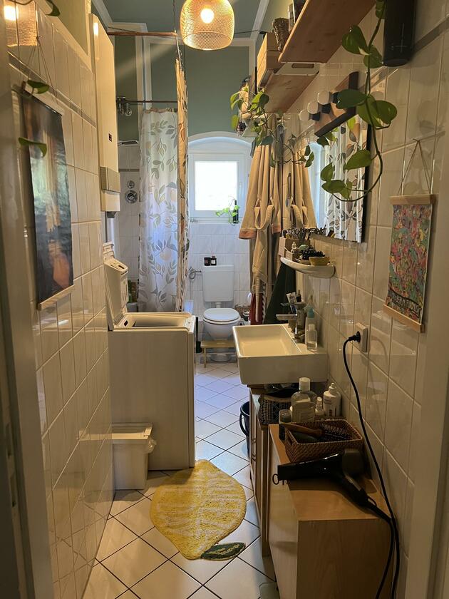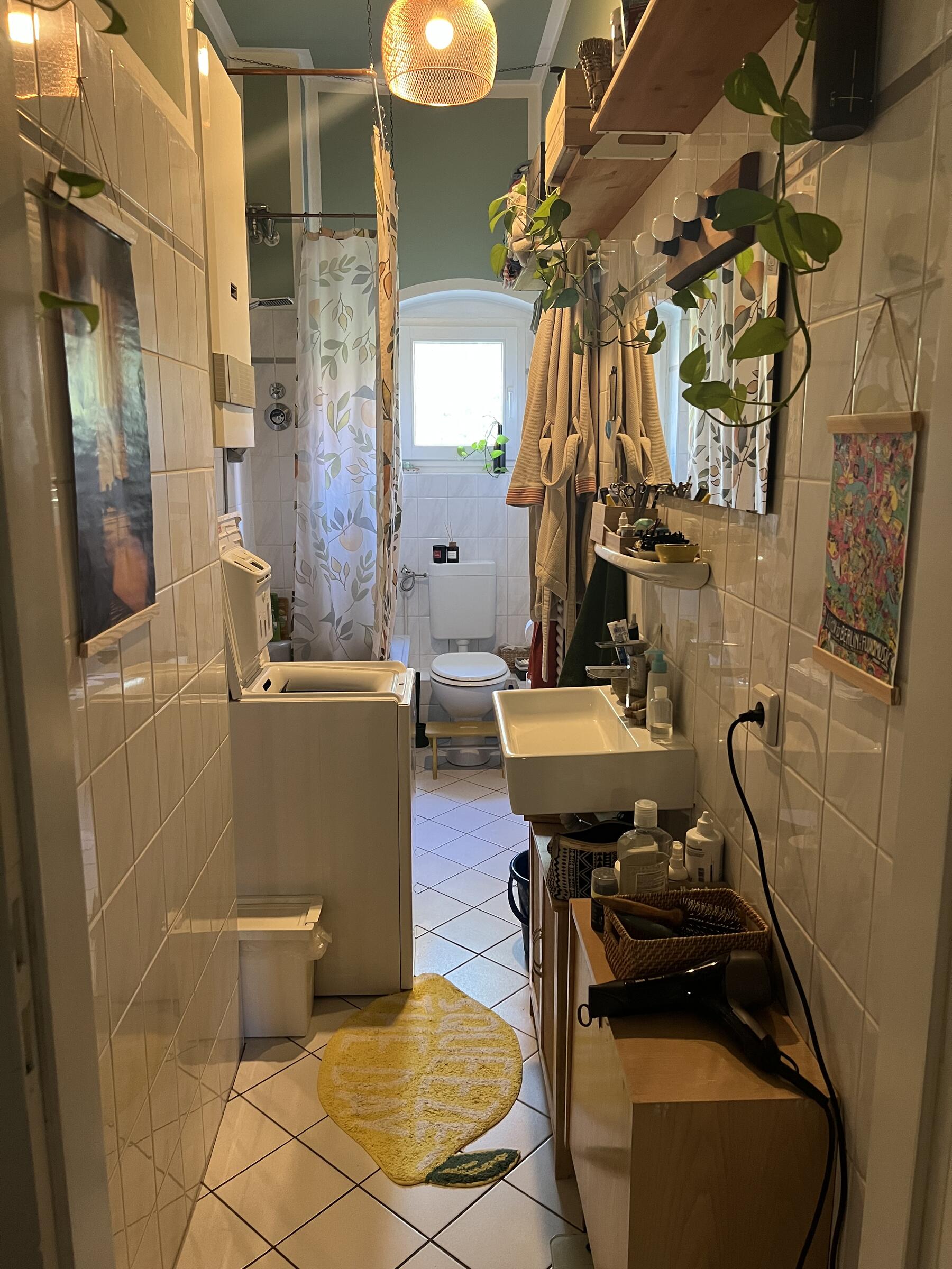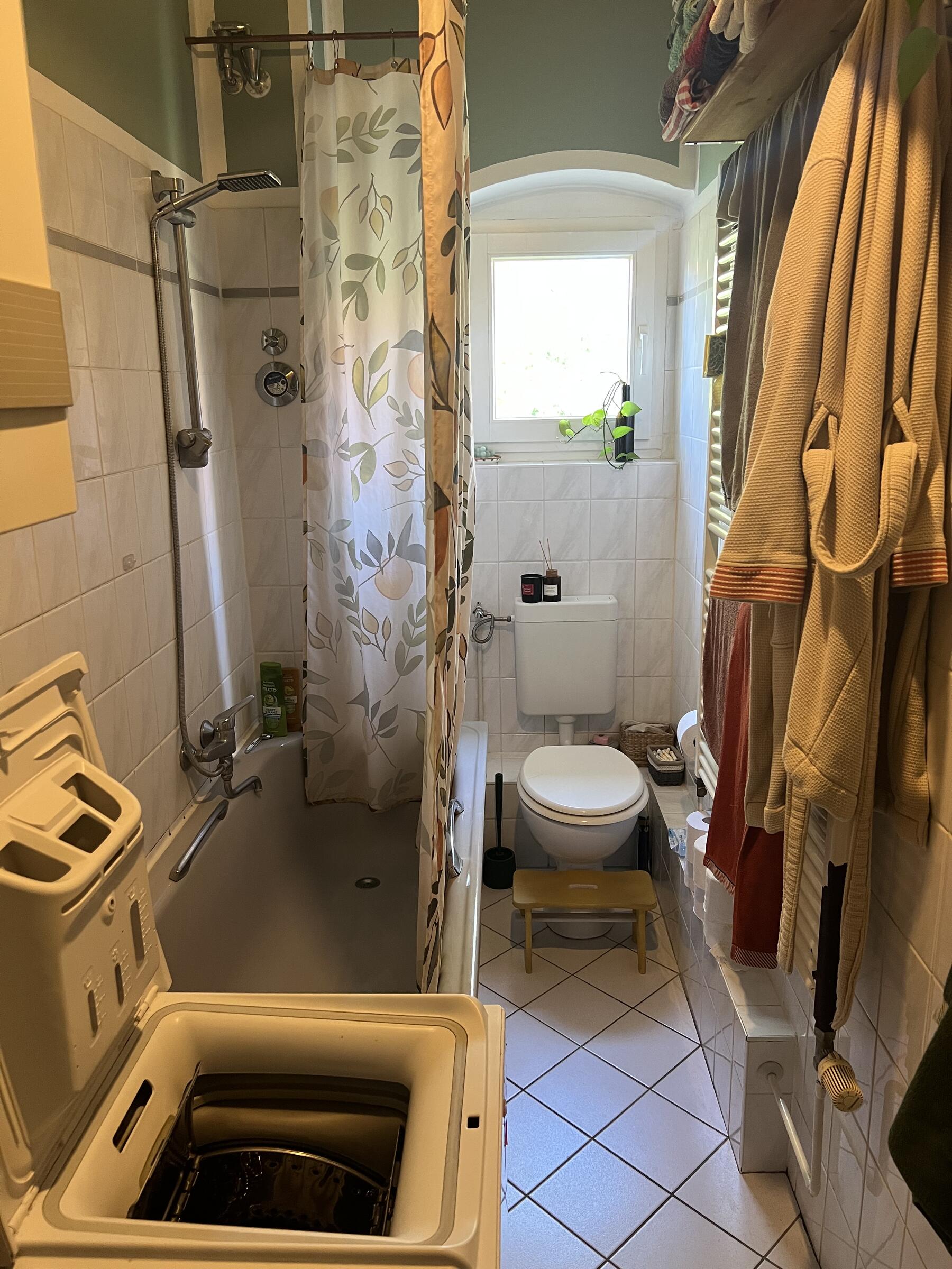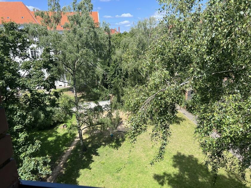 Unsere Wohnung befindet sich in einem Mehrparteienwohnhaus im Prenzlauer Berg. Die Räume sind gemütlich eingerichtet. Am Vormittag fällt viel Sonnenlicht in das Wohnzimmer und das Arbeitszimmer. Am Nachmittag sind vor allem die Küche und das Schlafzimmer lichtdurchflutet. Die Fenster können teilweise mit Rollos und Vorhängen abgedunkelt werden. Auf den Böden der Wohnräume ist Laminat verlegt. Das Badezimmer und die Küche sind gefliest. Ein kleiner Balkon kann ebenfalls genutzt werden. Parkplätze bestehen direkt vor dem Haus an der vorbeiführenden Straße und in näherer Umgebung.