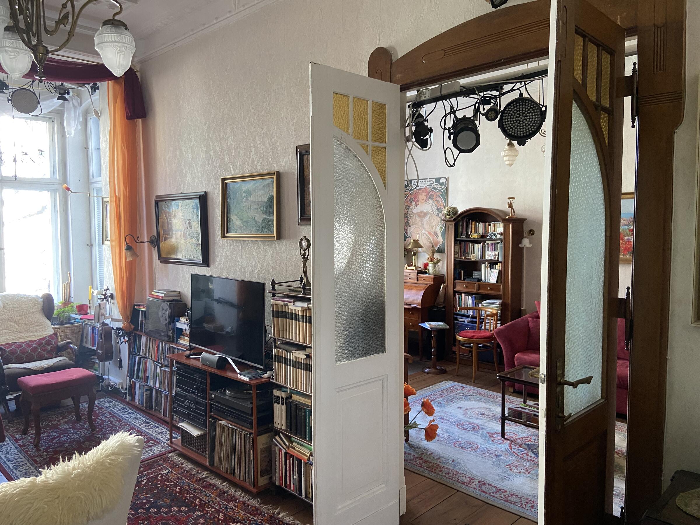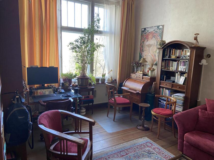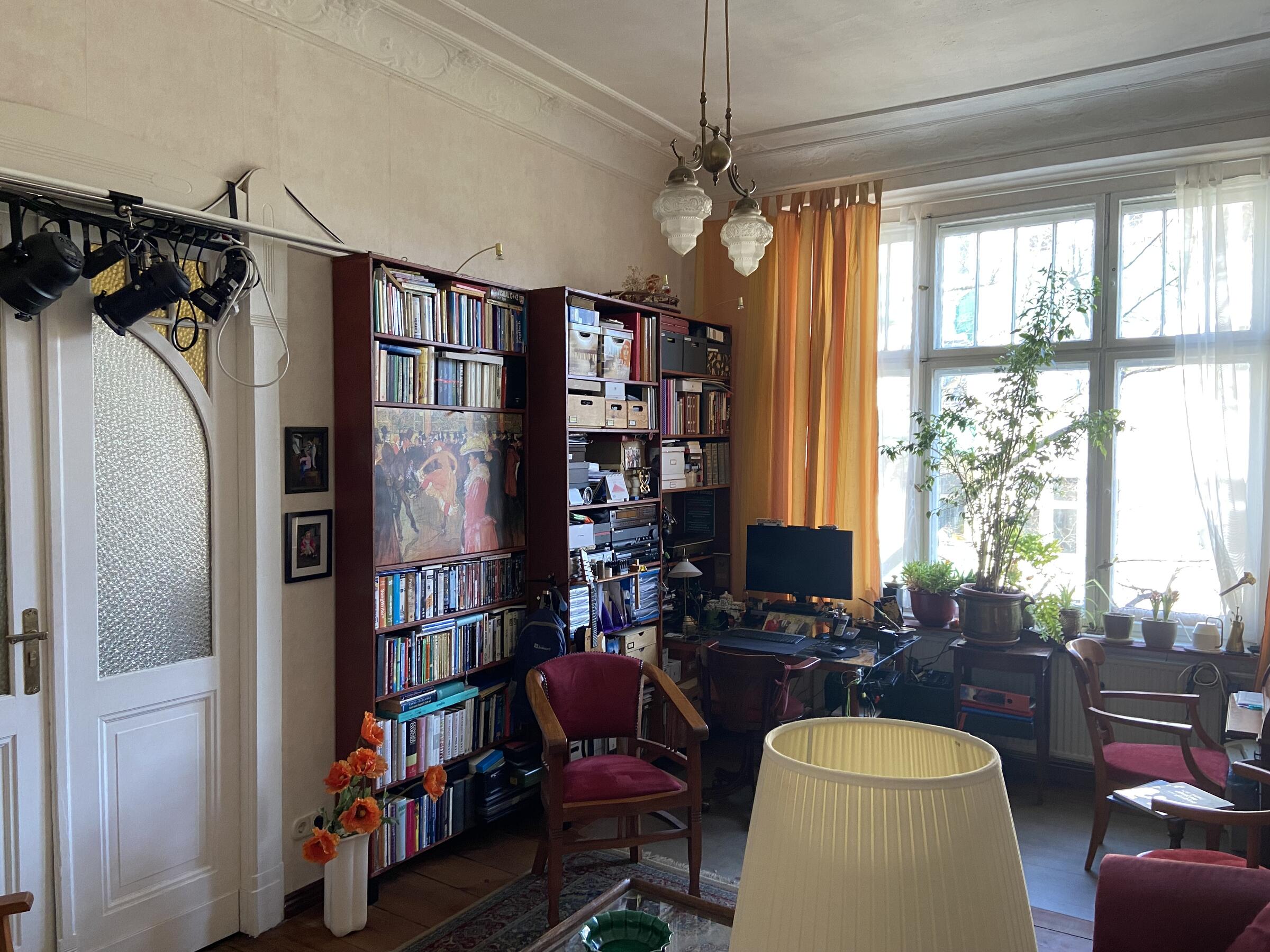 Meine typische Berliner Altbauwohnung befindet sich in an einer ruhigen Nebenstraße im Ortsteil Schöneberg, unweit des Bahnhofes Südkreuz. Die Räume sind individuell im Stil der 1920er und 1930er Jahre eingerichtet und durch mehrflügelige, verglaste Türen miteinander verbunden. Alte Kachelöfen und viele unterschiedliche Instrumente gehören ebenfalls zur Wohnung. Die Fenster können teilweise mit Vorhängen abgedunkelt werden. Auf den Böden der Wohnbereiche sind Dielen verlegt und an den Decken gibt es Stuckverzierungen. Öffentliche Parkplätze bestehen vor dem Wohnhaus an der Straße.