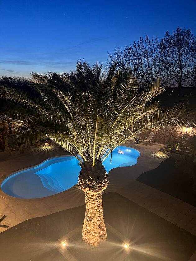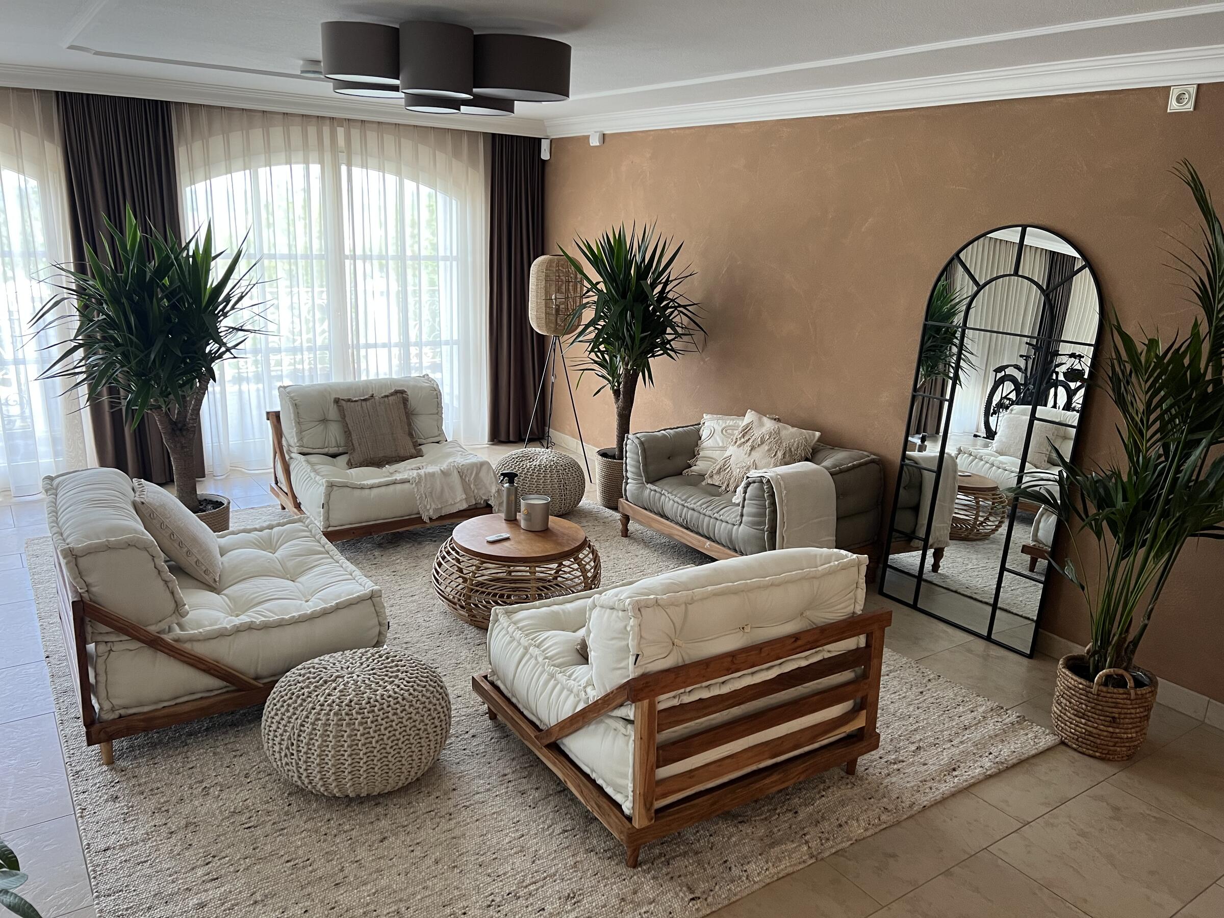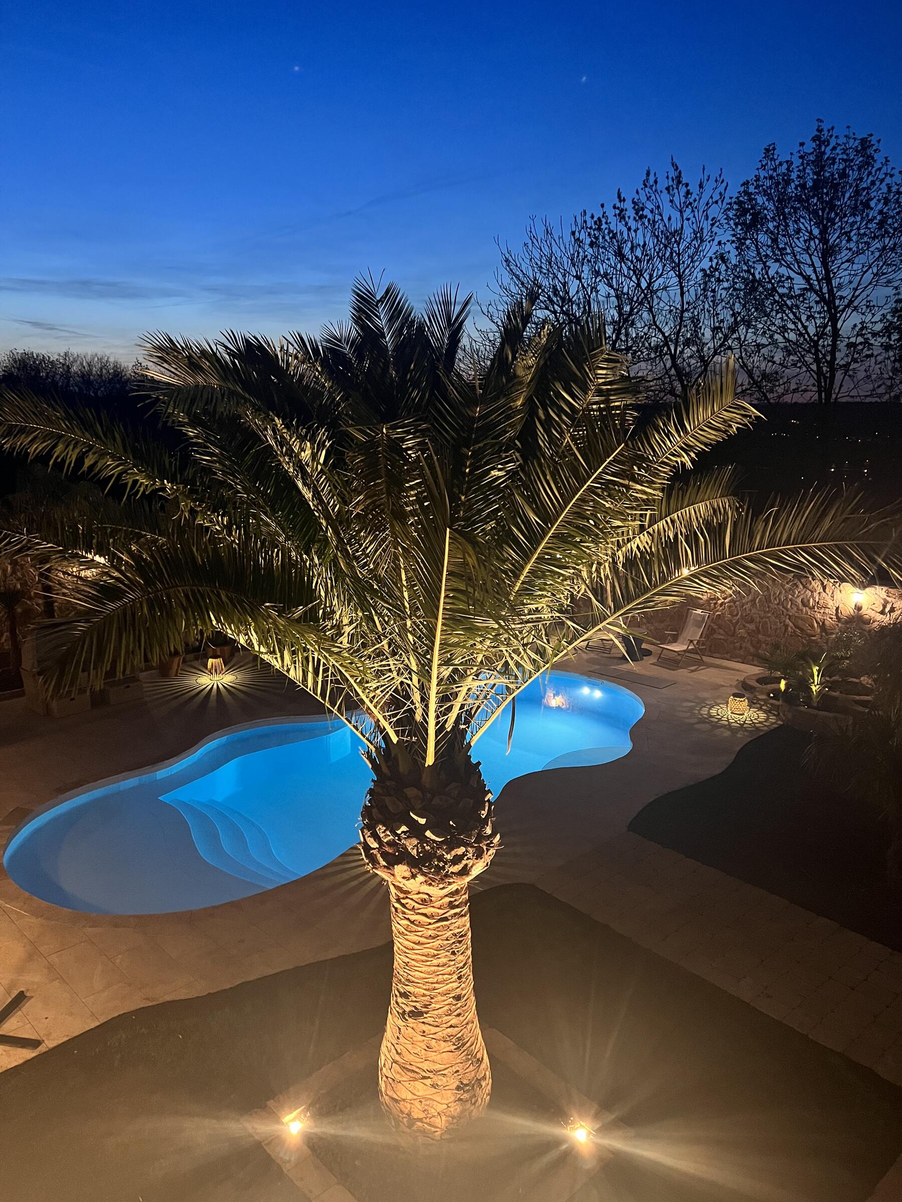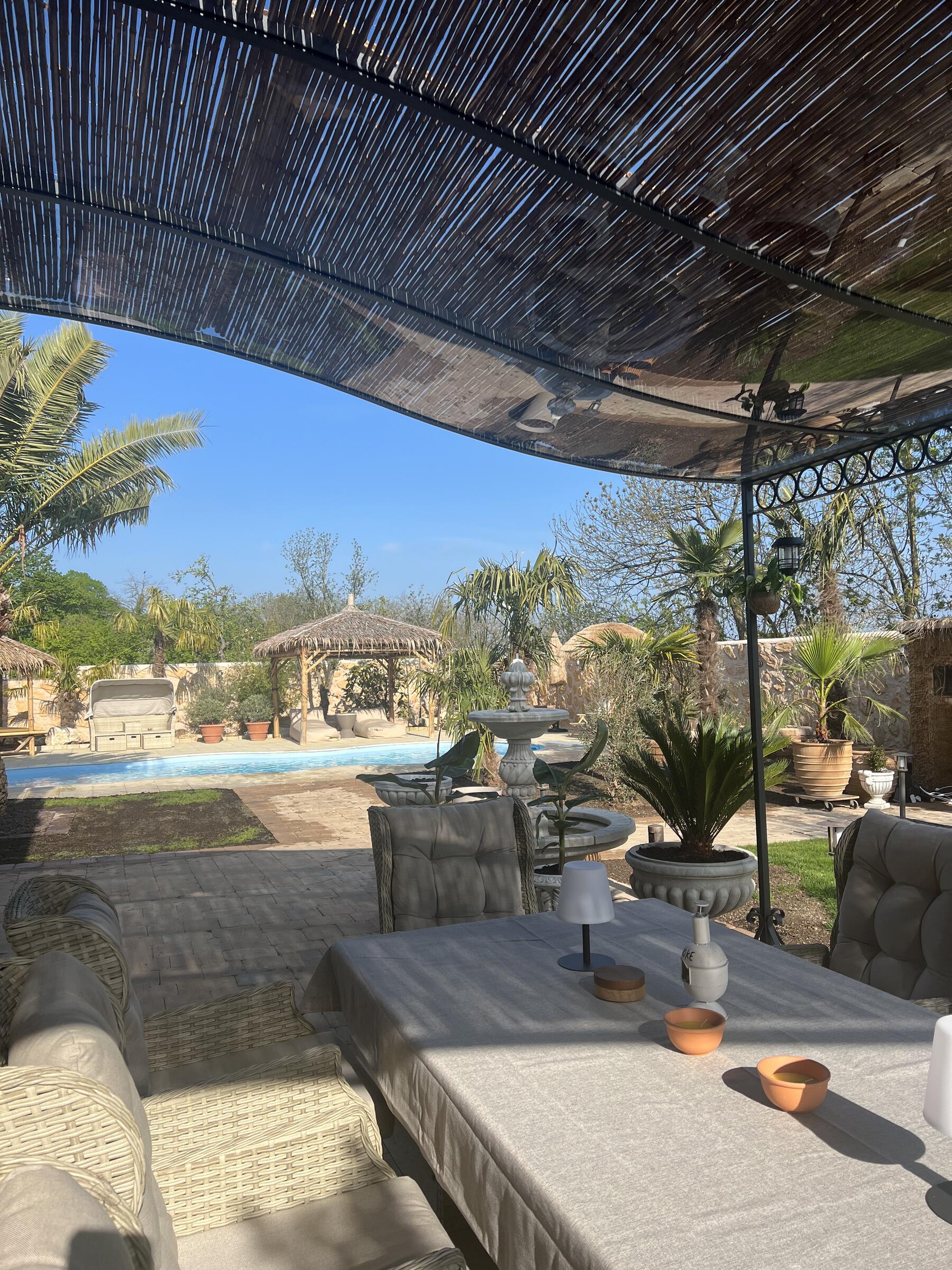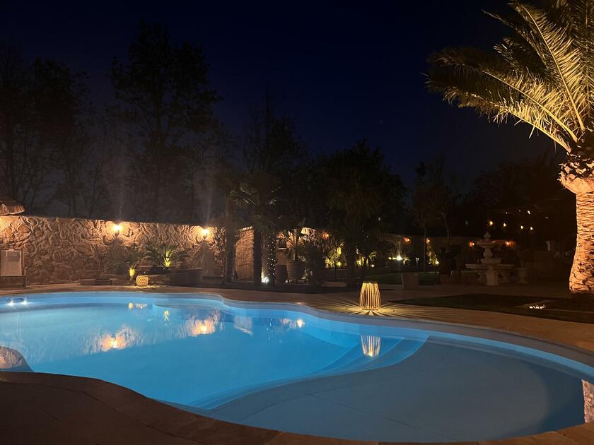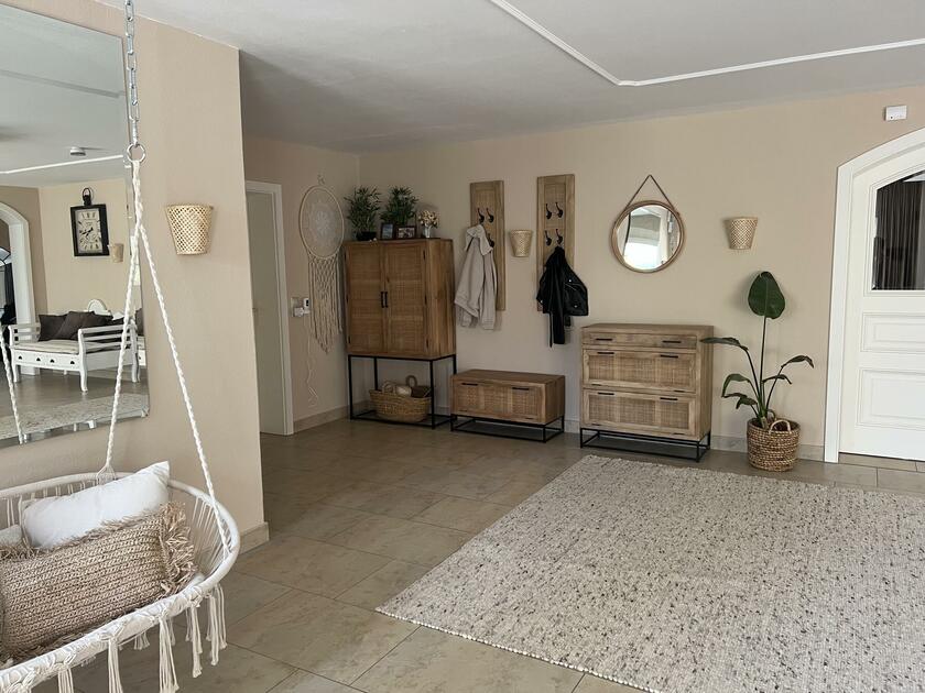 Unser Haus bietet viele große und offene Räume mit mediterranem Einrichtungsstil. Die Räume sind hell und lichtdurchflutet. Die Fenster der Räume sind abdunkelbar. Der großzügige Wohn- und Essbereich mit seiner modernen Küche hat direkten Zugang zum Garten. Der große und mediterran gestaltete Garten bietet einen Pool, Palmen und Olivenbäume. Die Terrasse wird von einer Pergola trocken gehalten. Der Garten ist durch seine Lage nach hinten für niemanden einsehbar und ermöglicht somit ungestörte Produktionen. Parkplätze gibt es im Außenbereich und auf der Straße vor unserem Grundstück.