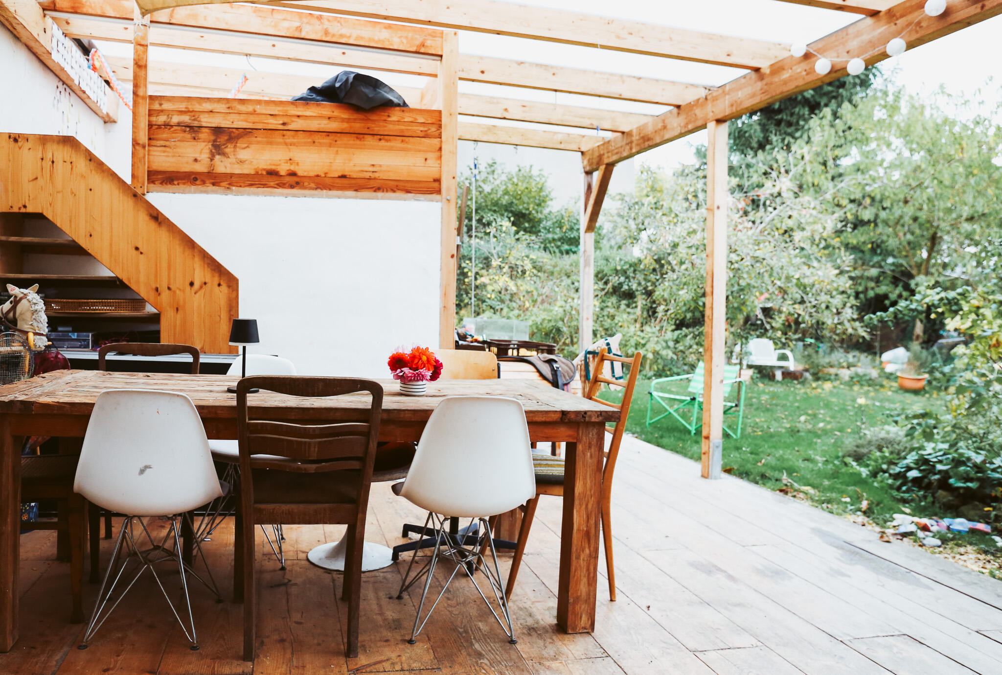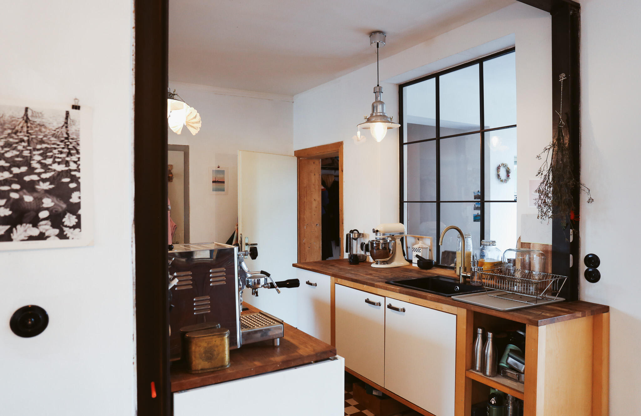 Im Inneren unseres Hauses erwartet Sie ein offener und lichtdurchfluteter Wohn- und Essbereich mit direktem Zugang zum Garten. Große Fenster schaffen fließende Übergänge. Die Einrichtung vermittelt eine warme Atmosphäre. Die Räume dürfen nach Absprache umgestaltet werden. Im Außenbereich stehen neben dem großzügig angelegten Garten auch eine überdachte Terrasse mit Kamin und einer gemütlichen Sitzecke zur Verfügung. Die an die Terrasse angrenzende Werkstatt kann ebenfalls für Produktionen genutzt werden. Sowohl direkt vor dem Haus als auch in der Straße können mehrere Autos geparkt werden.