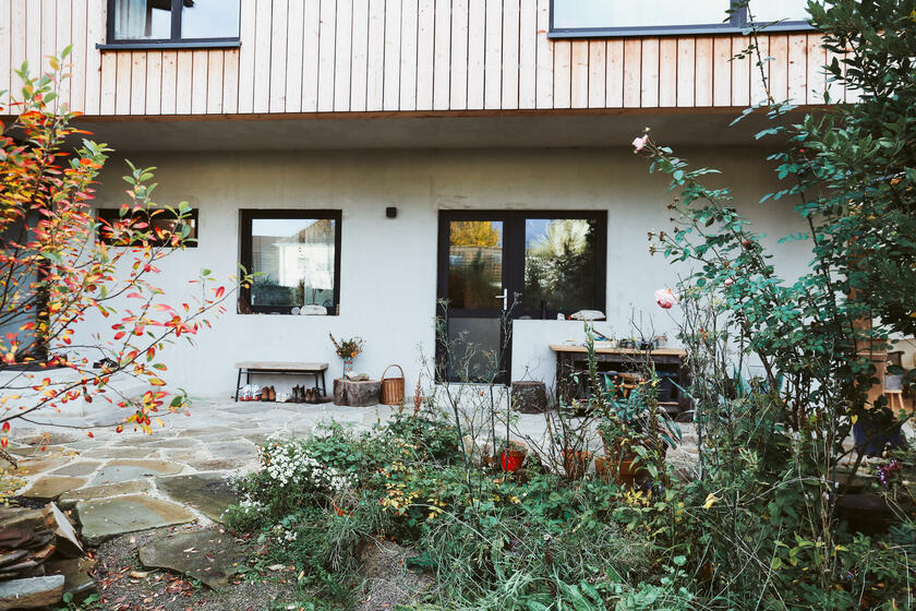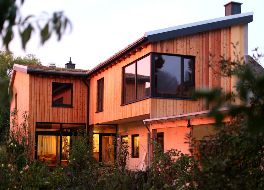 Unsere klimafreundlich sanierte Doppelhaushälfte befindet sich in einer ruhigen Wohngegend. Das Haus hat eine Holzfassade und ein vollständig begrüntes Dach.