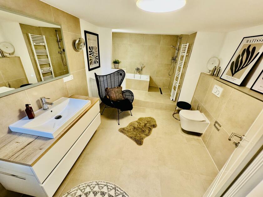 - Badezimmer (1. UG)Fläche: 13 m²Länge: 5 mBreite: 2,6 mHöhe: 2,2 mmöbliert: ja