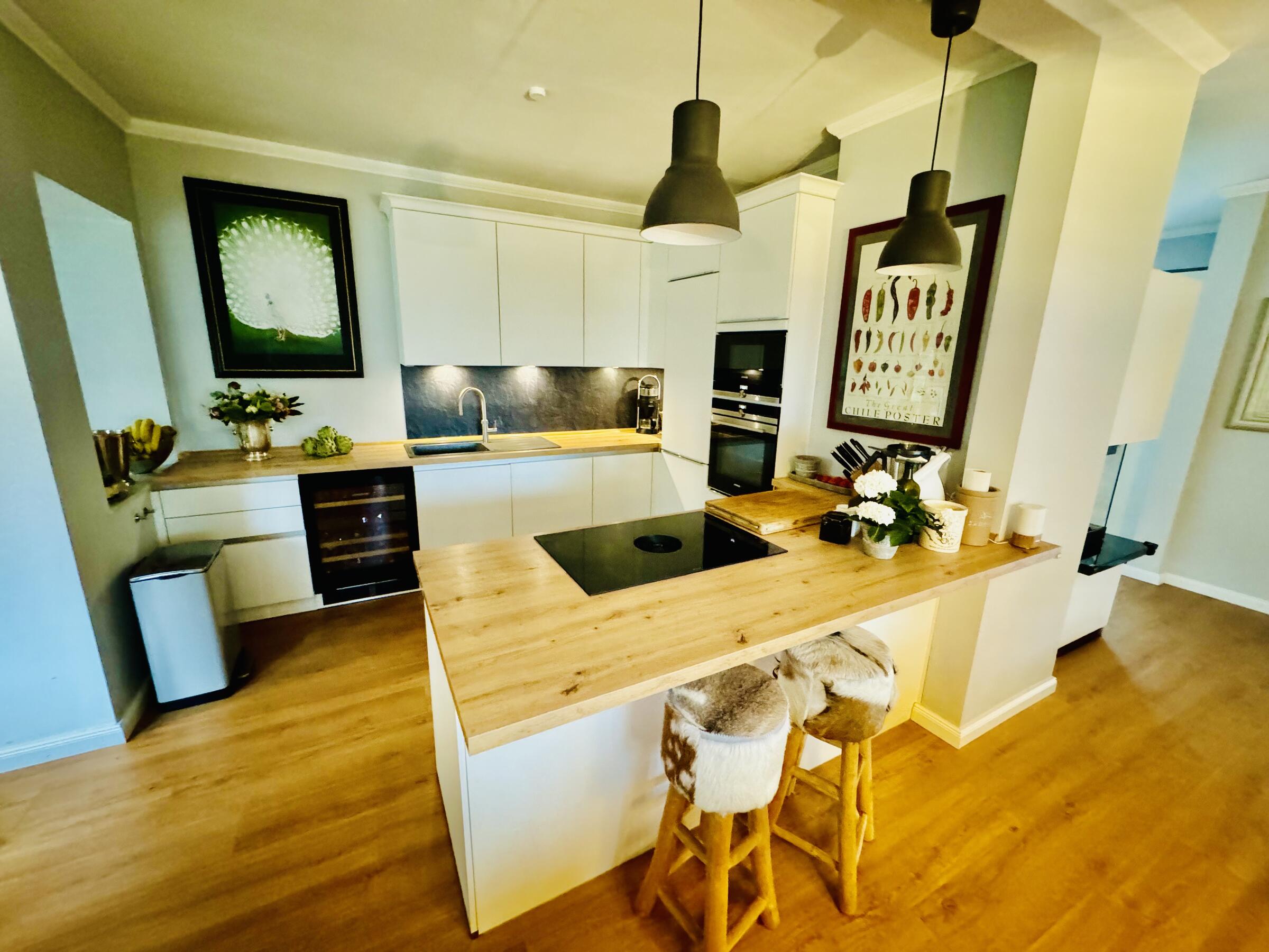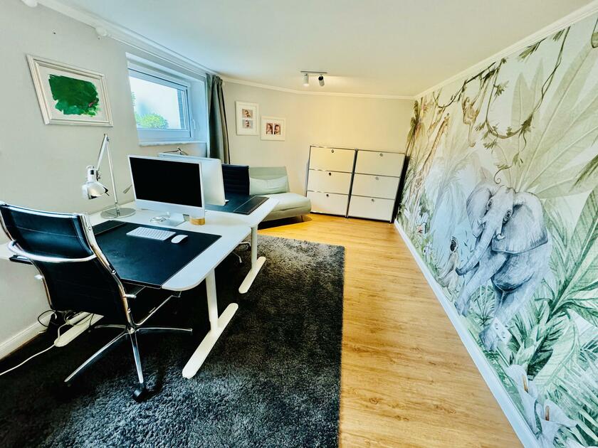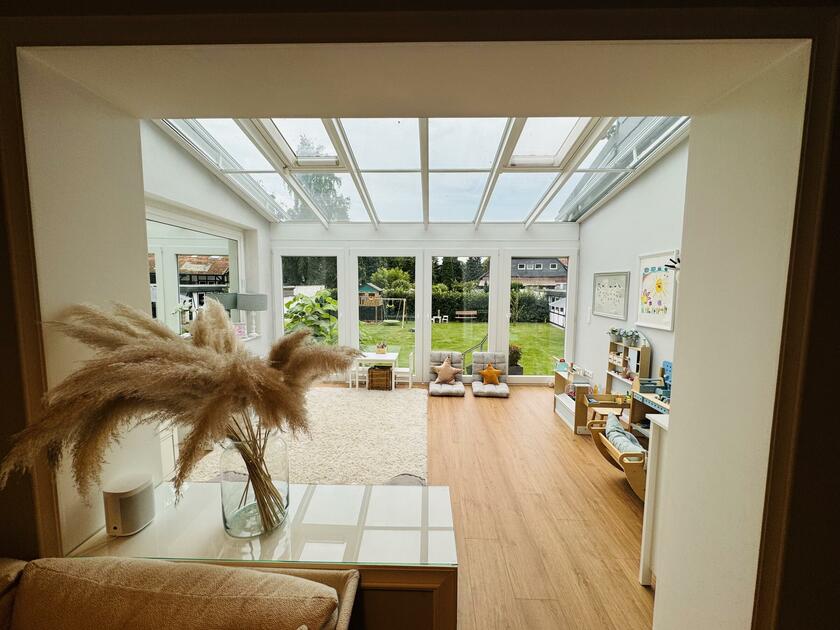 Das Entrée des Hauses besticht durch eine räumliche Großzügigkeit und schließt mit einem großen, offenen und lichtdurchfluteten Wohn- und Essbereich mit offener Küche im Hochparterre an. Die Küche ist hochwertig und vollausgestattet, nebst Liebherr Wein-Klimaschrank. Die schlichte weiße Küche in Kombination mit Arbeitsflächen in Holzmaserung besticht durch ihren zeitlosen Stil. Am großen Naturholz-Esstisch finden bis zu 8 Personen großzügig Platz. Auf dieser Etage befindet sich weiterhin der vollverglaste Wintergarten, den wir für unsere Kinder als helles und lichtdurchflutetes Spielzimmer nutzen. Die Helligkeit lässt sich mit einer automatischen Markise und Jalousien dimmen. Der Kubus Kamin mit Panoramagläser zeigt das danebenliegende Kaminzimmer, in dem über Eck eine weiße Coach der Seefelder Manufaktur steht. Dieser gesamte raumübergreifend offene Bereich auf der Ebene endet im Kaminzimmer. Dahinter liegen ein Schlafzimmer, ein Kinderzimmer, und ein Duschbad mit Walk-In Regendusche in Limestone Optik. Zudem geht es hier zum 80 m² großen Keller, dieser ist hier nicht mit Bildmaterial aufgeführt, kann aber auch genutzt werden.