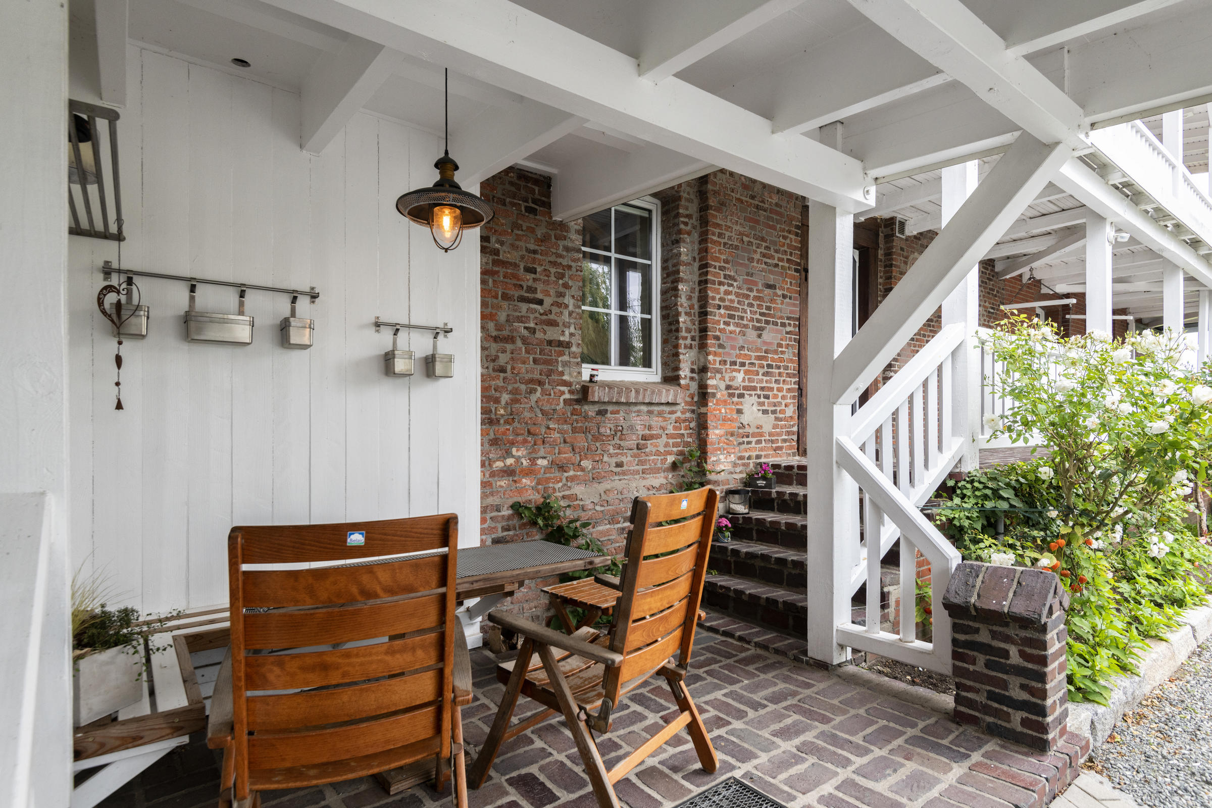 Bei dem angebotenen Objekt handelt es sich um eine alte Bockwindmühle aus dem Jahre 1683 die aufwendig und mit viel Liebe fürs Detail umgebaut wurde. Die Hauptwohnung des Landhauses mit ca. 180 m² wird vom Eigentümer selbst bewohnt und steht für Film- und Fotoproduktionen zur Vermietung zur Verfügung. Wenn man die Hauptwohnung betritt, steht man gleich im Koch- und Essbereich. Die Küche ist eine helle Küche und besitzt eine schöne große Kochinsel. Ein großer Esstisch bietet Platz für 8 Personen die Balkenlage an der Decke, der Kaminofen und das in die Wand eingelassene Mühlrad schenken dem Raum viel Gemütlichkeit. Zwei Glastüren lockern den Raum auf, diese führen einmal in den im Anbau befindlichen Hauswirtschaftsraum und einmal ins Gästebad mit Dusche. Eine zusätzliche Terrassentüre ermöglicht den direkten Zugang über eine kleine bedachte Terrasse direkt in den Garten. Der Treppenaufgang zum Wohnzimmer ist aufwendig dekorativ und erinnert an den Ursprung des Gebäudes. Im Wohnzimmer selbst befindet sich ein großer Kamin sowie eine Transfusion mit alter Technik aus der Bockwindmühle, zusätzlich findet sich auch hier ein eingebauter Mühlenstein wieder. Ausgestattet ist das Wohnzimmer mit einer XXL- Couch und einer Heimkinoanlage sowie dem dazugehörigen Soundsystem. Eine Terrassentüre führt aktuell noch auf das Dach des Anbaues, hier ist allerdings eine Terrasse in weiß geplant. Eine weitere Holztreppe führt dann in das ca. 40 m² große Schlafzimmer, mit einer schönen Schlafecke in der genau ein Bett (180x200) Platz hat. Hinter den Glastüren befindet sich einmal der begehbare Kleiderschrank und zum anderen das Duschbad. Besonders hervorzuheben ist hier die Raumhöhe, die Decke ist bist unter den Giebel ausgebaut.