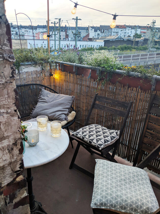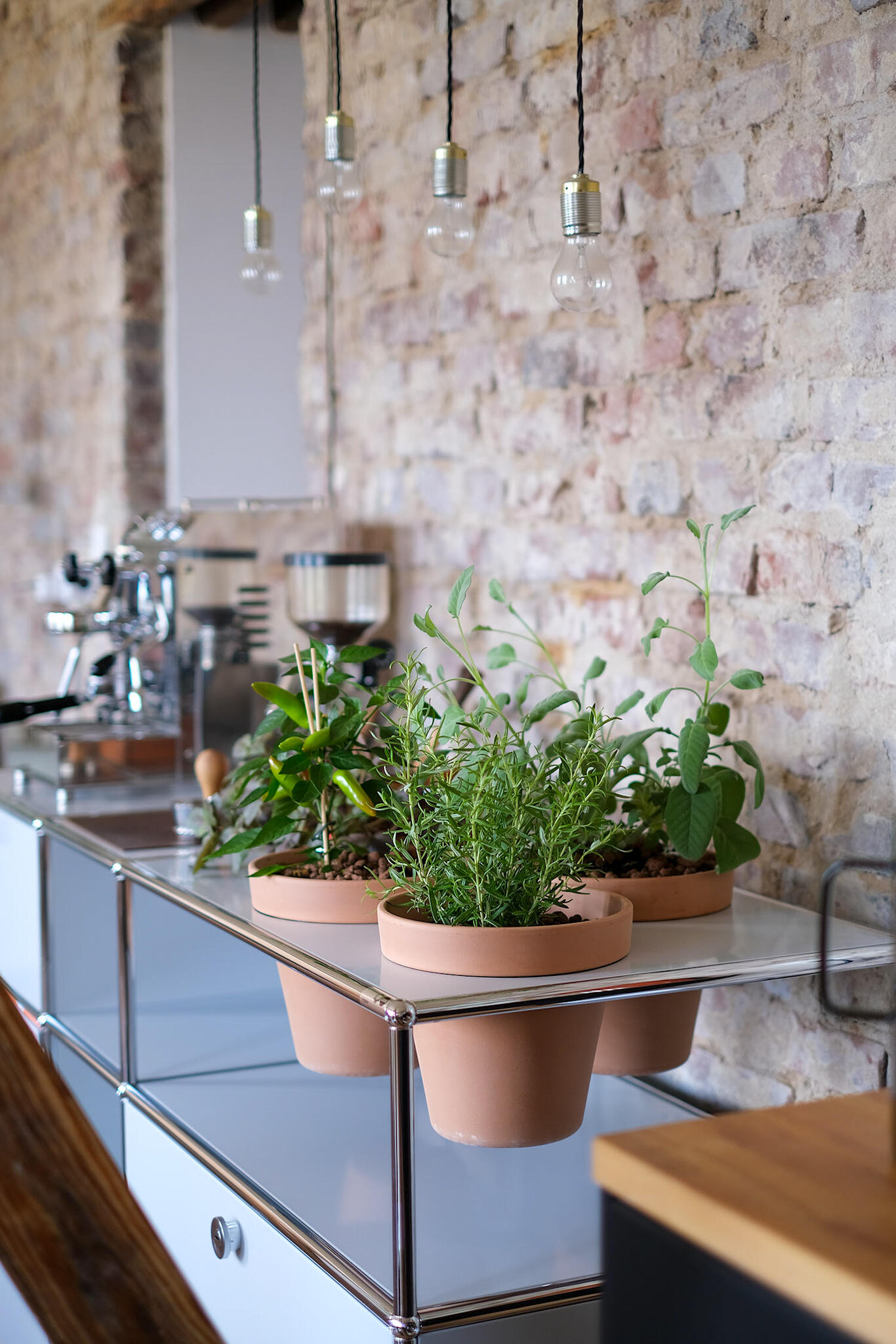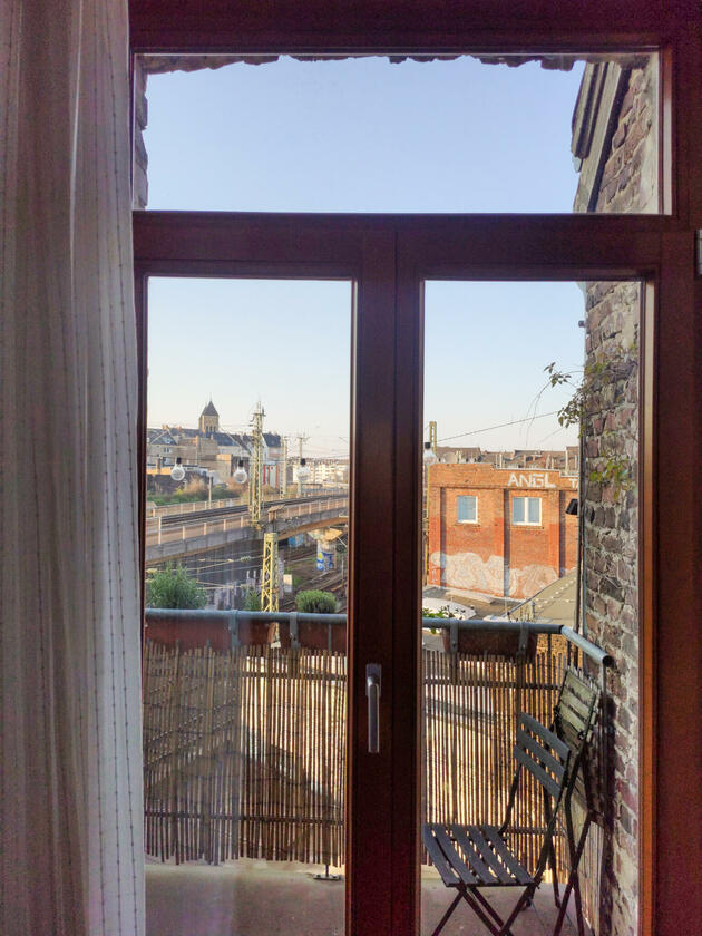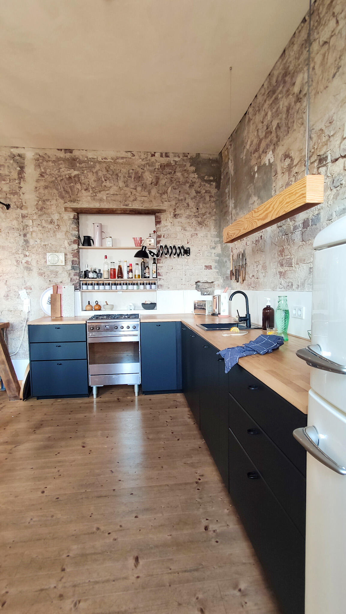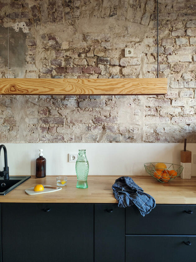 Was unsere Wohnung in Düsseldorf so besonders macht, ist eine absolut einzigartige Atmosphäre durch offene Balken, Backsteinwände und Dielenboden in Kombination mit "echtem" Leben. Zwar haben wir berufsbedingt als Designer einen Faible für Designermöbel und besondere Accessoires, unsere Wohnung wirkt allerdings alles andere als "clean", im Gegensatz zu vielen anderen Lofts, die ausschließlich für den Zweck der Vermietung dekoriert wurden. Selbstgebaute Lampen, Erbstücke und moderne Möbelstücke wirken in Kombination authentisch und gemütlich, ohne die helle Leichtigkeit eines Lofts einzubüßen. Der Wohn-, Ess- und Küchenbereich ist durch insgesamt 4 große Fenster mit Südausrichtung, sehr hell. Deshalb haben wir uns für eine moderne matt-schwarze Küche entschieden, die in Kombination mit den Backsteinen sehr edel wirkt. Rustikale Elemente, wie unser Gasherd, die Werkbank als Coffeecorner für die Siebträgermaschine und das 60er-Jahre Buffet meiner Oma wirken als charakteristischer Kontrast zur cleanen Küchenzeile. Die großzügige Küche mit langer Tafel, bestehend aus 2 alten Tischen, wirkt sehr luftig, das Wohnzimmer mit großer Couch und Schaukelstuhl dagegen eher kuschelig.