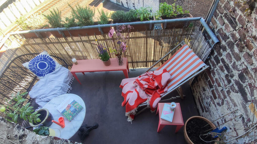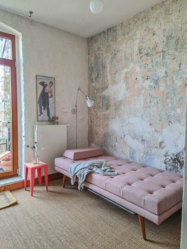 Auf der gegenüberliegenden Seite der Wohnung befinden sich Schlaf- und Gästezimmer. Klein aber fein ist das Gästezimmer mit einer unverwechselbaren Wand, welche die Farbschichten der vergangenen 140 Jahre zum Vorschein bringt, denn genau so alt ist das Haus. Das rosa Daybed passt perfekt zum Look. Vom Gästezimmer gelangt man auf den kleinen Balkon mit urbanem Blick auf die Gleise. Das Schlafzimmer beherbergt neben einem modernen Holzbett, eine alte Truhe, welche vor der freigelegten Backsteinwand die Pflanzen in Szene setzt, sowie eine offene Kleiderschrank-Situation.