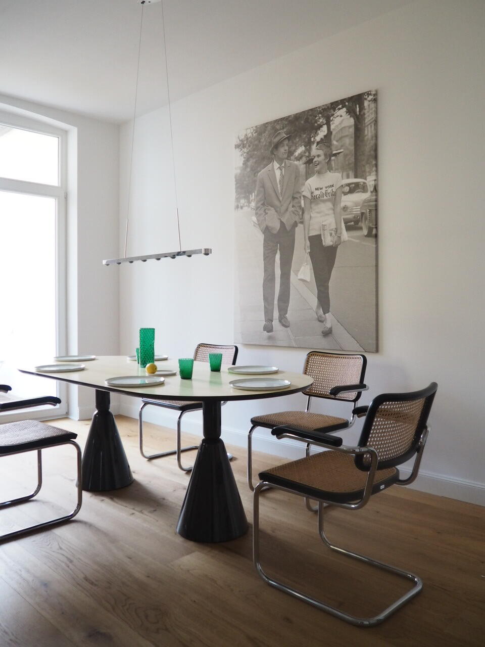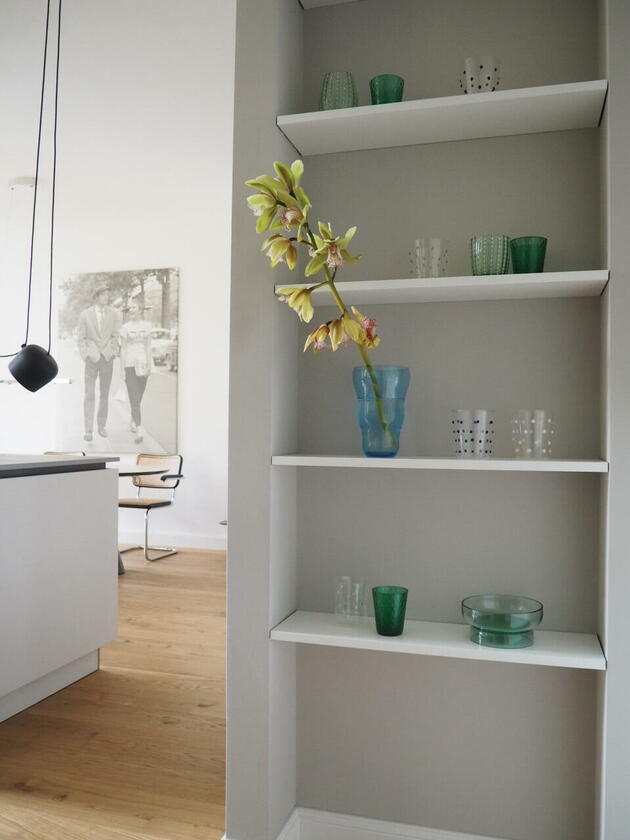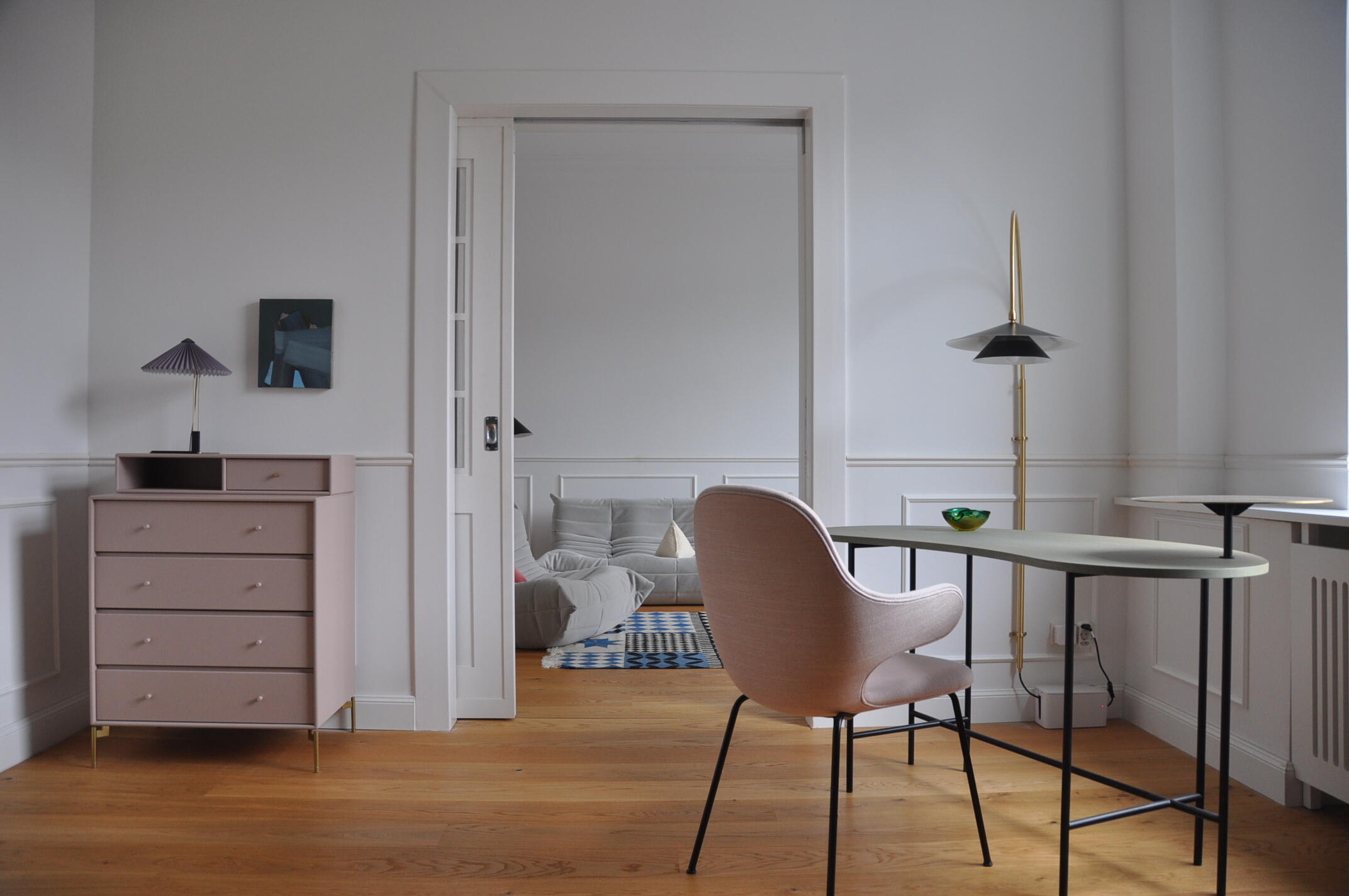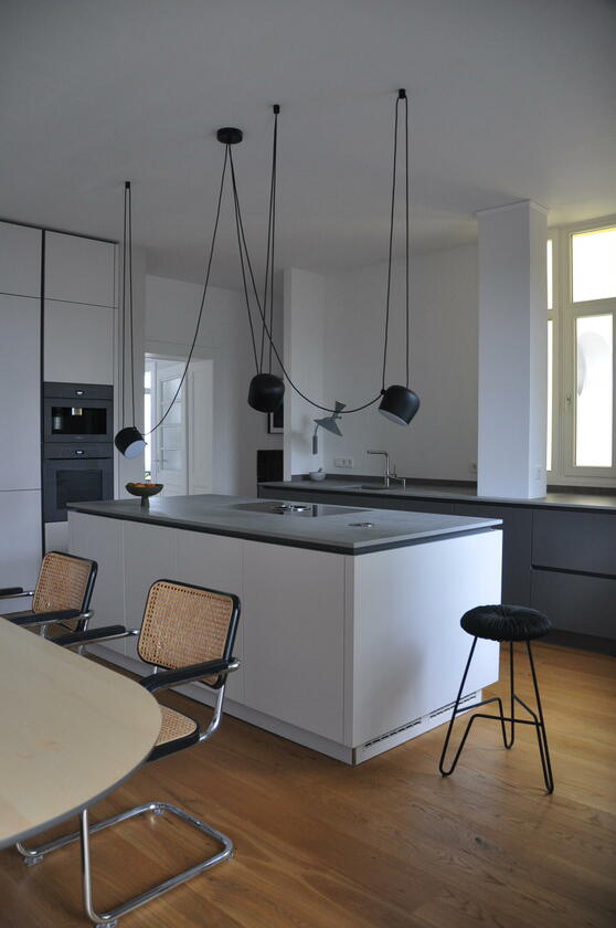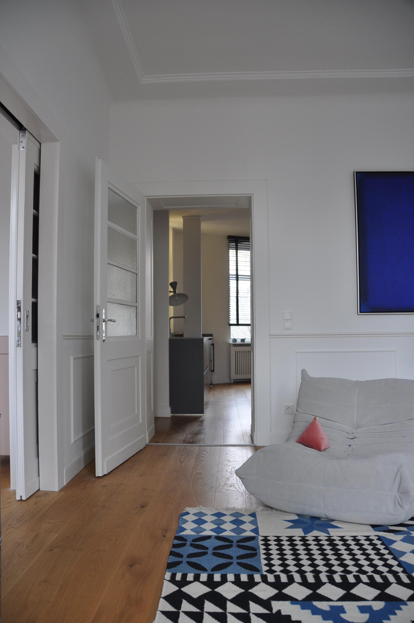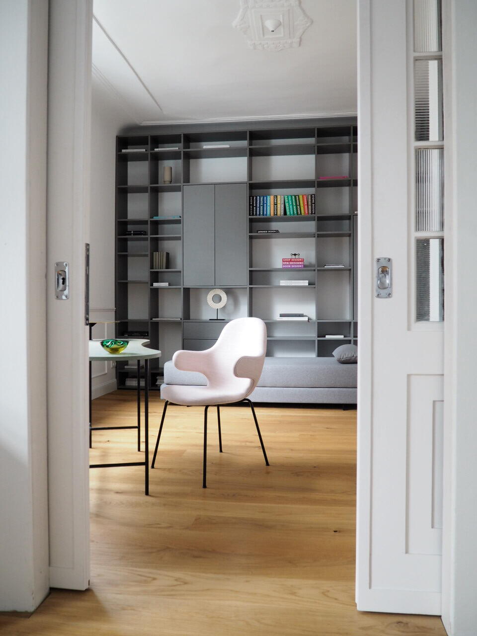 Meine 110 m² große Eigentumswohnung liegt in der 2. Etage und teilt sich in zwei Bereiche auf. Der vordere Bereich stellt den offenen Wohnungsraum dar, den ich mit meinen Gästen nutze. Der hintere Bereich hingegen ist mit Schlafzimmer, dem begehbaren Ankleideraum und dem zweiten Bad so abgeschottet, dass dieser ausschließlich für mich einen schönen Rückzugsort bietet. Die Wohnung bietet ein Schlafzimmer, ein Wohnzimmer, ein Gästezimmer, eine Wohn- und Essküche, zwei Badezimmer, eine Diele und ein begehbares Ankleidezimmer. Von der Wohnküche kommt man auf einen schönen Süd-West-Balkon mit Blick auf den Innenhof. Jedes Zimmer, inklusive der Badezimmer, hat ein Fenster. Die Wohnung ist somit sehr hell. Das Wohnzimmer und Gästezimmer wird von einer 100 Jahre alten Schiebetür, die ich neu aufgearbeitet habe, getrennt. Lässt man die Schiebetür offen hat man auf der anderen Seite mit der Verbindung von Wohn- und Arbeitszimmer ein wirklich geräumiges und offenes Wohngefühl. Bei der Gestaltung meiner Wohnung habe ich ebenfalls großen Wert darauf gelegt, sämtliche Materialien (Boden, Fenster, Türen, Fliesen etc.) auszusuchen, um dem Apartment von Beginn an meinen Stil zu geben. Mir war es dabei sehr wichtig einen eleganten, puristischen Stil in Anlehnung an Pariser Altbauten zu finden. So habe ich im neuen Schlaf-, Wohn- und Gästezimmer Heizungsverkleidungen anfertigen lassen und Orac-Dekorleisten mit Altbaucharme angebracht. Meine neu installierten Türen zu den Badezimmern und zum Ankleidezimmer sind deckenhoch und verleihen der Wohnung zudem ein „loftiges“ Ambiente. Bei der gesamten Möbelauswahl habe ich mich bemüht einen zeitlosen Stil aufzugreifen.