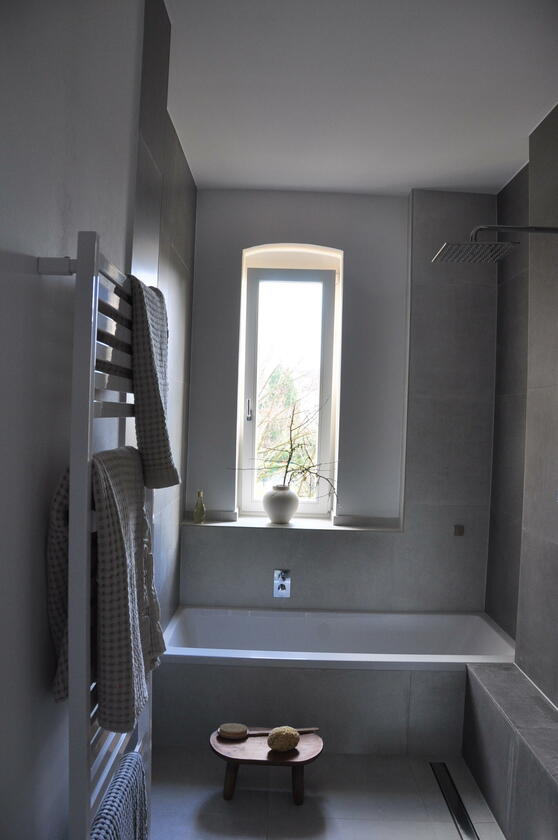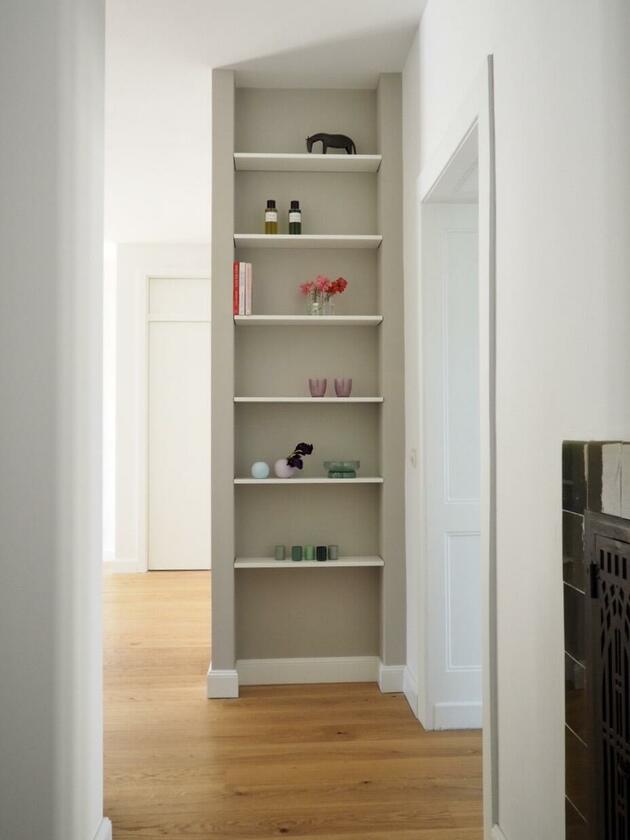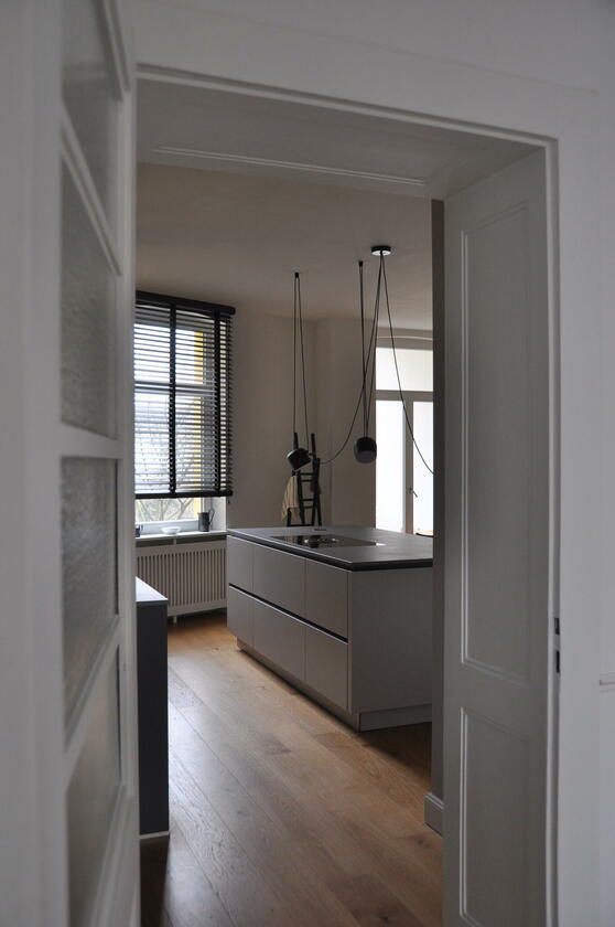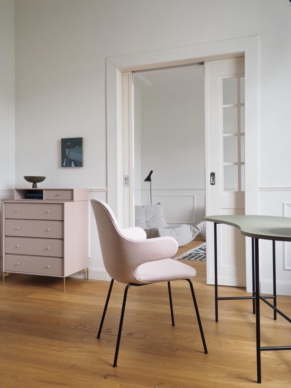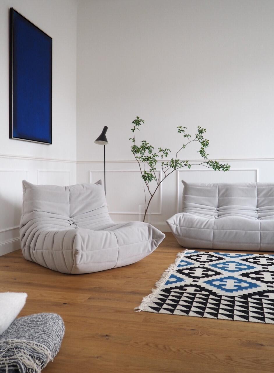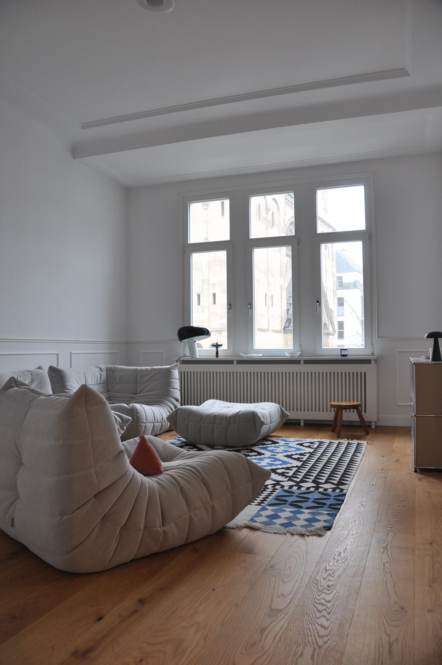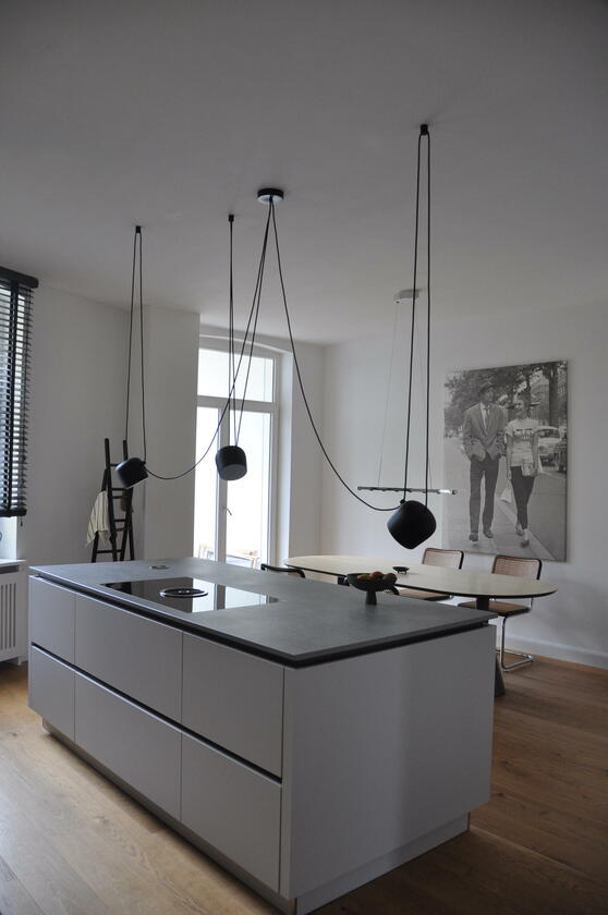 Meine 110 m² große Eigentumswohnung liegt in der 2. Etage und teilt sich in zwei Bereiche auf. Der vordere Bereich stellt den offenen Wohnungsraum dar, den ich mit meinen Gästen nutze. Der hintere Bereich hingegen ist mit Schlafzimmer, dem begehbaren Ankleideraum und dem zweiten Bad so abgeschottet, dass dieser ausschließlich für mich einen schönen Rückzugsort bietet. Die Wohnung bietet ein Schlafzimmer, ein Wohnzimmer, ein Gästezimmer, eine Wohn- und Essküche, zwei Badezimmer, eine Diele und ein begehbares Ankleidezimmer. Von der Wohnküche kommt man auf einen schönen Süd-West-Balkon mit Blick auf den Innenhof. Jedes Zimmer, inklusive der Badezimmer, hat ein Fenster. Die Wohnung ist somit sehr hell. Das Wohnzimmer und Gästezimmer wird von einer 100 Jahre alten Schiebetür, die ich neu aufgearbeitet habe, getrennt. Lässt man die Schiebetür offen hat man auf der anderen Seite mit der Verbindung von Wohn- und Arbeitszimmer ein wirklich geräumiges und offenes Wohngefühl. Bei der Gestaltung meiner Wohnung habe ich ebenfalls großen Wert darauf gelegt, sämtliche Materialien (Boden, Fenster, Türen, Fliesen etc.) auszusuchen, um dem Apartment von Beginn an meinen Stil zu geben. Mir war es dabei sehr wichtig einen eleganten, puristischen Stil in Anlehnung an Pariser Altbauten zu finden. So habe ich im neuen Schlaf-, Wohn- und Gästezimmer Heizungsverkleidungen anfertigen lassen und Orac-Dekorleisten mit Altbaucharme angebracht. Meine neu installierten Türen zu den Badezimmern und zum Ankleidezimmer sind deckenhoch und verleihen der Wohnung zudem ein „loftiges“ Ambiente. Bei der gesamten Möbelauswahl habe ich mich bemüht einen zeitlosen Stil aufzugreifen.