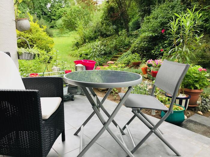 Die exklusive Maisonette Wohnung in Sachsenhausen, dem Herzen Frankfurts, ist Teil eines sechs Parteien Hauses. Mit ca. 100 m² verfügt die Location über 4 Zimmer, die auf 2 Stockwerke aufgeteilt sind. Der Eingang befindet sich im 1. Obergeschoss, sowie auch die Küche, das Esszimmer und Wohnzimmer, mit der wunderschönen Terrasse und dem Garten. Durch eine Wendeltreppe gelangt man ins Erdgeschoss, wo der Boden im Flur und in beiden Schlafzimmern mit Parkett ausgestattet ist. Das neu renovierte Badezimmer ist zwar klein aber sehr fein. Die Einrichtung selbst ist sehr edel und minimalistisch und mit sehr vielen Pflanzen an jeder Ecke dekoriert.