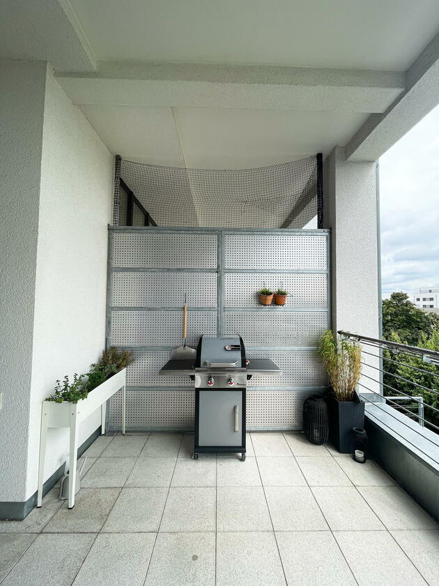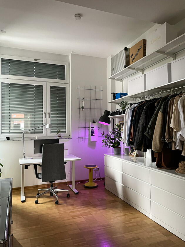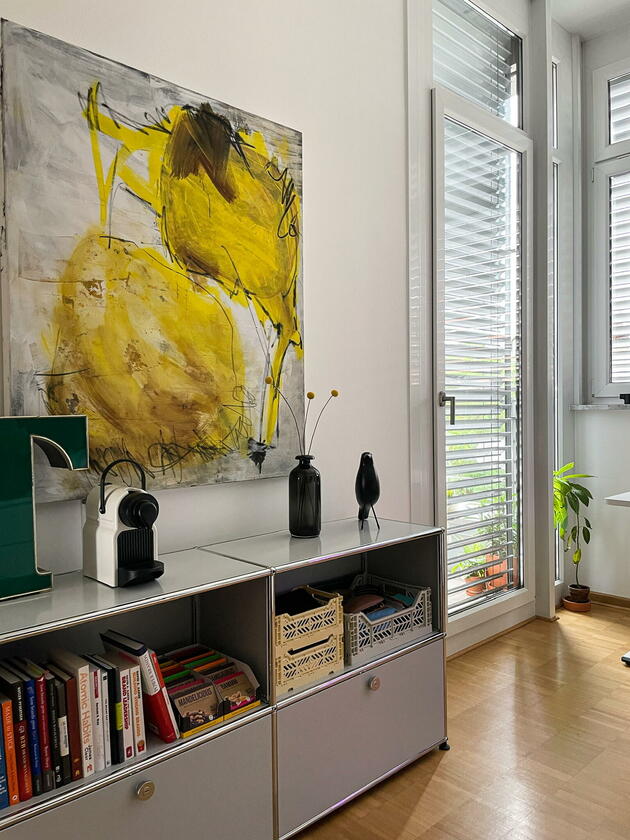 Die Wohnung befindet sich in der Fürther Südstadt auf einem alten Kasernengelände in der Nähe des Südstadtparks. Das Gebäude hat Geschichte und wurde 2008 kernsaniert. Die berühmten Carrera-Autos wurden in diesem Fabrikgebäude gebaut. Daher auch die eindrucksvolle Deckenhöhe von knapp 4 Metern. Durch die großen Fensterfronten zu allen Himmelsrichtungen ist die Wohnung sehr hell, kann aber durch automatische Außenrollos verdunkelt werden. Highlight sind die zwei Balkonterrassen, von denen die größere 32 m² misst und nach Südwesten in den Innenhof ausgerichtet ist und ein kleiner Balkon mit ca. 10 m², der nach Nordosten zur Straße gerichtet ist. Die offene Wohnküche in schlichtem modernen weiß und der offene Kleiderschrank, das große Bad mit riesigem Spiegel, WC, Dusche und Badewanne sowie das Gäste-WC eignen sich ebenfalls als Motive. Neben dem Wohn- und Essbereich, dem Schlafzimmer, Arbeitszimmer, Bad, Gäste-WC und den beiden Balkonen gibt es noch eine Abstellkammer mit Waschmaschinenanschluss, einen großzügigen Eingangsbereich und einen Kellerraum auf der Etage.