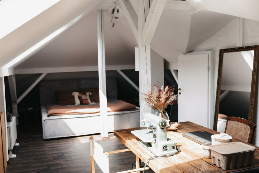 Dachstudio (2. OG) Fläche:  27 m²Länge:  8,09 mBreite:  3,27 mHöhe:  2,5 mmöbliert:  ja