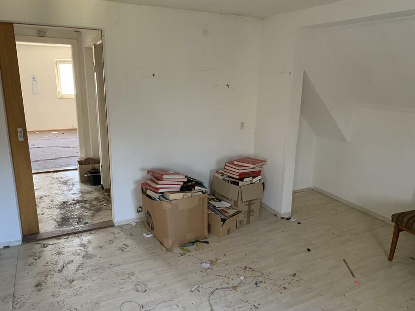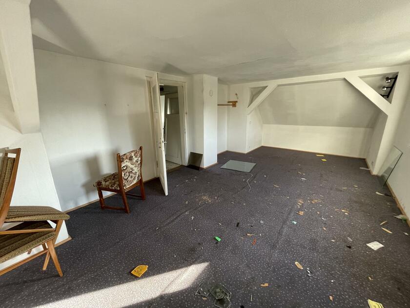 Das leerstehende Mehrfamilienhaus wurde im Jahr 1900 erbaut. Das Haus verfügt über keine Heizung, keine Elektrizität und keinen Wasseranschluss. Es bietet 2 Stockwerke und mit 3 Wohnungen, die über ein Treppenhaus miteinander verbunden sind. Ebenso kann der Keller und das Dachgeschoss mit Dachschräge für Produktionen genutzt werden. Das Erdgeschoss hat hohe Decken. Im Außenbereich bietet das ca. 725 m² große Grundstück einen großen Garten, der sehr verwachsen ist. Hier befindet sich auch eine Holzhütte. Das Grundstück liegt neben einem Bach. Im Haus ist Setbau je nach Bedarf möglich. Parkplätze gibt es in der Umgebung.