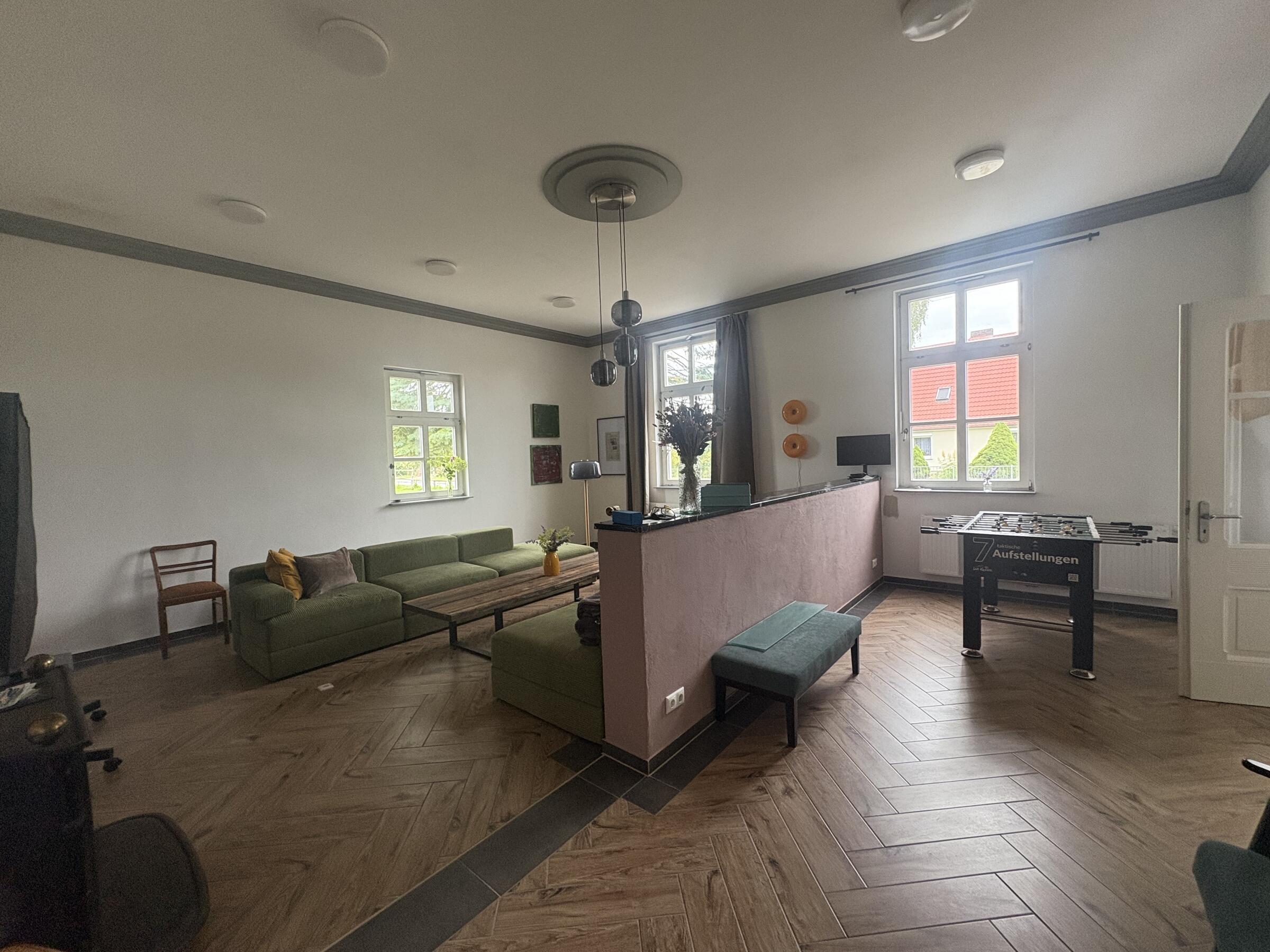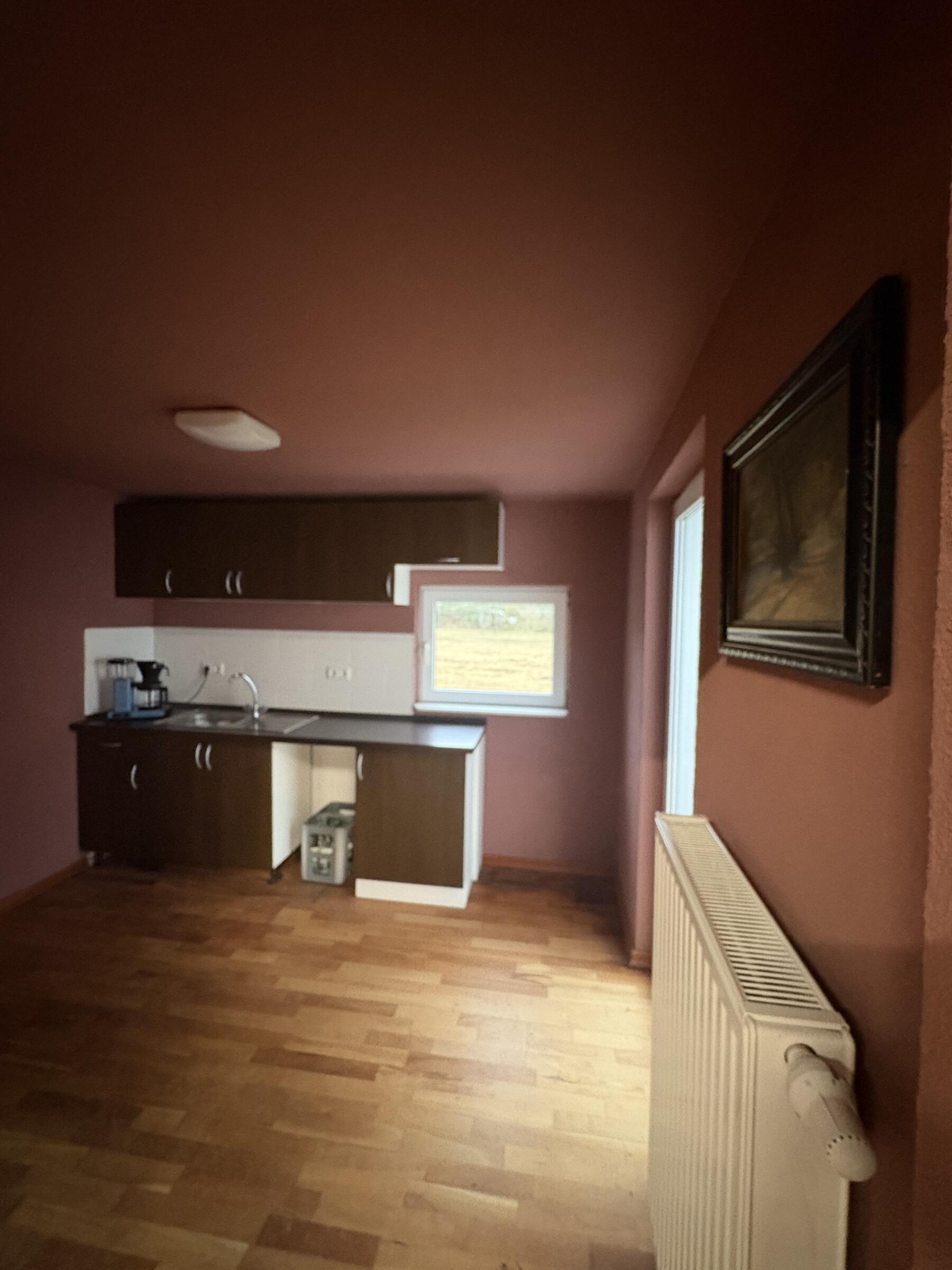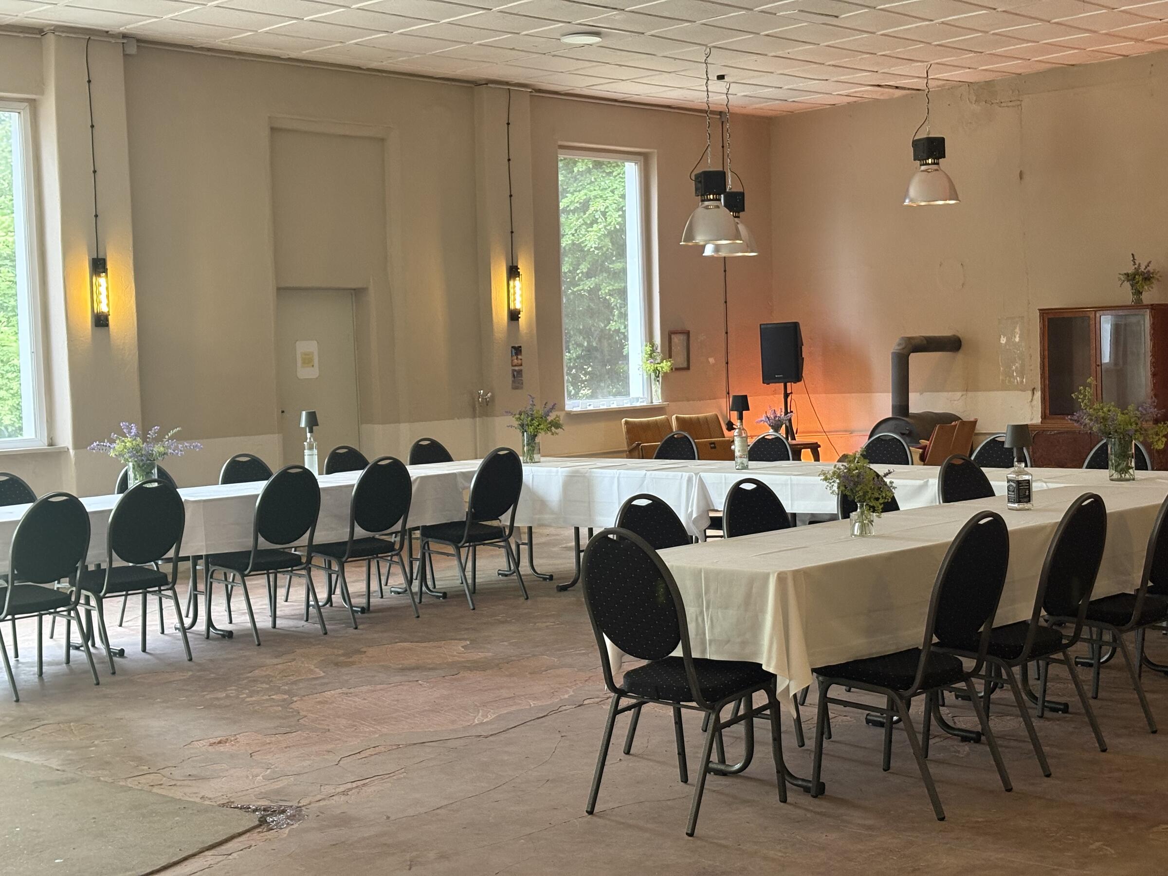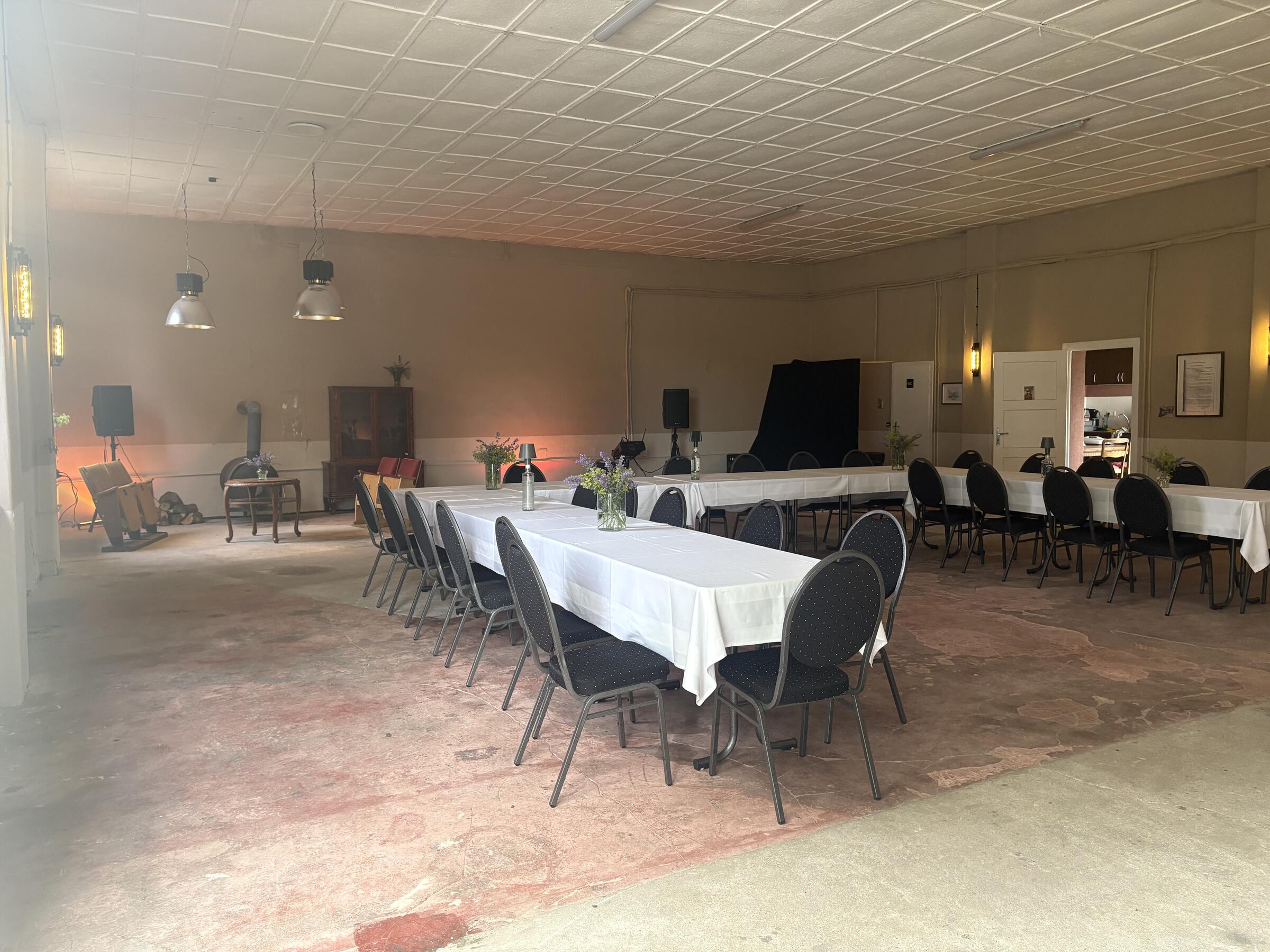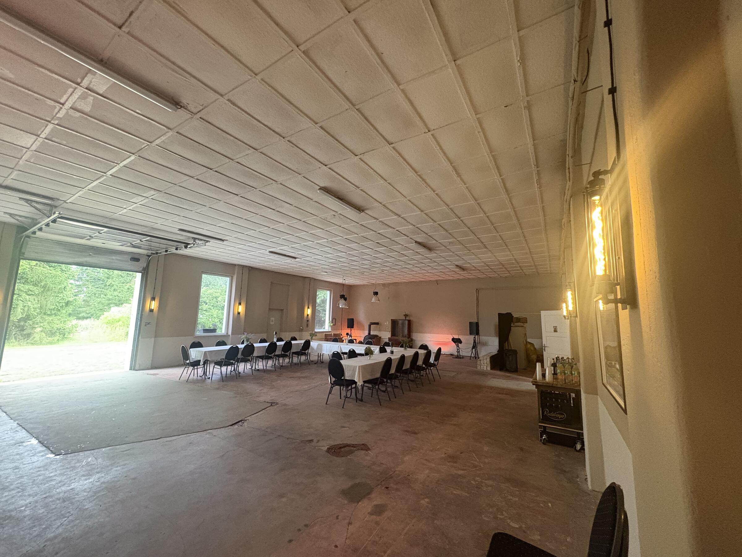 Dieses ehemalige Kulturhaus bietet eine große Halle mit ca.190 qm , die durch ein Rolltor (Höhe 3 m, Breite 2,50 m) befahrbar ist. Die Halle hat drei große Fenster und wird mit Deckenlampen beleuchtet. Dazu gibt es weitere Räume: Lounge /Büroraum, Küche, Abstellkammer, drei sanitäre Anlagen und einen Keller. Alle Räume können beheizt werden. Es gibt eine Gasheizung und zwei Kaminöfen. Die sanitären Anlagen bestehen aus drei Toilettenräumen sowie zwei Duschräumen. Alle sind funktionstüchtig. In der Küche gibt es Küchenschränke. Über eine Tür kann man von der Küche direkt auf eine kleine Terrasse gelangen. Im Außenbereich kann eine große Freifläche mit weitläufiger Wiese genutzt werden. Großzügige Stellflächen mit festem Untergrund für Lkw und Pkw-Parkplätze stehen ebenfalls ausreichend zur Verfügung. In 2025 wird die ehemalige Bühne des Kulturhauses frei gelegt, so dass weitere interessante Räume entstehen. Internet ist über einen Glasfaseranschluss in sehr guter Qualität vorhanden.