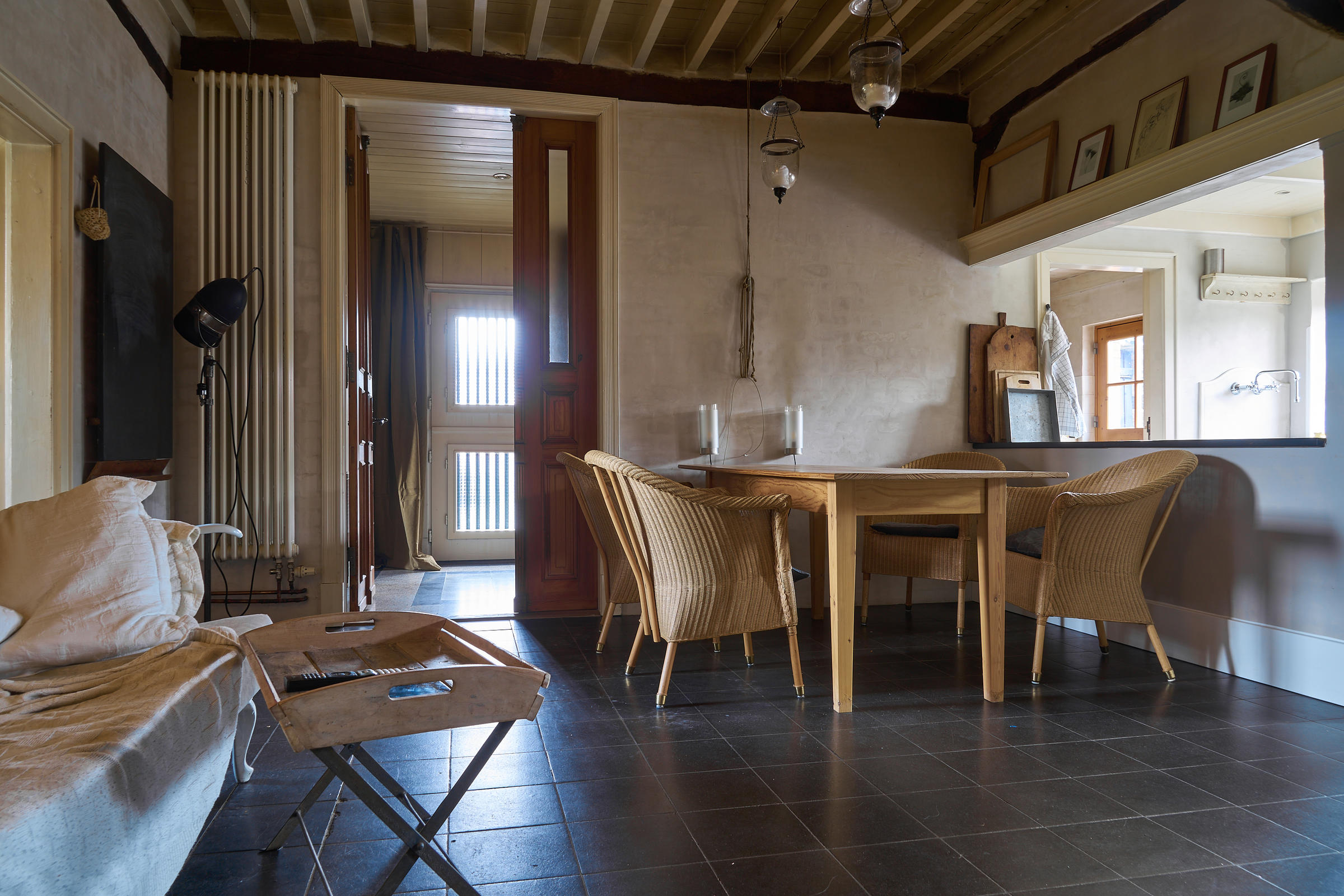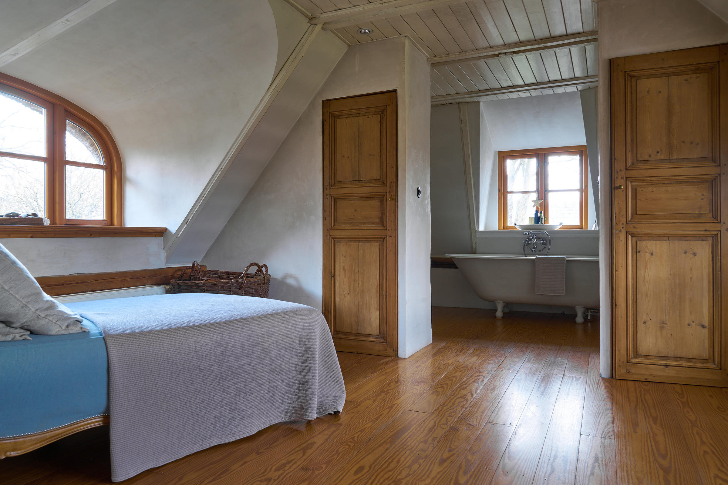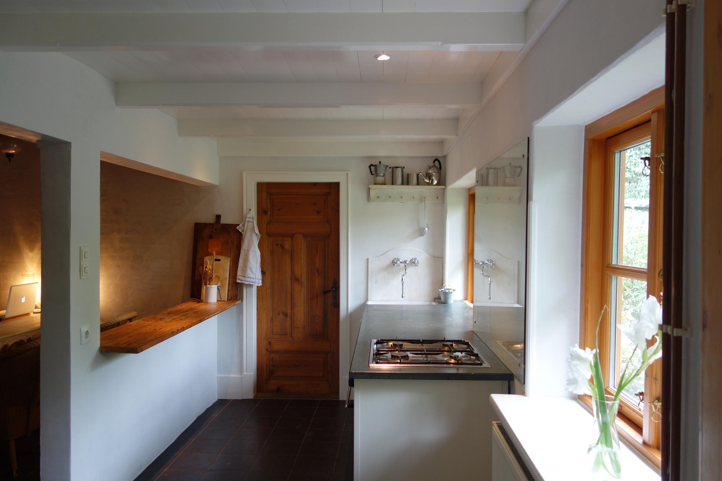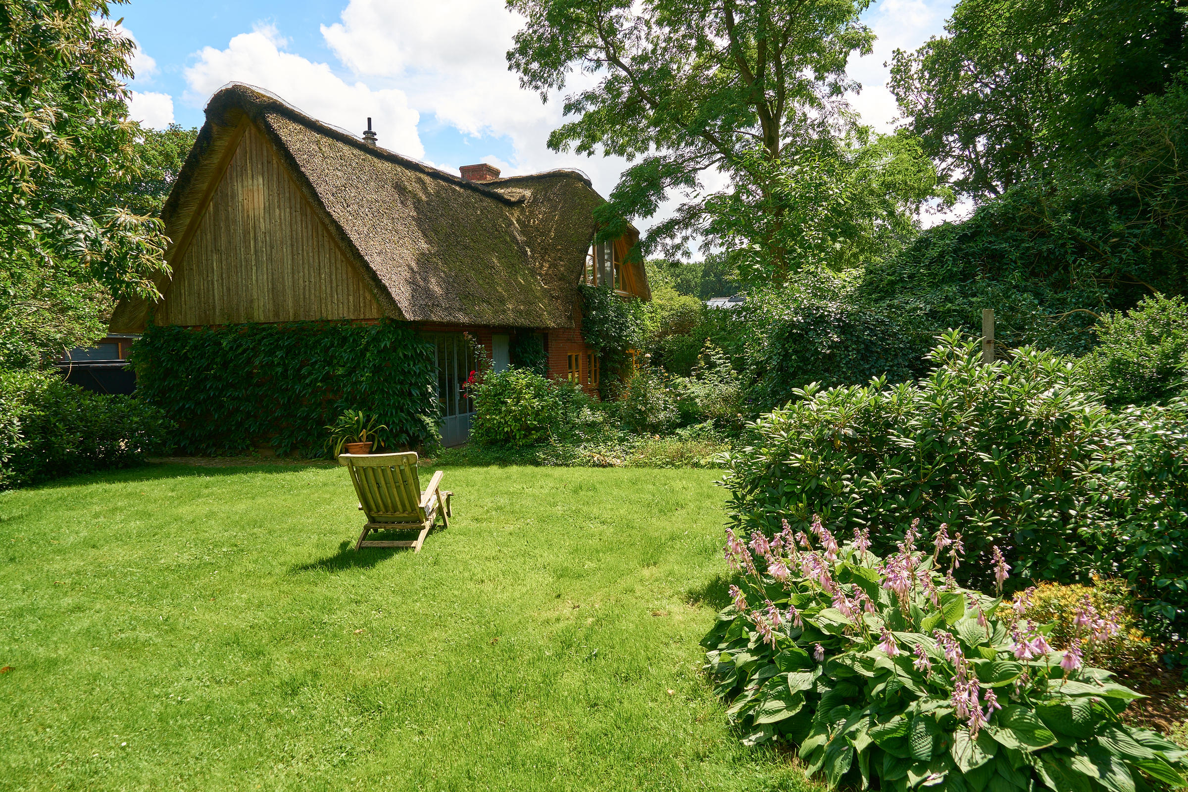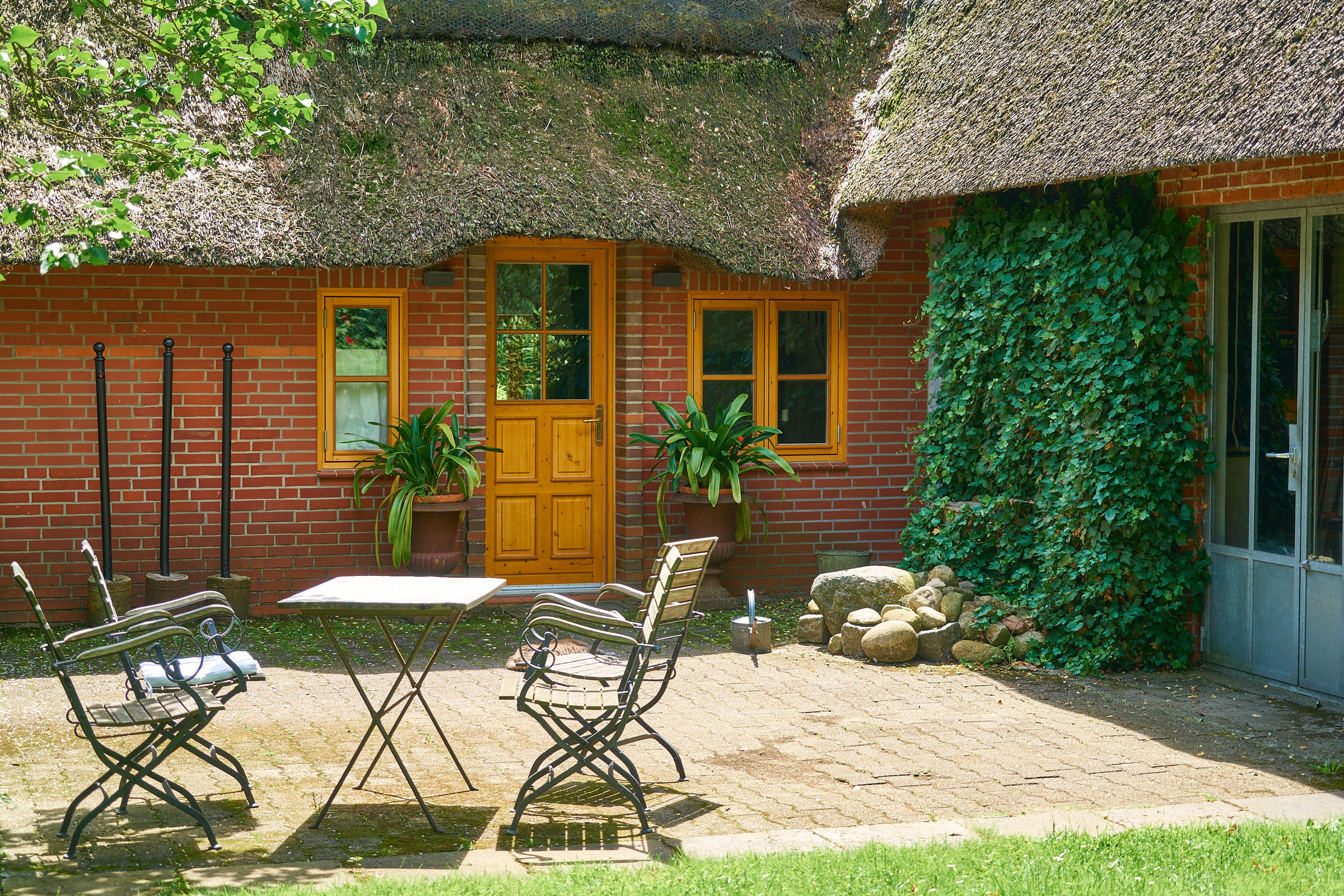Die alte reetgedeckte Kate in Dithmarschen mit ca. 120 m² Wohnfläche ist eingerichtet mit einer Mischung aus antik und modern. Durch eine Klönschnacktür erreicht man durch einen kurzen Flur die geräumige Diele mit offener Küche. Eine weitere Besonderheit befindet sich im ersten Stock, ein komplett offenes Bad mit freistehender Badewanne im Anschluss an ein Schlafzimmer mit großem Fenster und Blick in den 3000 m² wilden Garten. Dort wartet im Sommer ein antikes Metallbett für den Mittagsschlaf im Schatten einer Marone. Ein Fachwerkgartenhaus aus handgestrichenen Backsteinen mit alten Fenstern und Türen, dient an schlechten Tagen als Außensitz- und Grillplatz. Im Anbau befindet sich eine Holzwerkstatt mit einer alten Hobelbank und diversen Gerätekammern.