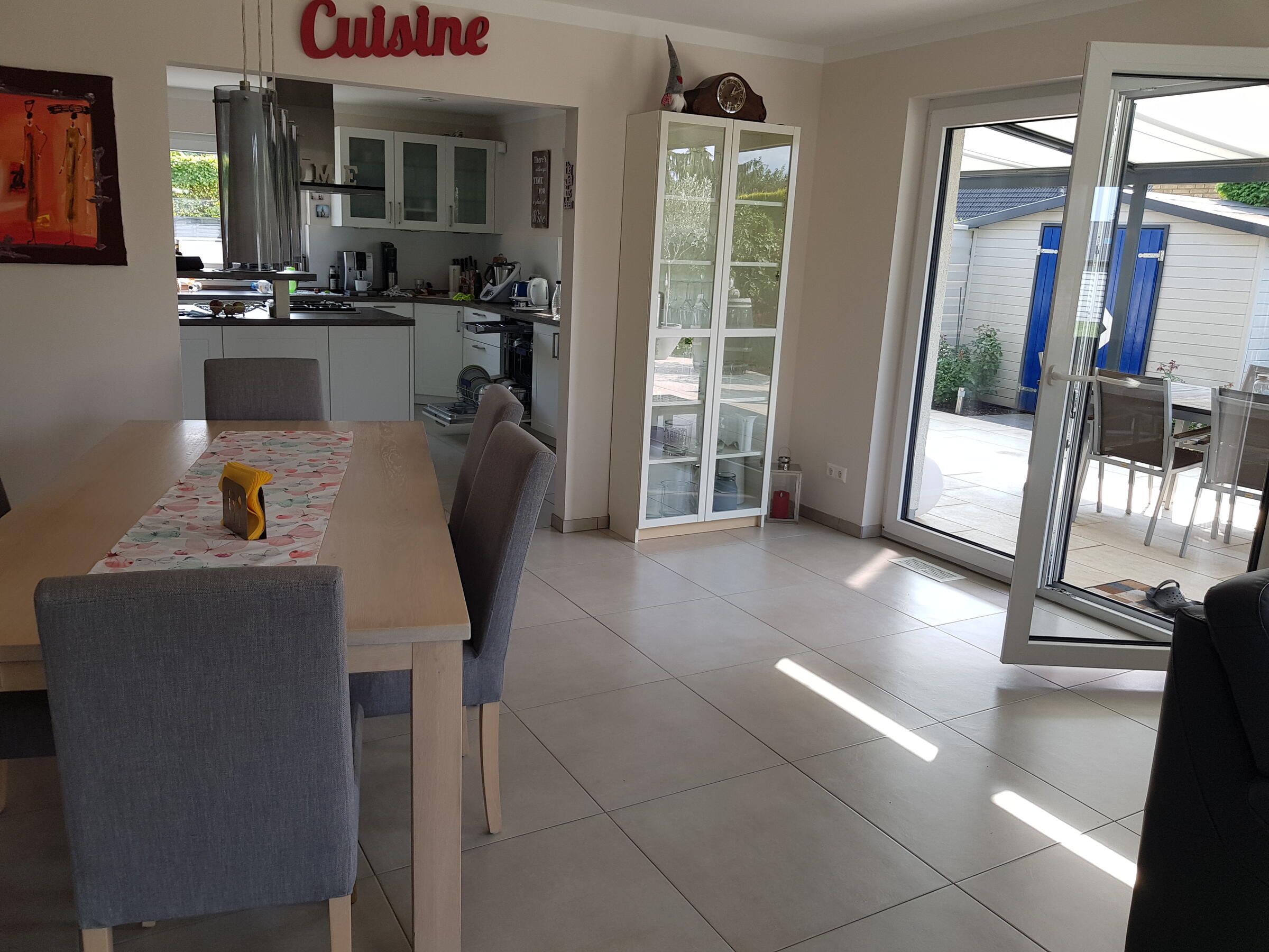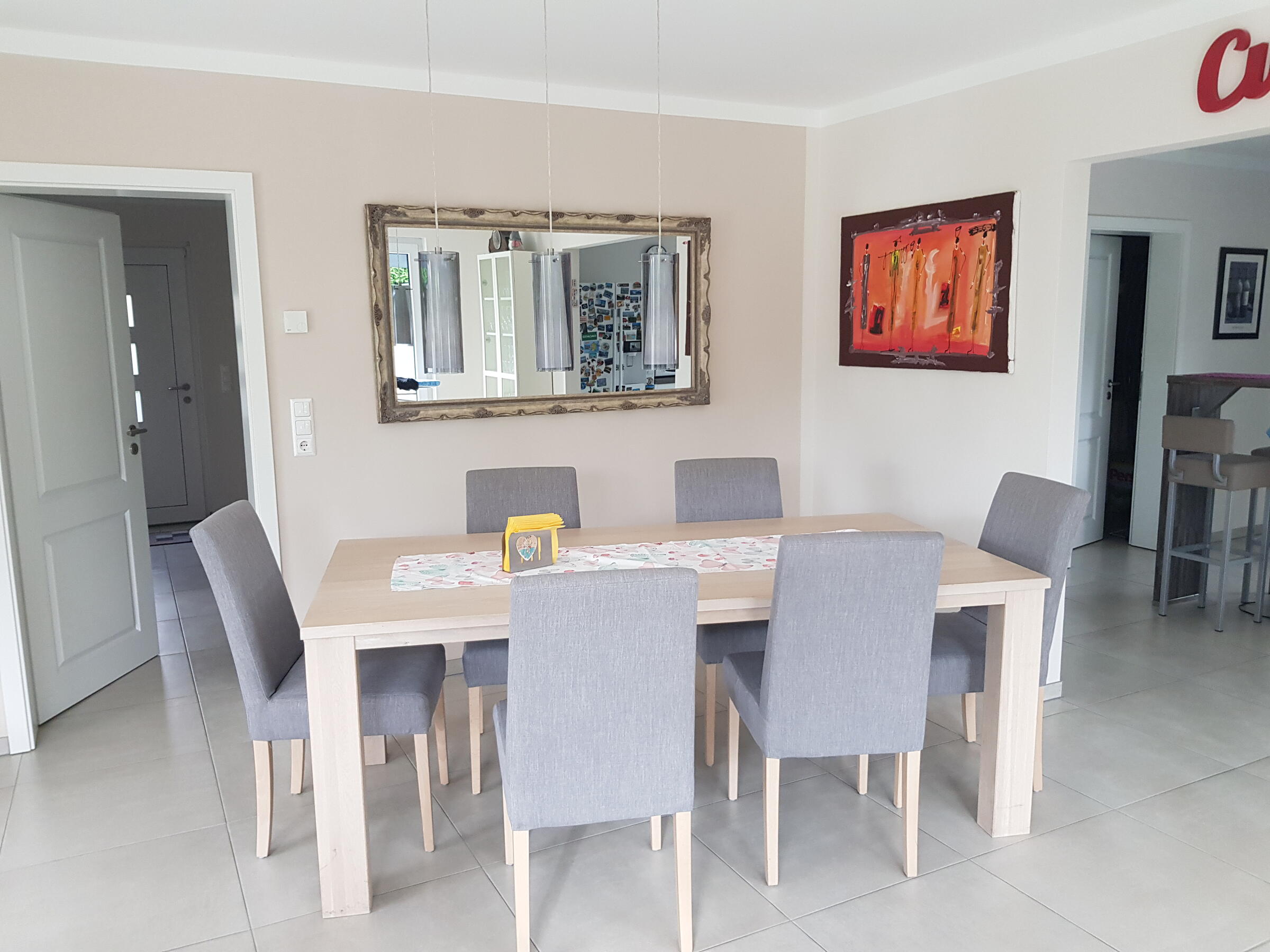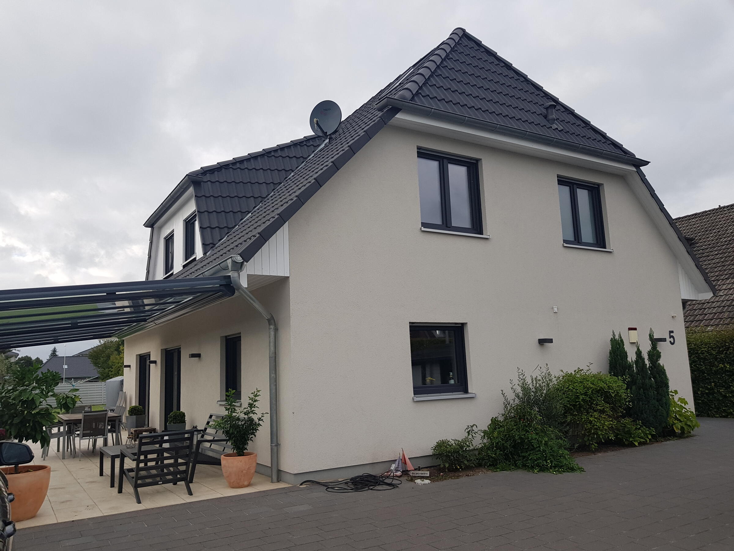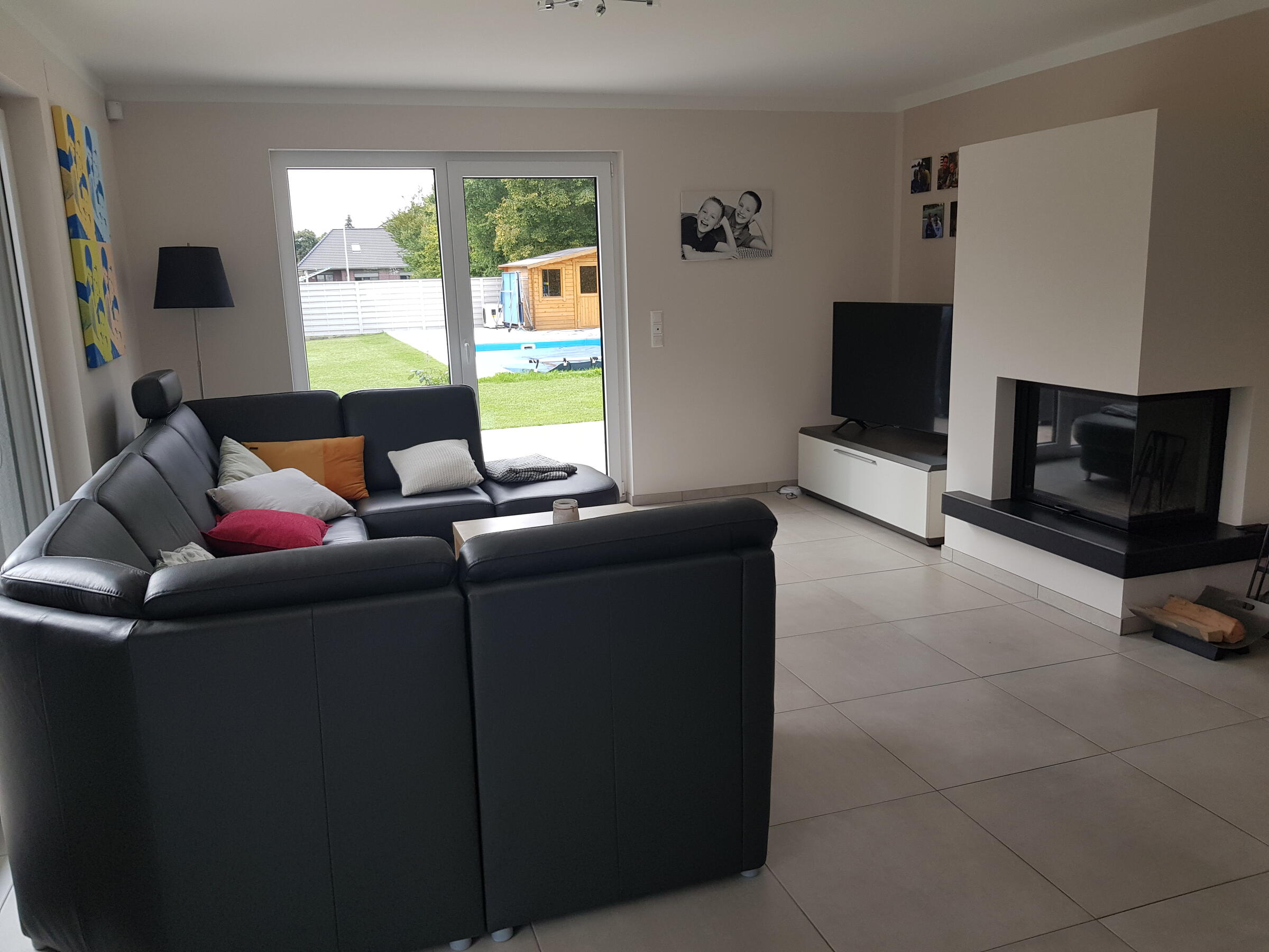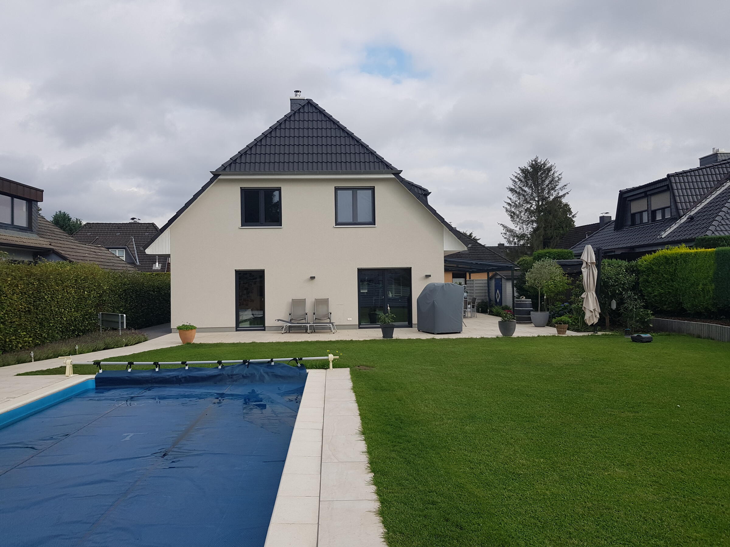 Das Einfamilienhaus wurde vor 5 Jahren gebaut und liegt in einer ruhigen Wohnstraße, einer Sackgasse im Landkreis Pinneberg. Das Haus hat 5 Zimmer, 2 unten und 3 oben. Die Küche ist eine weiße Einbauküche mit einem Tresen und einem Gasherd. Im Wohnzimmer befindet sich ein Kamin. Im Innenbereich ist das Untergeschoss gefliest. Das Haus hat keinen Keller. Das Grundstück hat knapp 900 m². Der Pool im Garten ist 4 x 8 m groß und 150 cm tief. Es stehen 3 Gartenhäuser auf dem Grundstück. Die Terrasse ist vorne und hinten gefliest und im vorderen Teil der Terrasse haben wir ein Glasdach, was ca. 8 m lang ist mit Markisen. Vor dem Haus ist eine große Auffahrt.