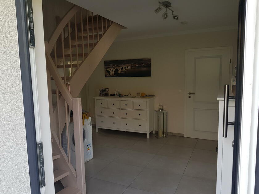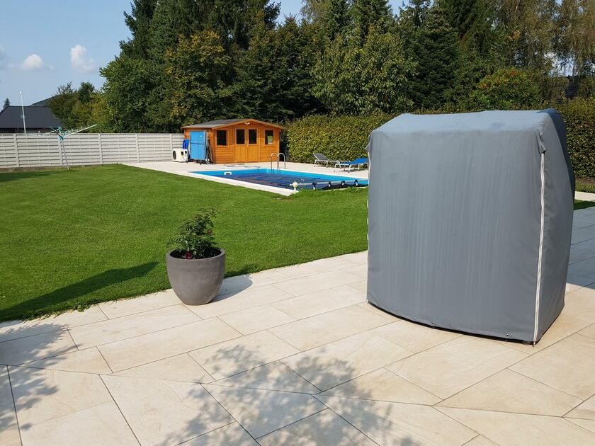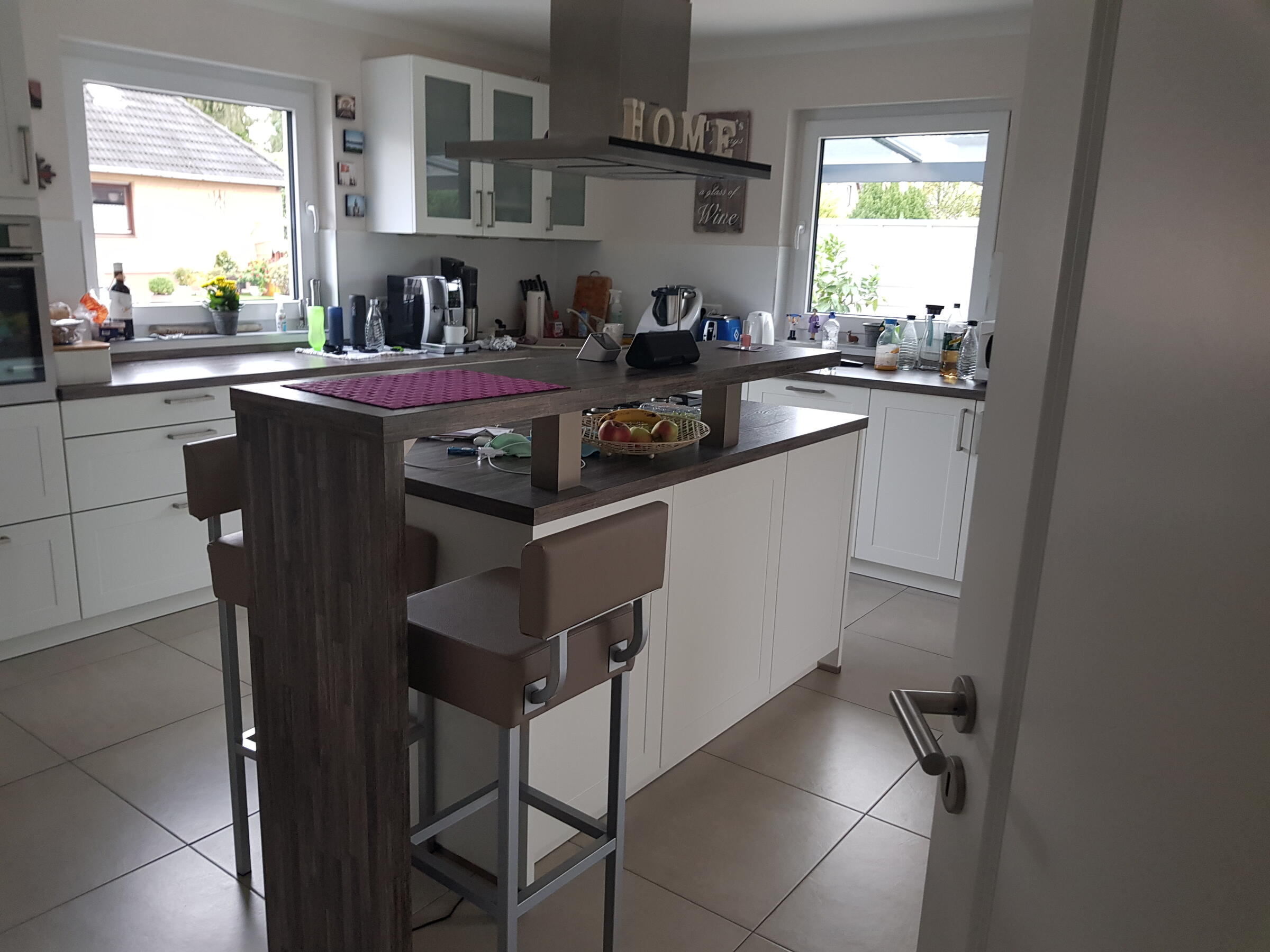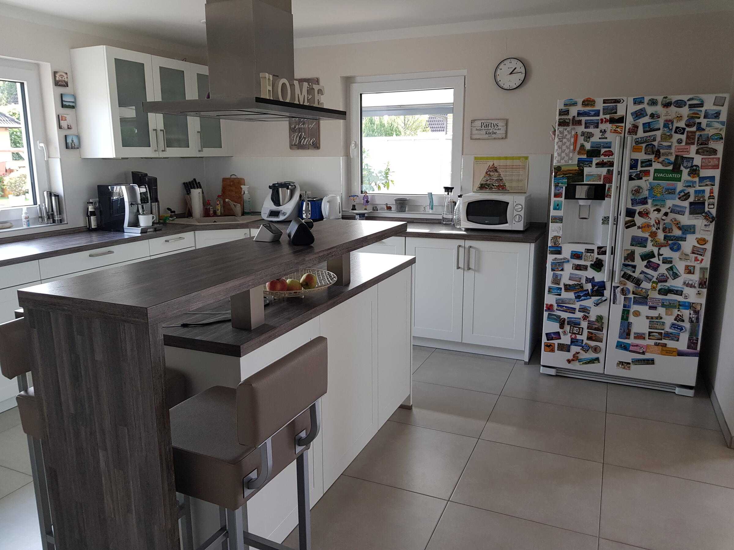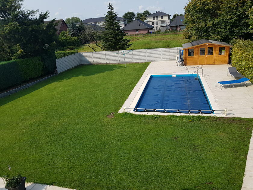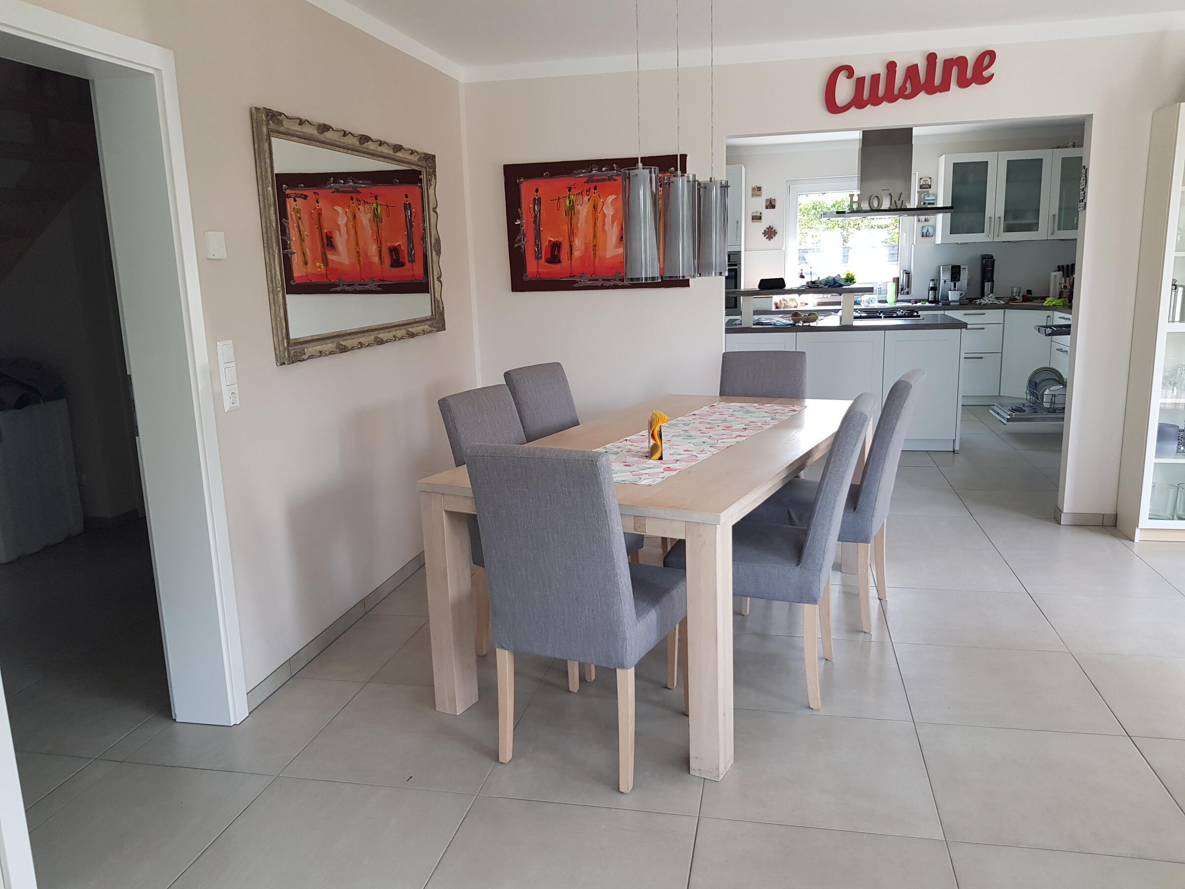 Das Einfamilienhaus wurde vor 5 Jahren gebaut und liegt in einer ruhigen Wohnstraße, einer Sackgasse im Landkreis Pinneberg. Das Haus hat 5 Zimmer, 2 unten und 3 oben. Die Küche ist eine weiße Einbauküche mit einem Tresen und einem Gasherd. Im Wohnzimmer befindet sich ein Kamin. Im Innenbereich ist das Untergeschoss gefliest. Das Haus hat keinen Keller. Das Grundstück hat knapp 900 m². Der Pool im Garten ist 4 x 8 m groß und 150 cm tief. Es stehen 3 Gartenhäuser auf dem Grundstück. Die Terrasse ist vorne und hinten gefliest und im vorderen Teil der Terrasse haben wir ein Glasdach, was ca. 8 m lang ist mit Markisen. Vor dem Haus ist eine große Auffahrt.