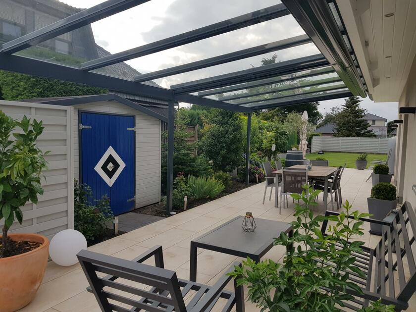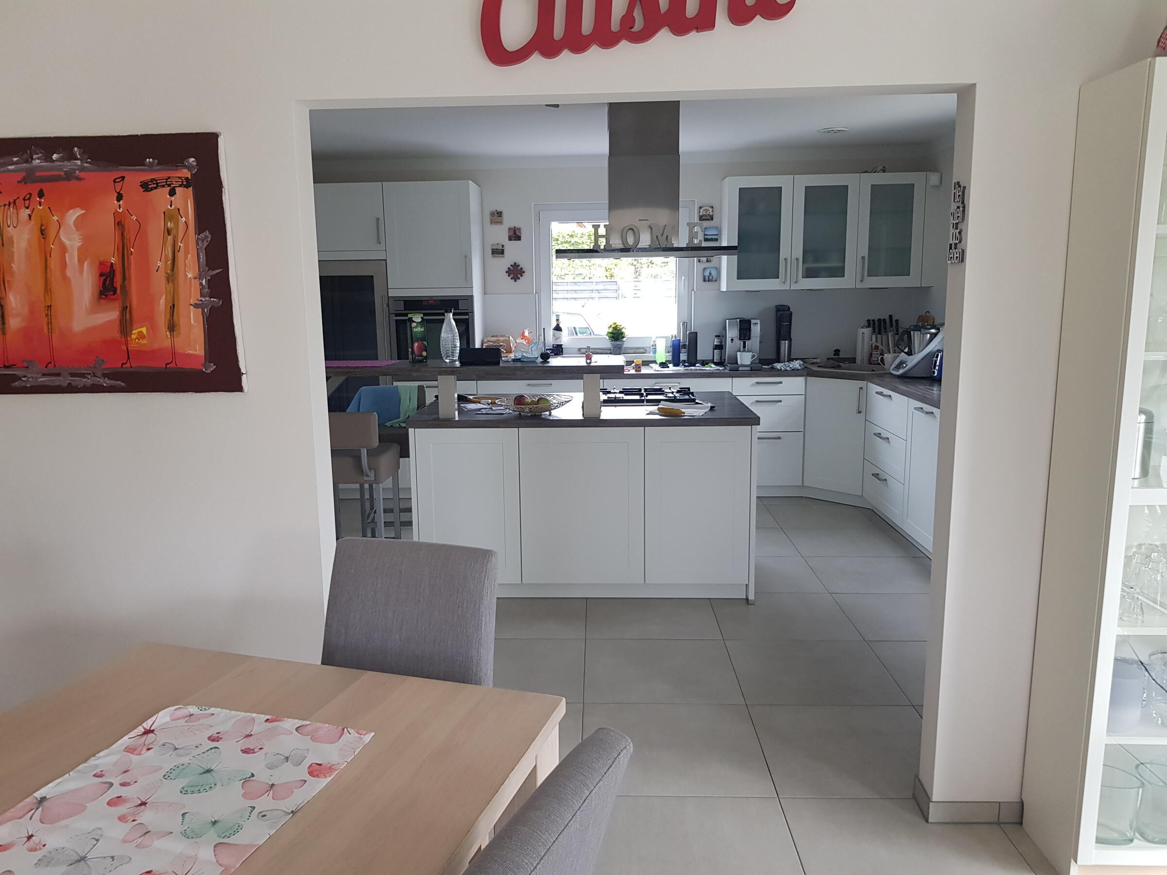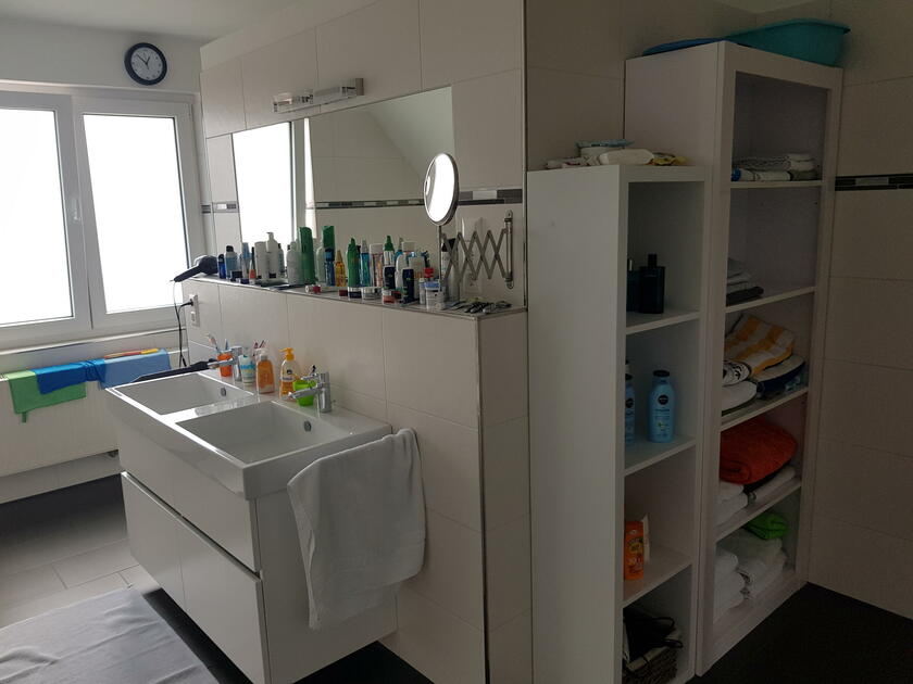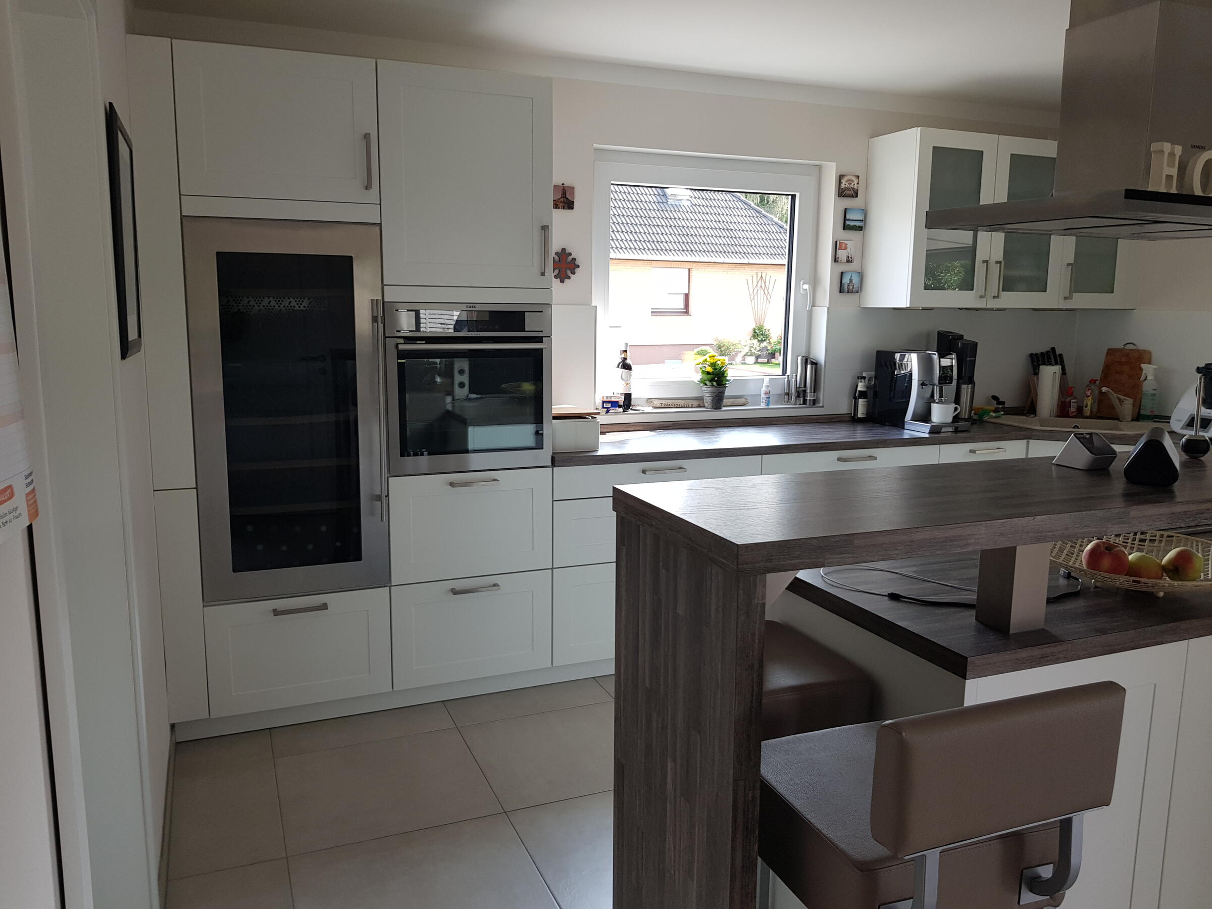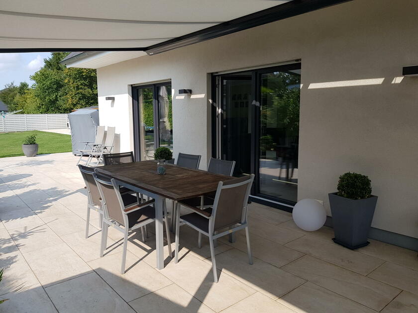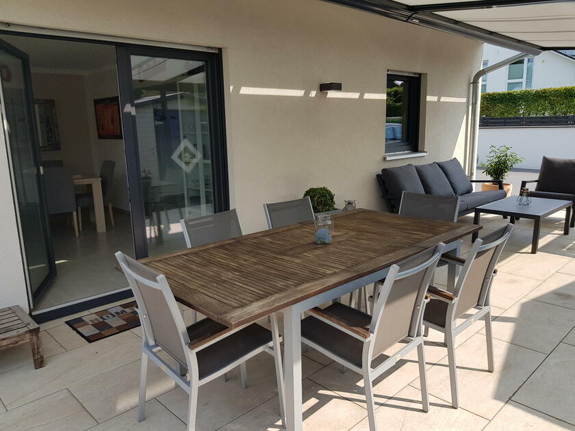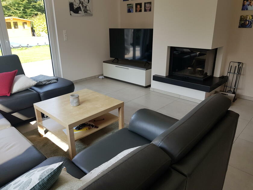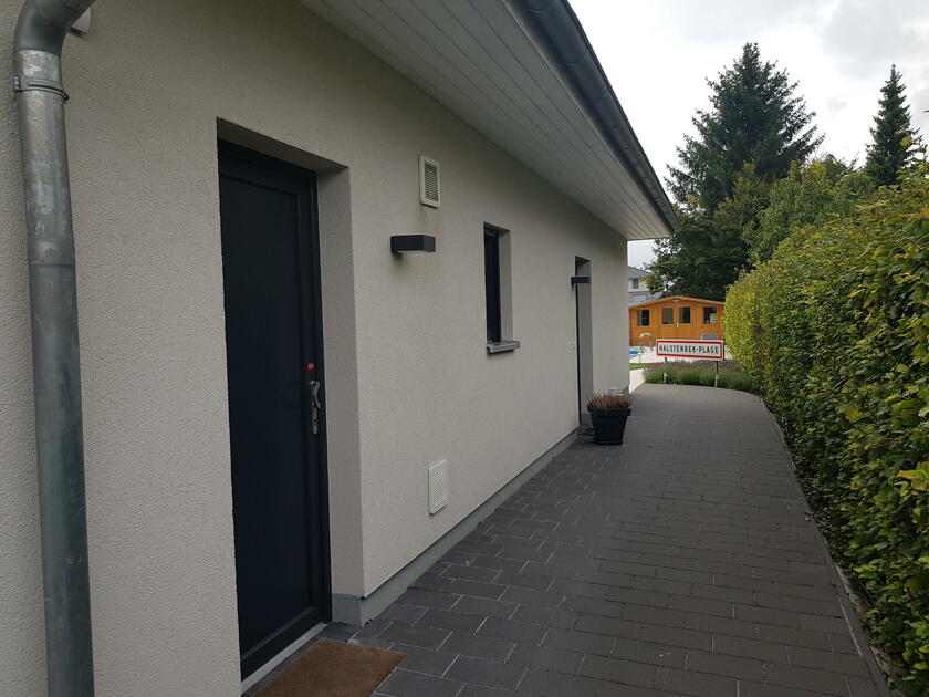 Das Einfamilienhaus wurde vor 5 Jahren gebaut und liegt in einer ruhigen Wohnstraße, einer Sackgasse im Landkreis Pinneberg. Das Haus hat 5 Zimmer, 2 unten und 3 oben. Die Küche ist eine weiße Einbauküche mit einem Tresen und einem Gasherd. Im Wohnzimmer befindet sich ein Kamin. Im Innenbereich ist das Untergeschoss gefliest. Das Haus hat keinen Keller. Das Grundstück hat knapp 900 m². Der Pool im Garten ist 4 x 8 m groß und 150 cm tief. Es stehen 3 Gartenhäuser auf dem Grundstück. Die Terrasse ist vorne und hinten gefliest und im vorderen Teil der Terrasse haben wir ein Glasdach, was ca. 8 m lang ist mit Markisen. Vor dem Haus ist eine große Auffahrt.