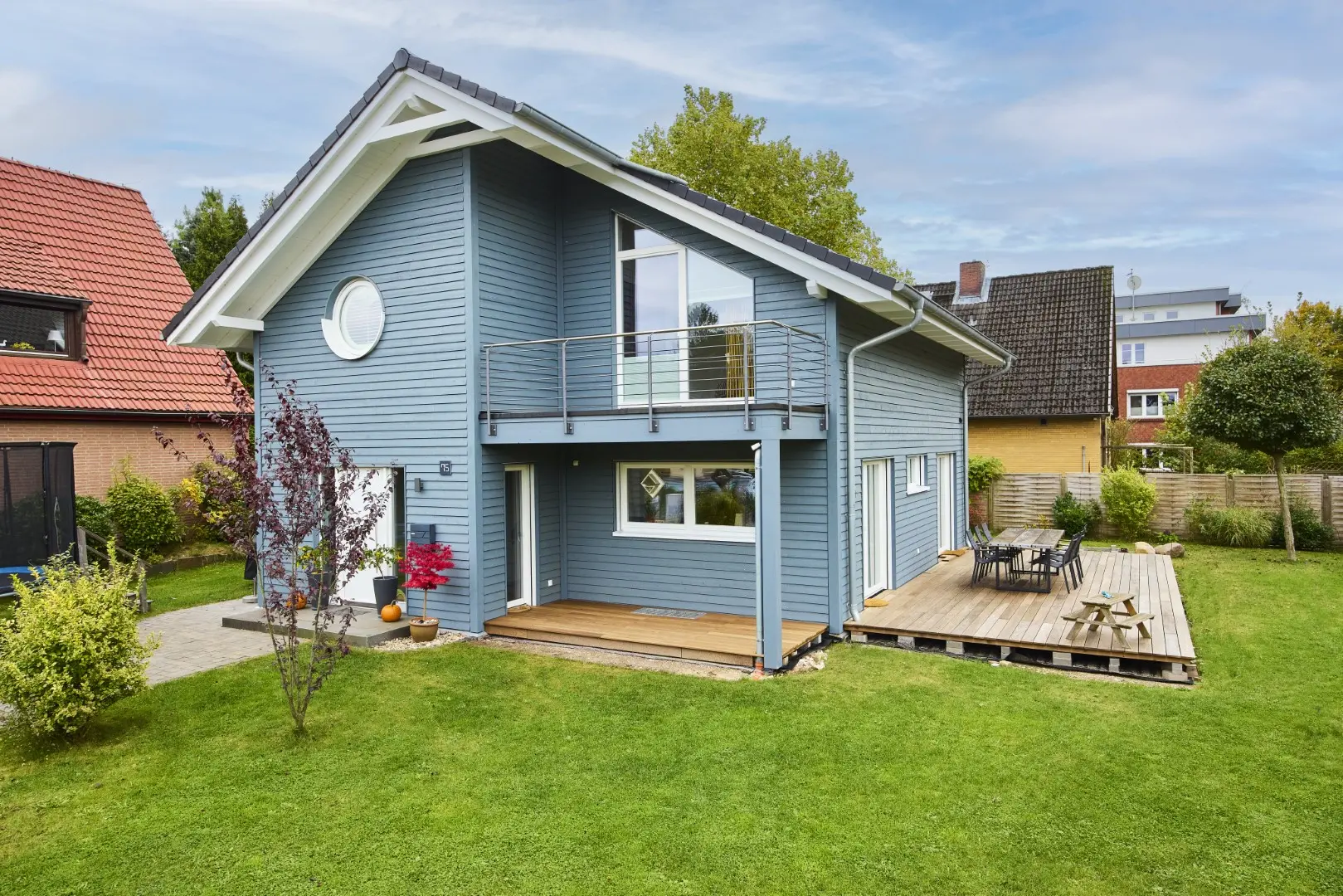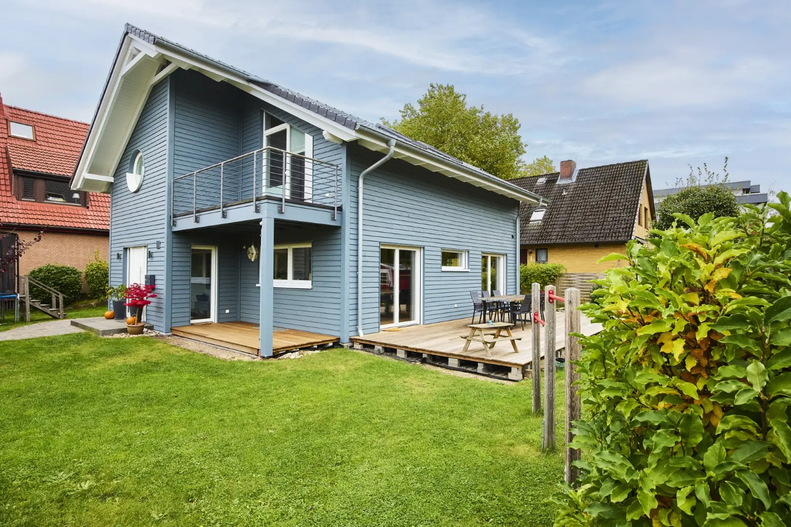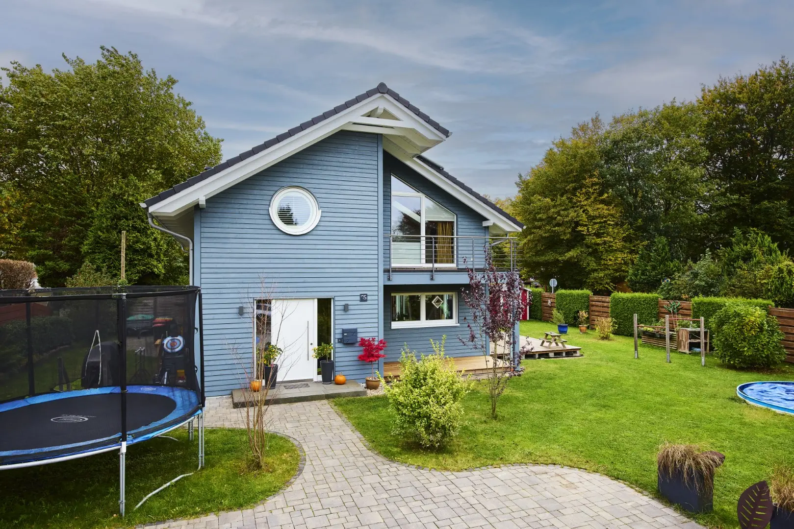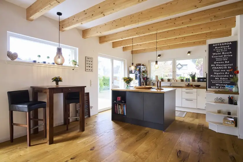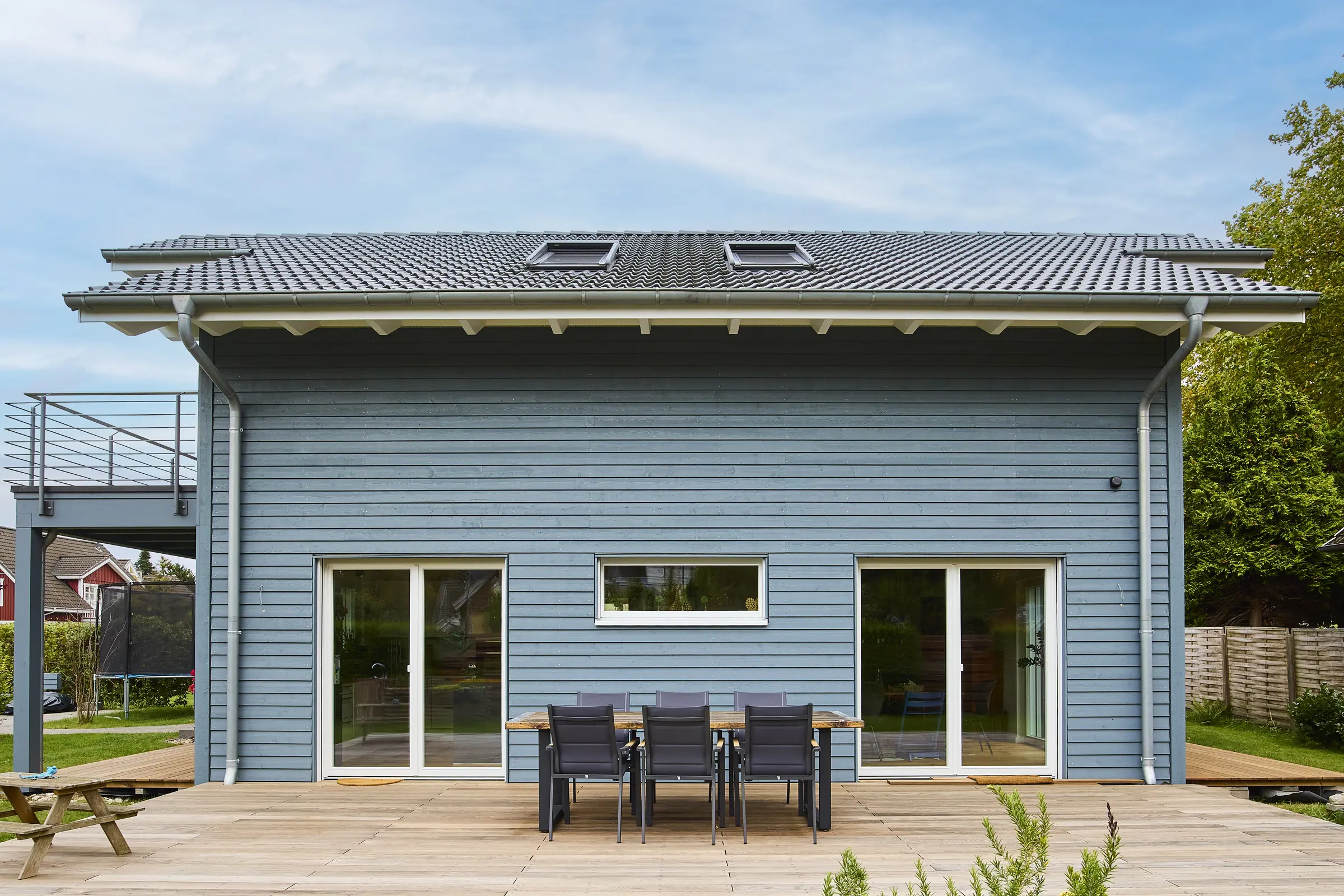 Unser blaues Holzhaus befindet sich in Hamburg-Schnelsen. Die Räume sind modern und mit viel Holzelementen eingerichtet. Der große und offen gestaltete Wohn- und Essbereich im Erdgeschoss bildet das Zentrum unseres Hauses. Durch die teilweise bodentiefen Fenster fällt viel Tageslicht in die Wohnräume. Die Fenster können mit elektrische Rollos und Raffstores verdunkelt werden. Im Obergeschoss befinden sich die Kinderzimmer, das Schlafzimmer und das große Familienbadezimmer. Da unser Haus keinen Dachboden hat, haben die Zimmer hier eine Deckenhöhe von bis zu 4 m. 2 Pkw-Stellplätze befinden sich auf unserem Grundstück. Weitere Parkplätze gibt es auf der verkehrsberuhigten Straße vor unserem Haus.