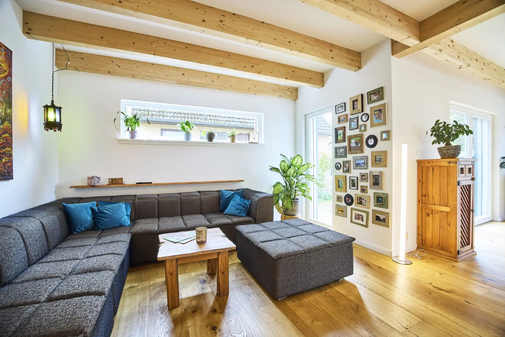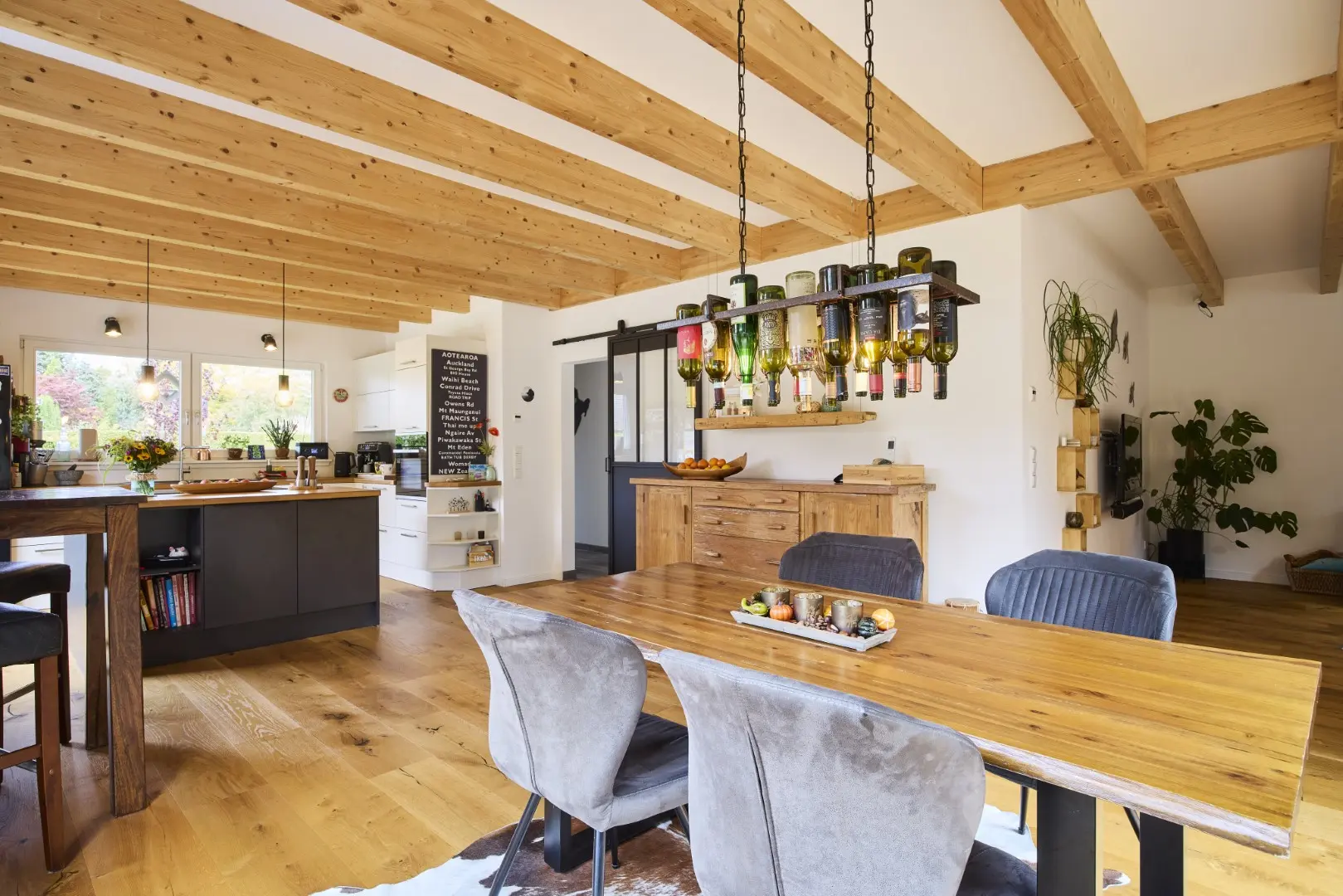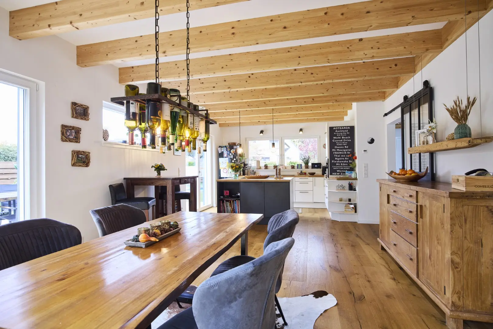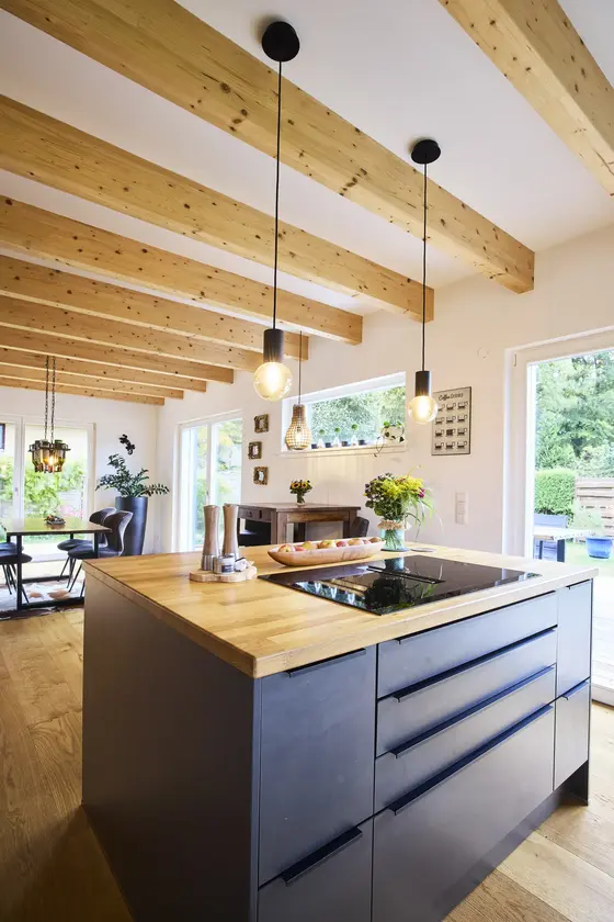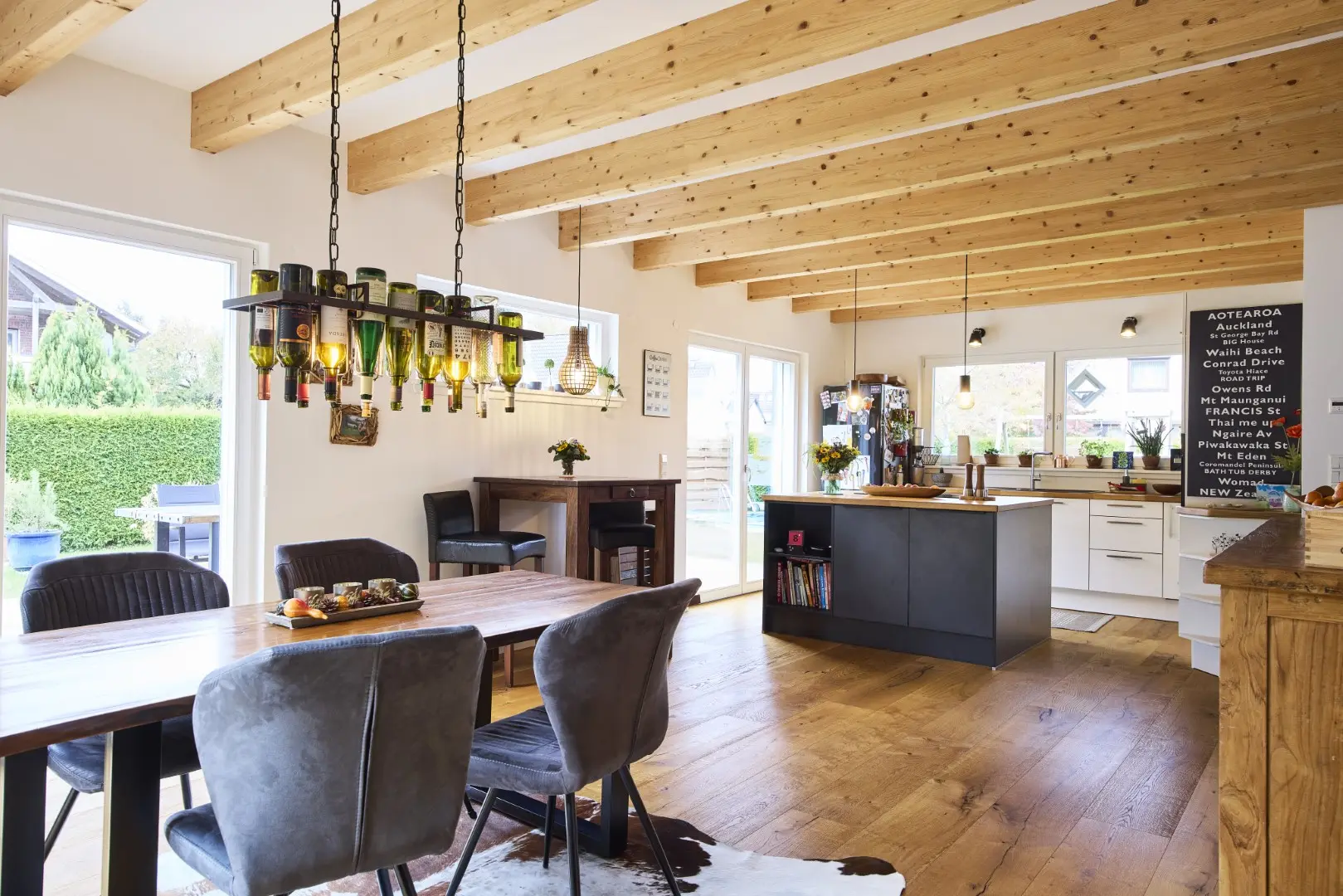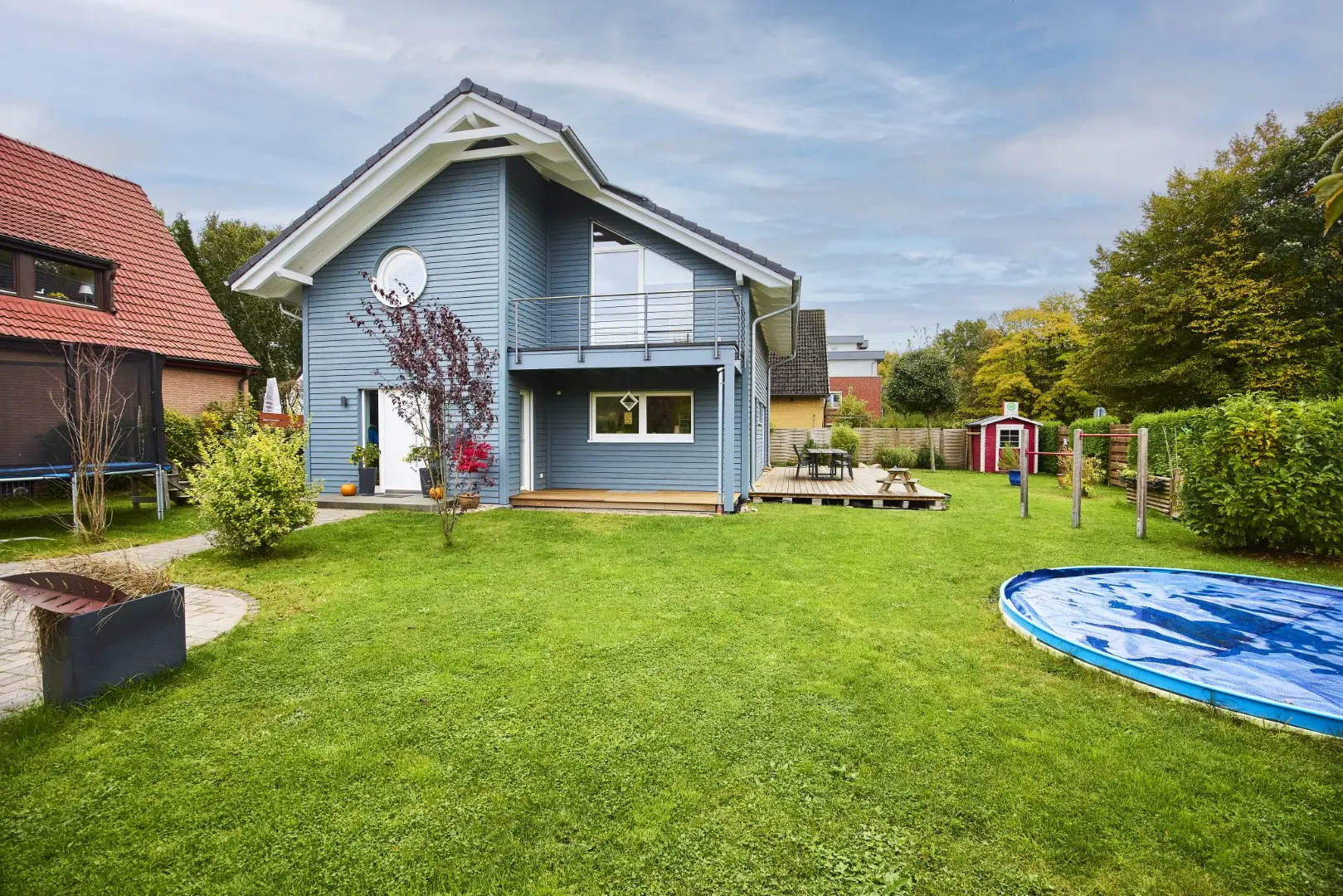 Unser blaues Holzhaus befindet sich in Hamburg-Schnelsen. Die Räume sind modern und mit viel Holzelementen eingerichtet. Der große und offen gestaltete Wohn- und Essbereich im Erdgeschoss bildet das Zentrum unseres Hauses. Durch die teilweise bodentiefen Fenster fällt viel Tageslicht in die Wohnräume. Die Fenster können mit elektrische Rollos und Raffstores verdunkelt werden. Im Obergeschoss befinden sich die Kinderzimmer, das Schlafzimmer und das große Familienbadezimmer. Da unser Haus keinen Dachboden hat, haben die Zimmer hier eine Deckenhöhe von bis zu 4 m. 2 Pkw-Stellplätze befinden sich auf unserem Grundstück. Weitere Parkplätze gibt es auf der verkehrsberuhigten Straße vor unserem Haus.