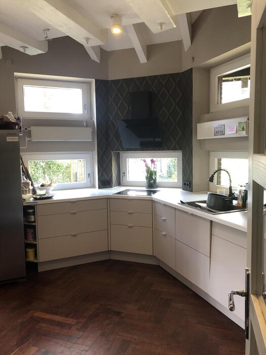 Unser Haus befindet sich an einem Wald- und Moorgrundstück in Hamburg-Altona. Es liegt sehr ruhig in zweiter Reihe mit einer Einfahrt, die von zwölf Ahornbäumen kugelförmig gesäumt wird. Es ist ein Architektenhaus, gebaut 1984 und hat in jedem Zimmer ca. 200 Jahre alte Balken. Der Boden mit Teakholz ausgelegt und sehr robust. Das Holz hat eine braun-rötliche Farbe. Das Haus ist anthroposophisch nach Rudolf Steiner gebaut, kein Raum ist rechtwinklig. In der Mitte des Hauses befindet sich ein großer Kamin. Das Haus wurde im Mai 2017 komplett renoviert, sowie die Küche, alle Bäder, alle Wände.